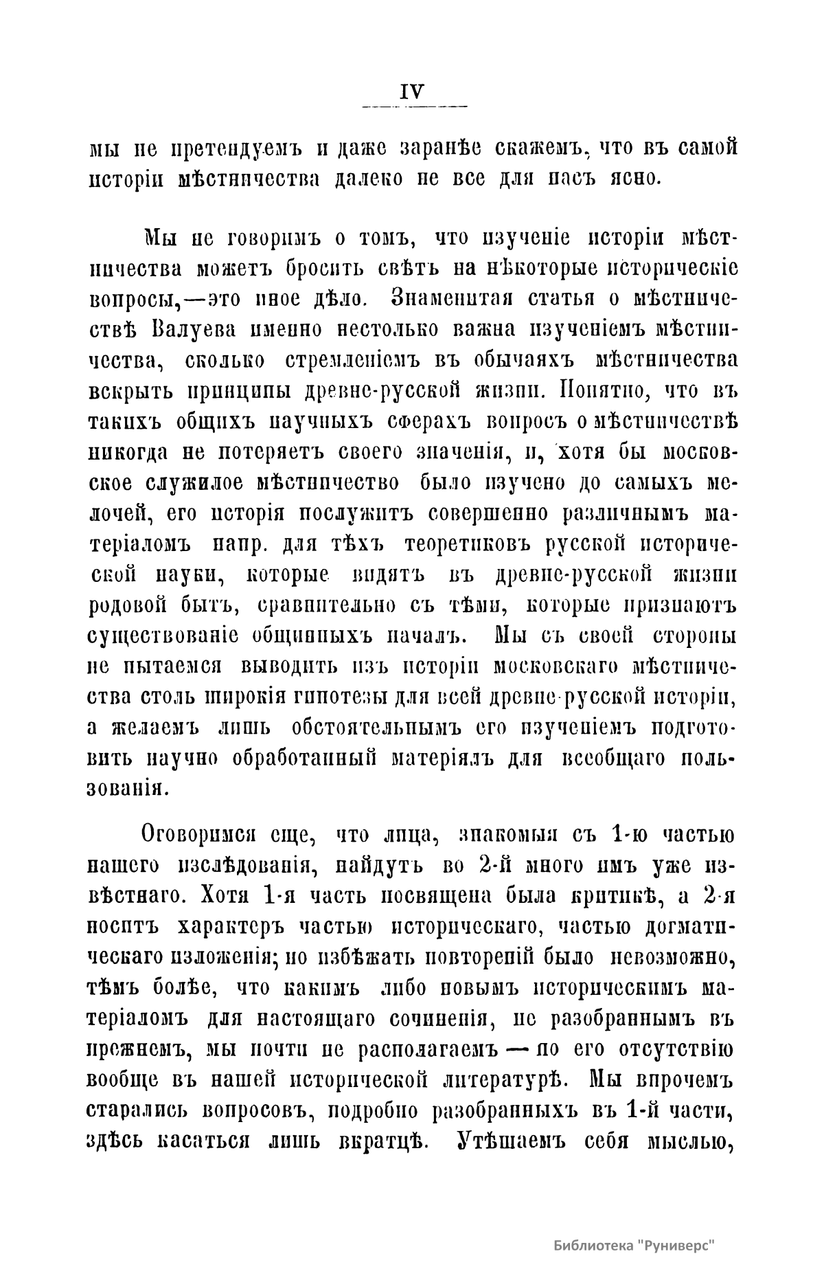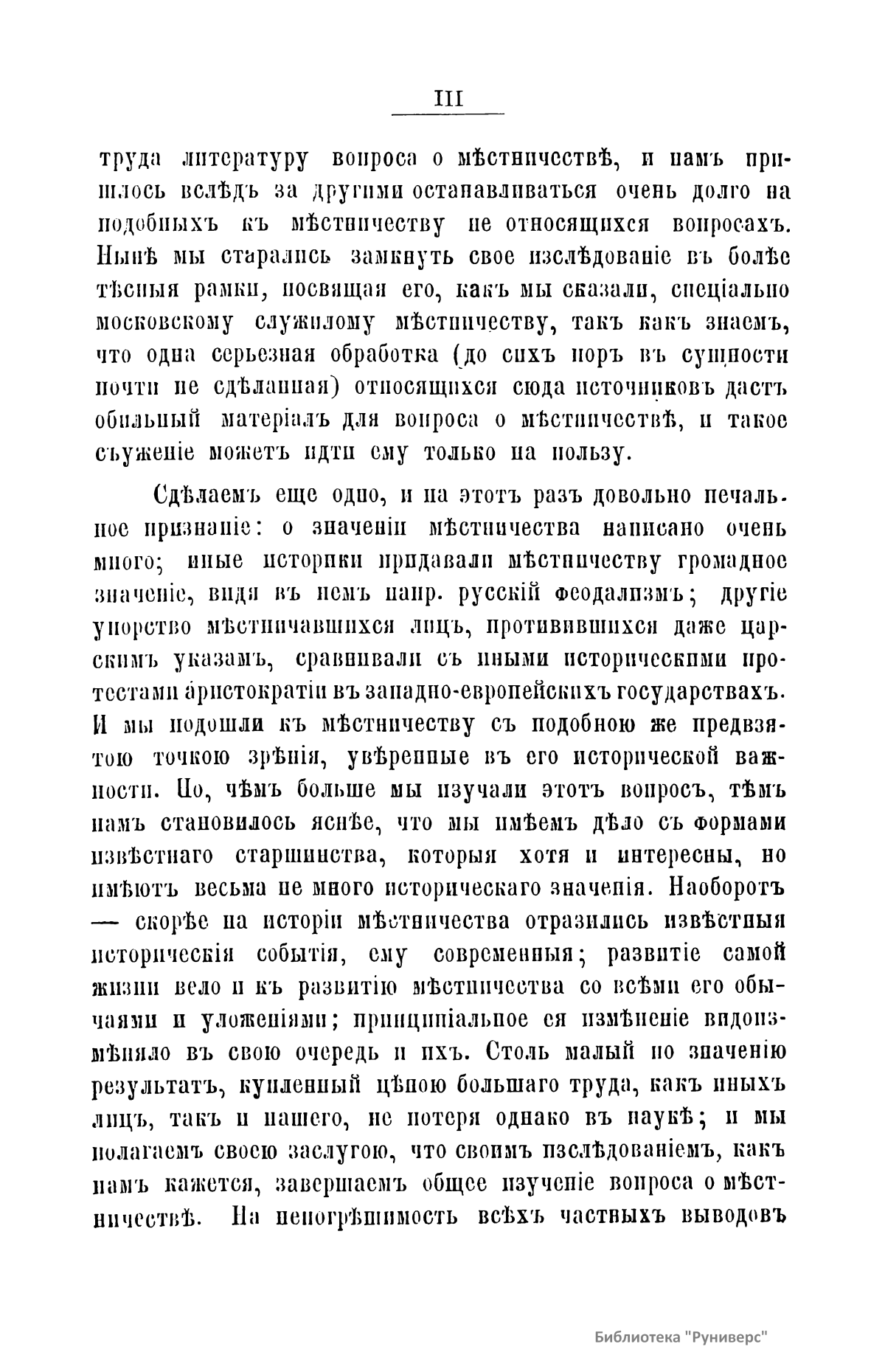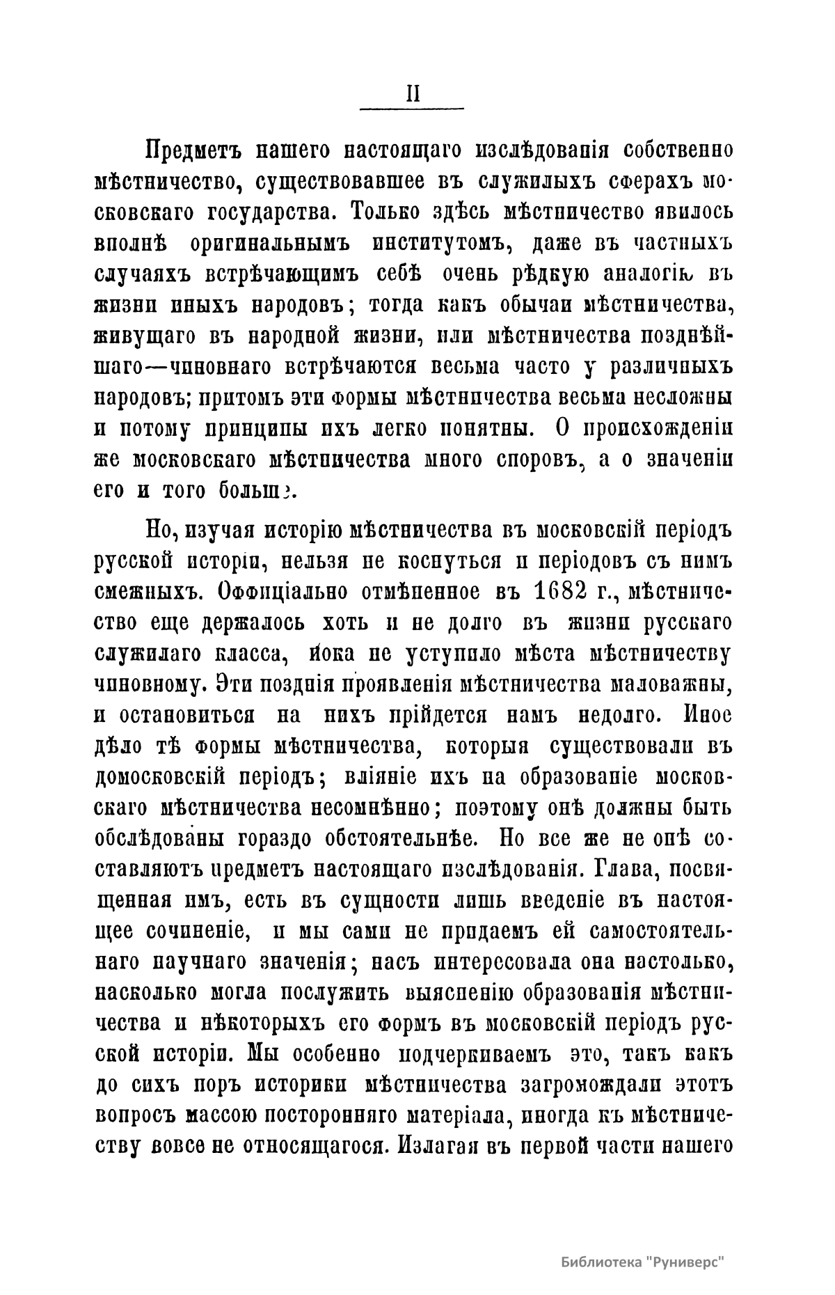 Предмет настоящего исследования – собственно местничество, существовавшее в служилых сферах Московского государства. Здесь местничество явилось вполне оригинальным институтом, даже в частных случаях встречающим себе очень редкую аналогию в жизни иных народов. Начиная изучение вопроса, автор был уверен в исторической важности местничества. Но чем более он изучал этот вопрос, тем ему становилось яснее, что он имеет дело с формами известного старшинства, которые хотя и интересны, но имеют весьма немного исторического значения. Но автор уверен, что столь малый по значению результат, купленный ценой большого труда, не является потерей в науке. Местничество – система иерархии в Русском государстве в 15-17 вв. Название произошло от обычая считаться «местами» на службе и за государевым столом. Тот, кто считал свое происхождение более древним, благородным и знатным либо личные свои заслуги значительными, занимал место ближе к царю и, соответственно, претендовал на более высокую должность в войске или в гражданской администрации. Было ликвидировано решением земского собора 1682 г.