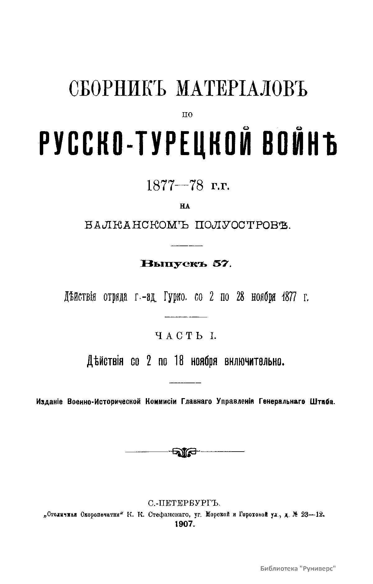 Сборникъ матерiаловъ по русско-турецкой войнѣ 1877-1878 г.г. на Балканскомъ полуостровѣ. Выпускъ 57. Дѣйствiя отряда г.-ад. Гурко со 2 по 28 ноября 1877 г. Часть I. Дѣйствiя со 2 по 18 ноября включительно