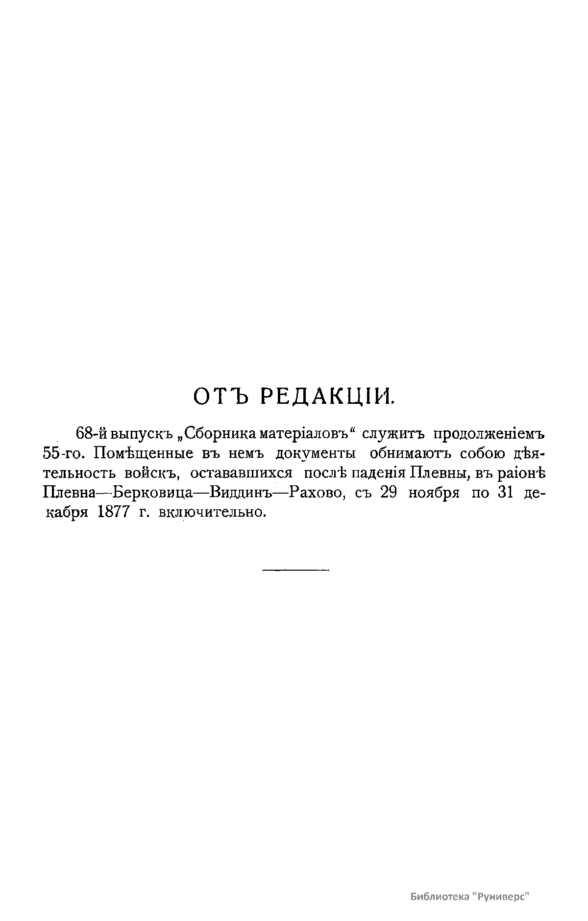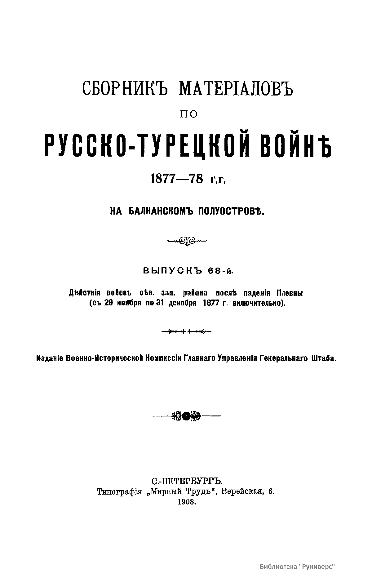 Сборникъ матерiаловъ по русско-турецкой войнѣ 1877-1878 г.г. на Балканскомъ полуостровѣ. Выпускъ 68. Дѣйствiя войскъ сѣв. зап. района послѣ паденiя Плевны (съ 29 ноября по 31 декабря 1877 г. включительно)