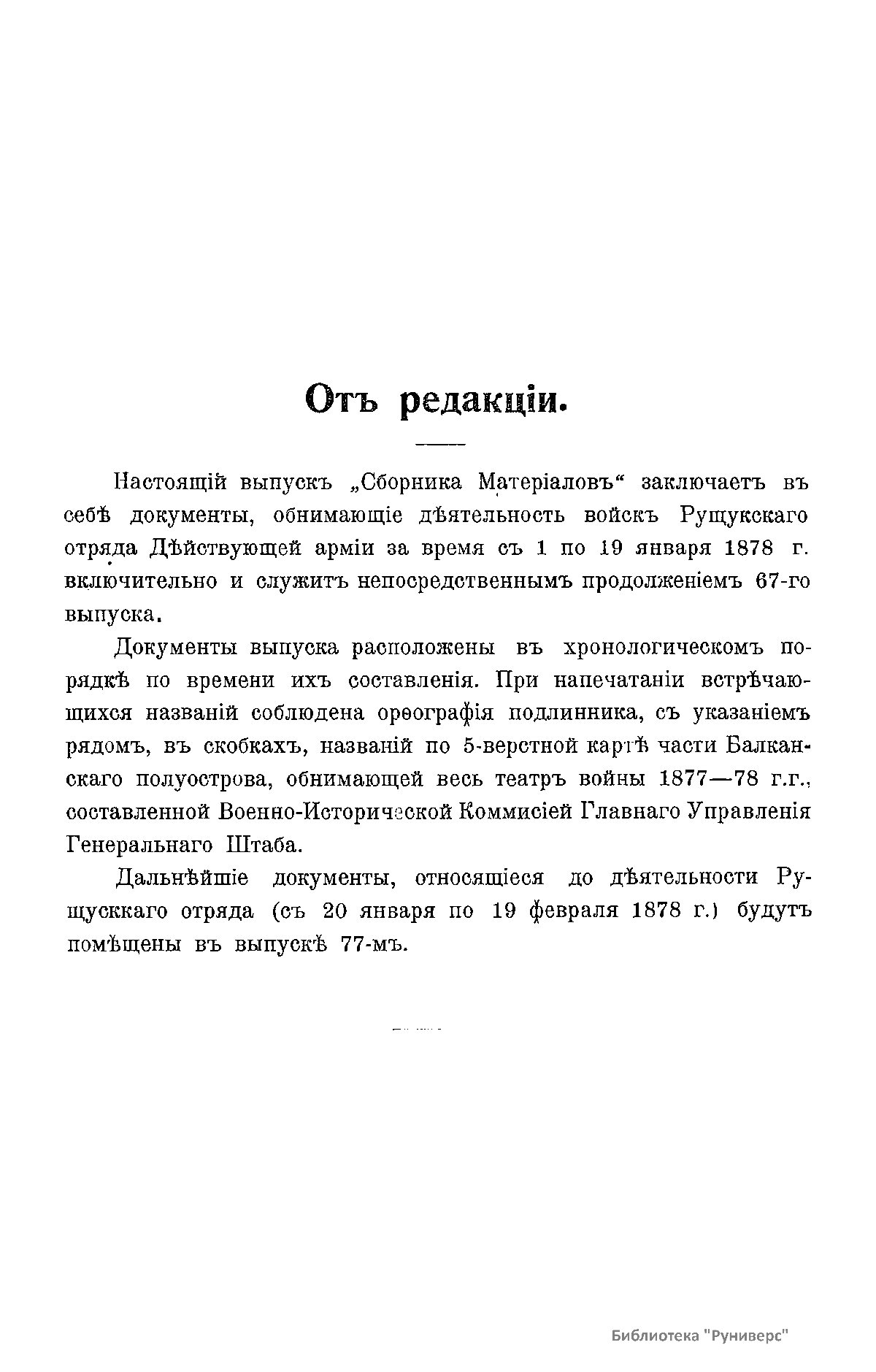 Военно-историческая комиссия Генерального штаба представляет сборник материалов по русско-турецкой войне 1877 – 1878 гг. на Балканском полуострове в 97 выпусках. Издание формирует полное представление о военных действиях и участниках этой войны. Русско-турецкая война 1877 – 1878 гг. была вызвана нежеланием Турции принять меры к улучшению положения подвластных ей христианских княжеств, обусловленному парижским трактатом 1856 г, и стремлением России укрепить свое влияние на Балканах. Способствовала освобождению народов Балканского полуострова от османского владычества. Россия объявила войну Турции 12 апреля 1877 г. Основные события: 1877 – сражение на Шипке, осада и взятие русскими войсками Плевны и Карса; 1878 – зимний переход русской армии через Балканский хребет, победы у Шипки – Шейново, Филиппополя, взятие Адрианополя. Завершилась Сан-Стефанским миром 1878 г., который обеспечил независимость балканским народам и территориальные приобретения России. Но Берлинский трактат ограничил независимость Болгарии и влияние России на Балканах.