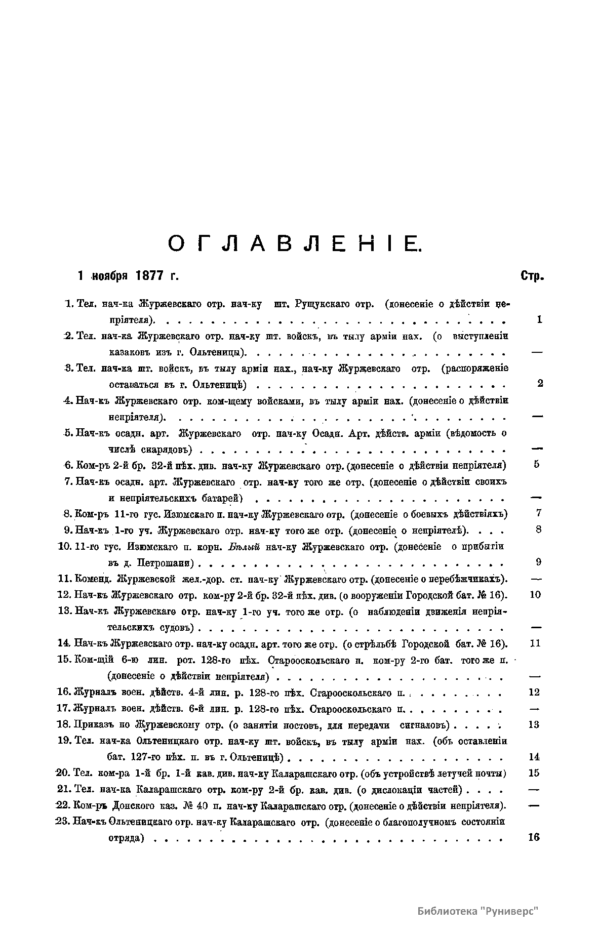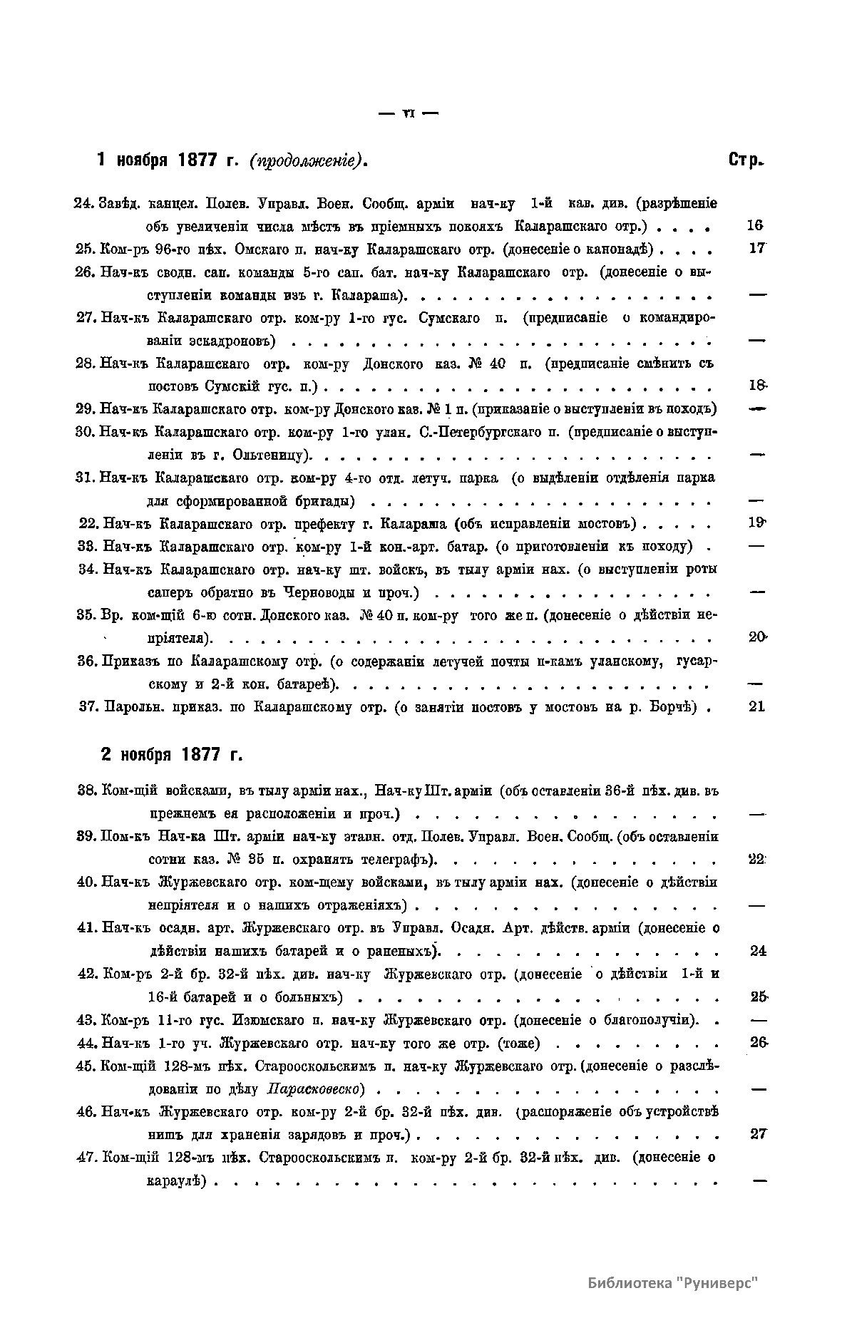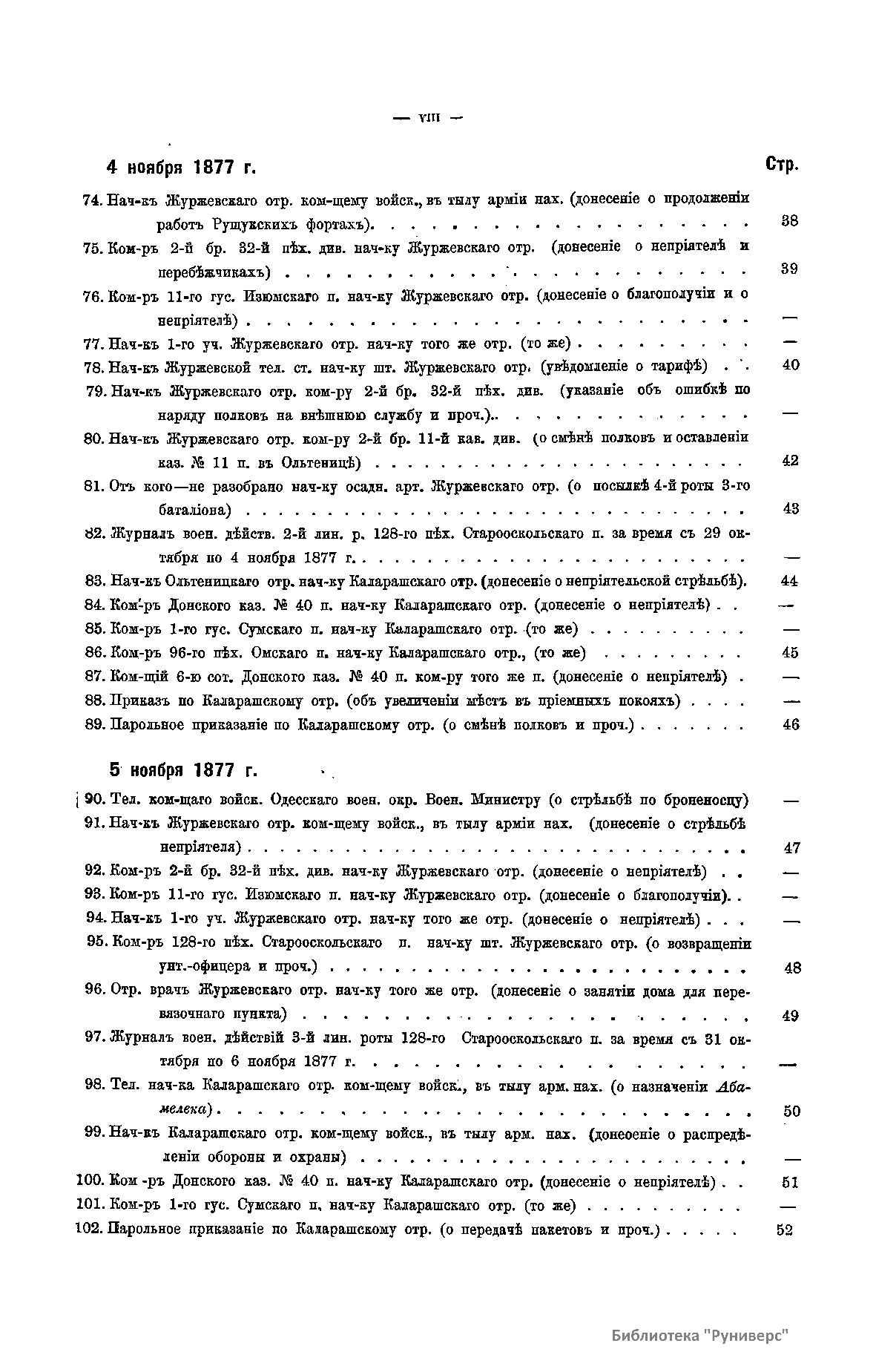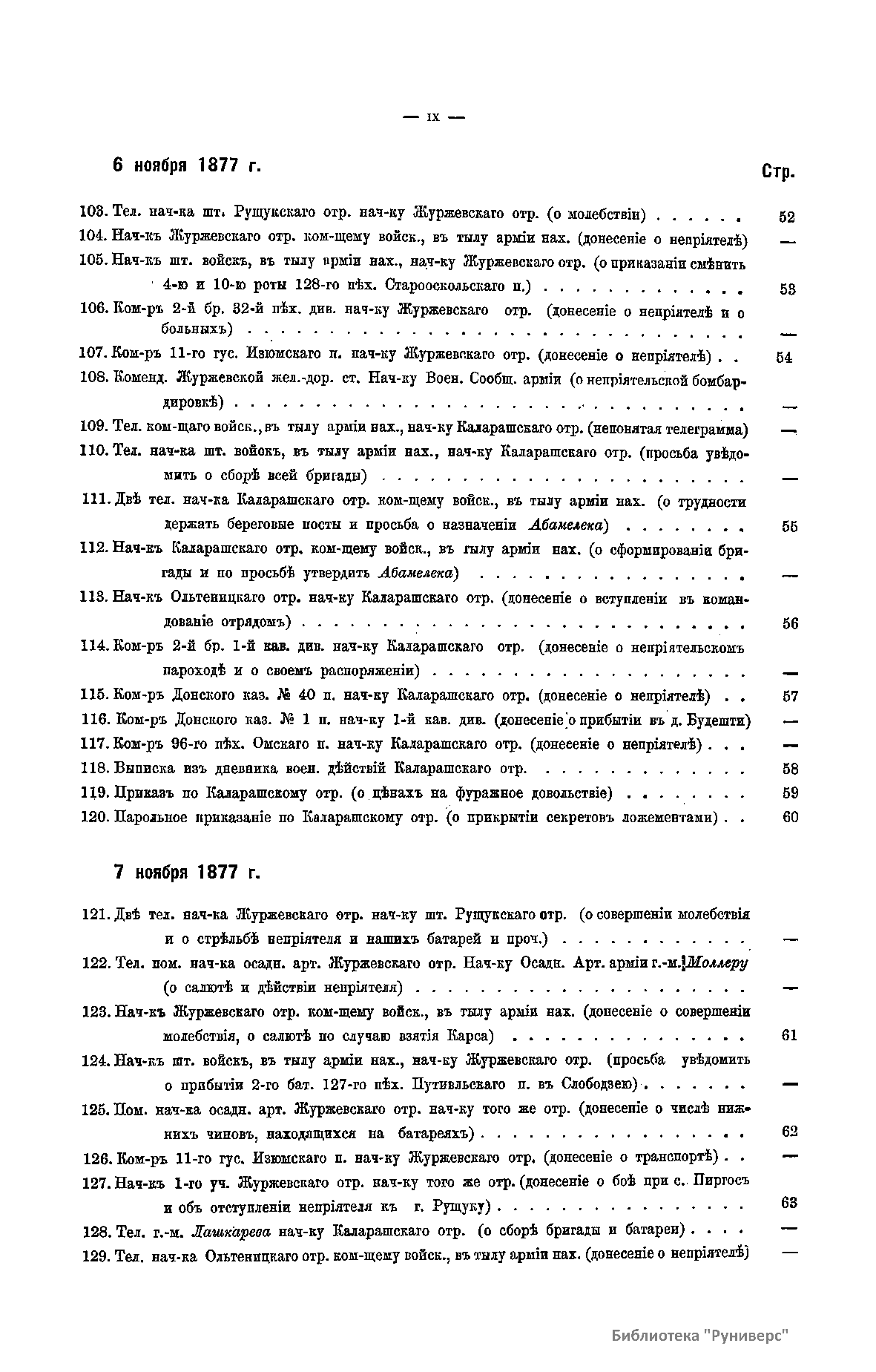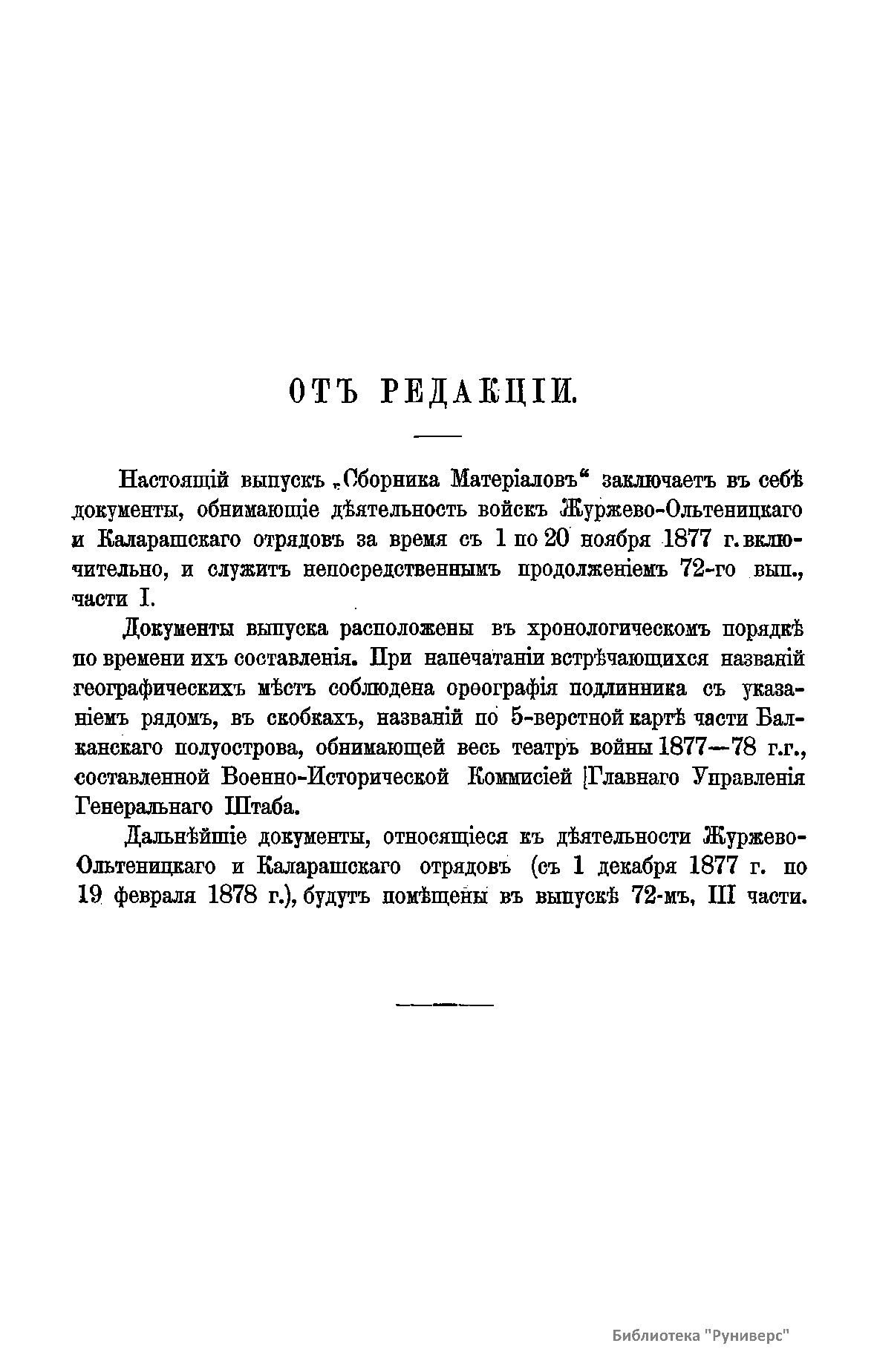 Военно-историческая комиссия Генерального штаба представляет сборник материалов по русско-турецкой войне 1877 – 1878 гг. на Балканском полуострове в 97 выпусках. Издание формирует полное представление о военных действиях и участниках этой войны. Русско-турецкая война 1877 – 1878 гг. была вызвана нежеланием Турции принять меры к улучшению положения подвластных ей христианских княжеств, обусловленному парижским трактатом 1856 г, и стремлением России укрепить свое влияние на Балканах. Способствовала освобождению народов Балканского полуострова от османского владычества. Россия объявила войну Турции 12 апреля 1877 г. Основные события: 1877 – сражение на Шипке, осада и взятие русскими войсками Плевны и Карса; 1878 – зимний переход русской армии через Балканский хребет, победы у Шипки – Шейново, Филиппополя, взятие Адрианополя. Завершилась Сан-Стефанским миром 1878 г., который обеспечил независимость балканским народам и территориальные приобретения России. Но Берлинский трактат ограничил независимость Болгарии и влияние России на Балканах.
