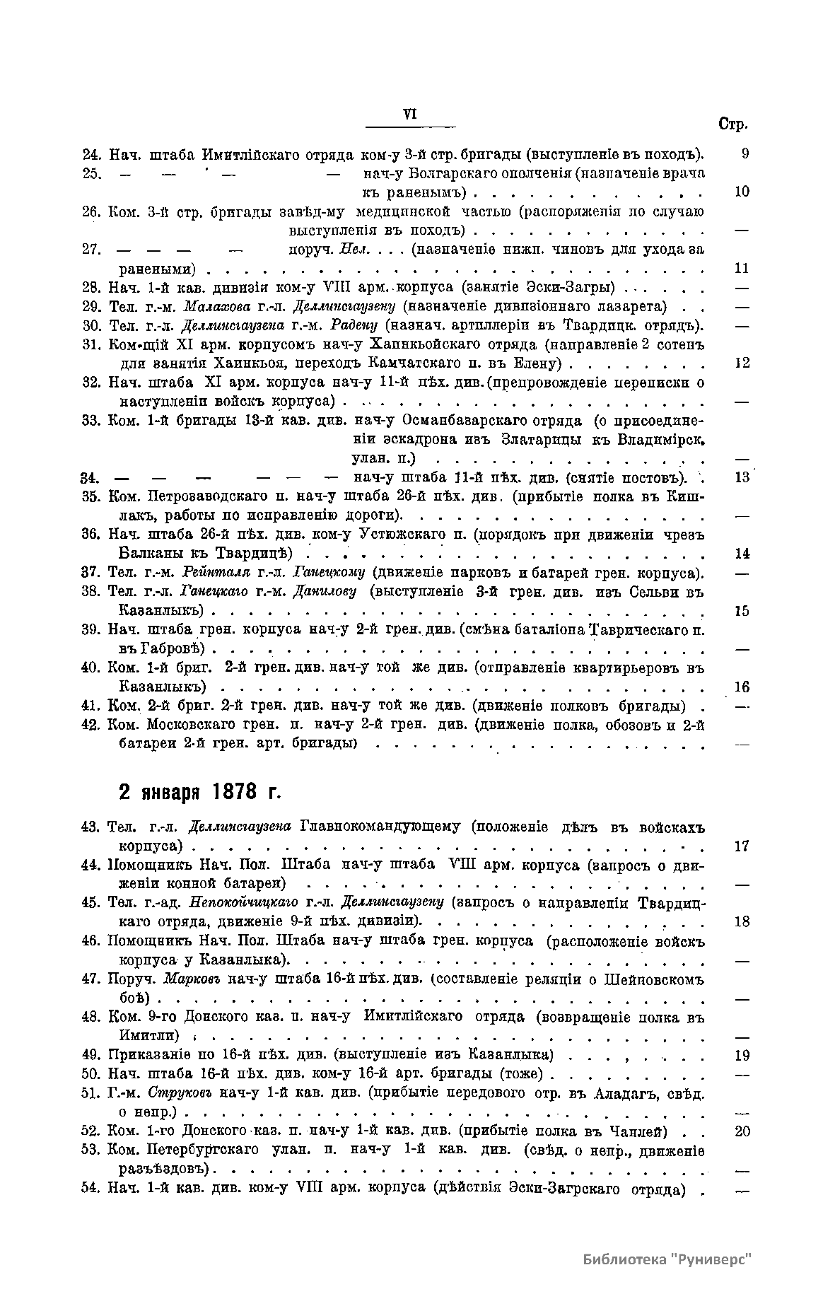 Военно-историческая комиссия Генерального штаба представляет сборник материалов по русско-турецкой войне 1877 – 1878 гг. на Балканском полуострове в 97 выпусках. Издание формирует полное представление о военных действиях и участниках этой войны. Русско-турецкая война 1877 – 1878 гг. была вызвана нежеланием Турции принять меры к улучшению положения подвластных ей христианских княжеств, обусловленному парижским трактатом 1856 г, и стремлением России укрепить свое влияние на Балканах. Способствовала освобождению народов Балканского полуострова от османского владычества. Россия объявила войну Турции 12 апреля 1877 г. Основные события: 1877 – сражение на Шипке, осада и взятие русскими войсками Плевны и Карса; 1878 – зимний переход русской армии через Балканский хребет, победы у Шипки – Шейново, Филиппополя, взятие Адрианополя. Завершилась Сан-Стефанским миром 1878 г., который обеспечил независимость балканским народам и территориальные приобретения России. Но Берлинский трактат ограничил независимость Болгарии и влияние России на Балканах.