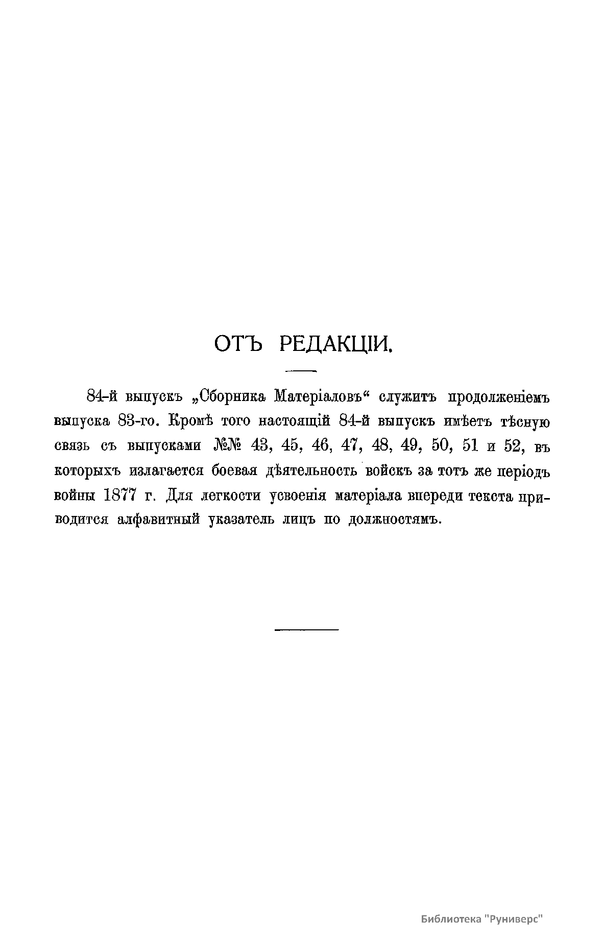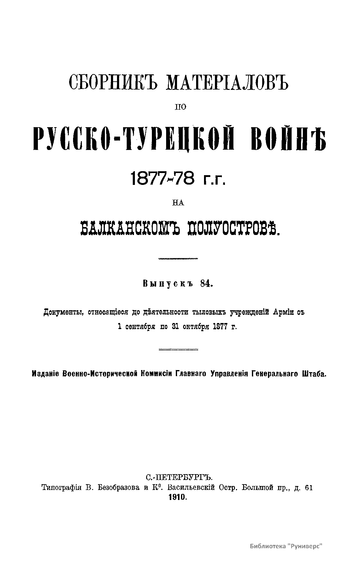 Сборникъ матерiаловъ по русско-турецкой войнѣ 1877-1878 г.г. на Балканскомъ полуостровѣ. Выпускъ 84. Документы, относящiеся до дѣятельности тыловыхъ учрежденiй Армiи съ 1 сентября по 31 октября 1877 г.