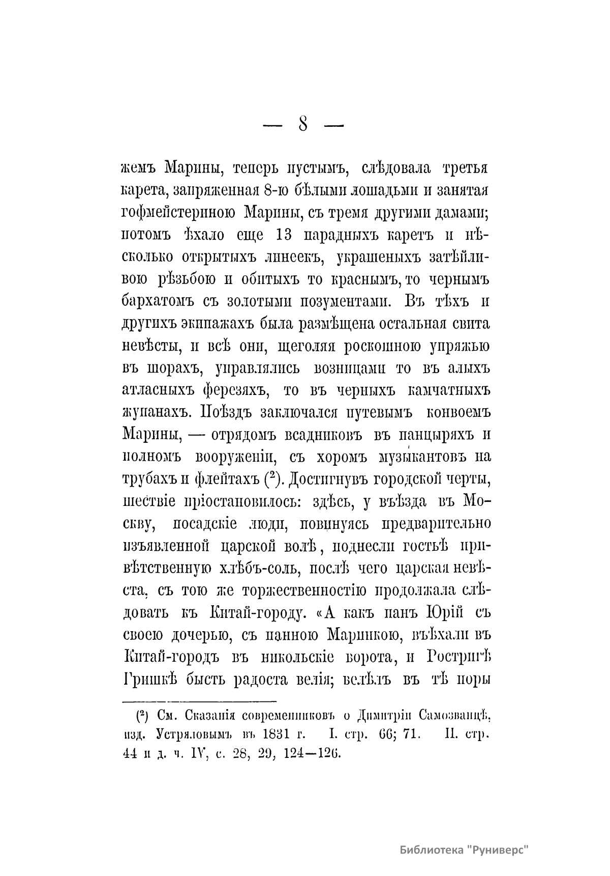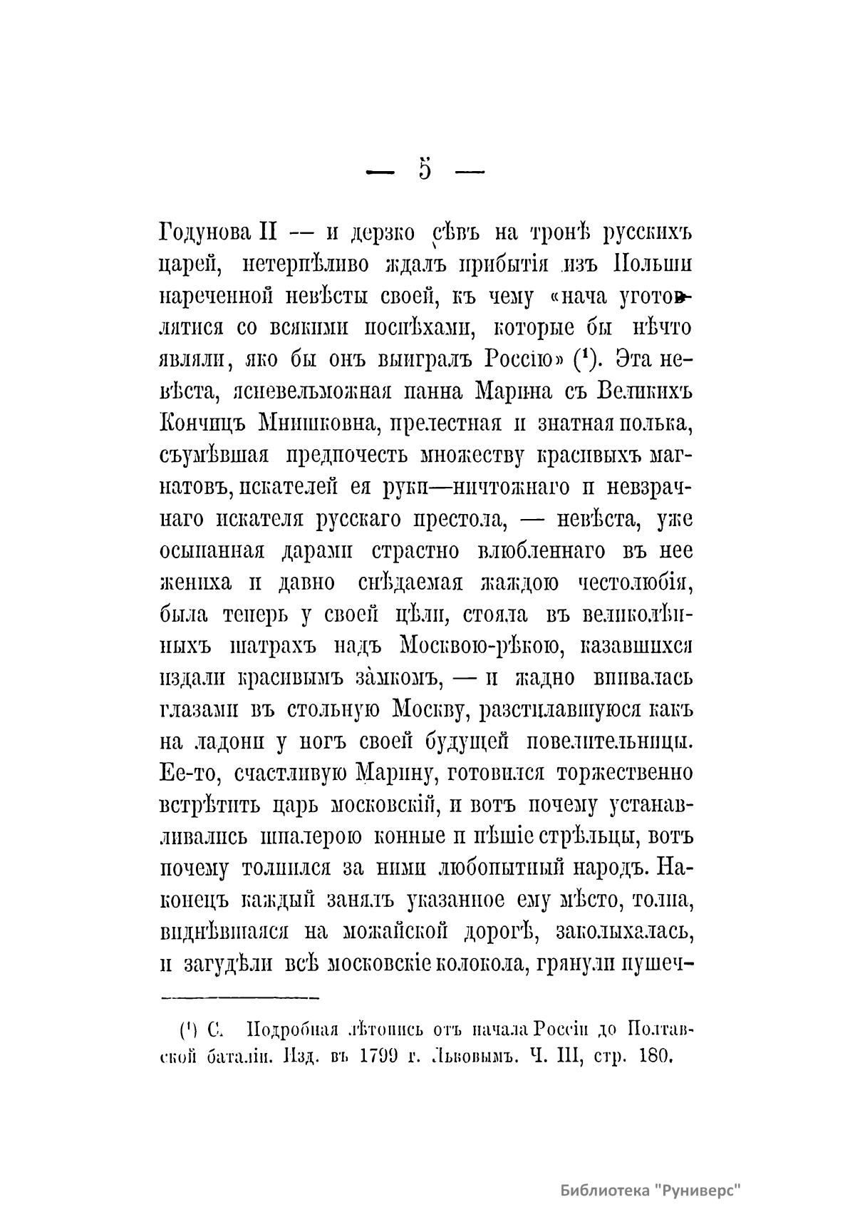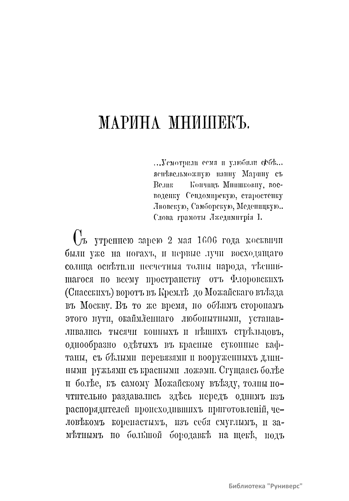 Популярное изложение истории жизни Марины Мнишек. Марина Мнишек (ок. 1688 – 1614) – дочь польского воеводы Ежи Мнишека, одного из организаторов интервенции против России в начале 17 в. Заключила брак с самозванцем Лжедмитрием I. В мае 1606 г. короновалась в Москве. За отказ от царского титула (после гибели Лжедмитрия I) в июле 1608 г. отпущена на родину, но оказалась в Тушине, где признала Лжедмитрия II «спасшимся» мужем. После его смерти в декабре 1610 г. Мнишек нашла покровителя в лице атамана И.М. Заруцкого, который пытался поддержать кандидатуру ее сына Ивана, родившегося в январе 1611 г., на русский престол. Вместе с Заруцким и сыном бежала в Астрахань, а затем на Урал, на р. Яик, где они были выданы казаками русскому правительству. Заруцкий и сын Мнишек были казнены в Москве, а Марина умерла в заточении.