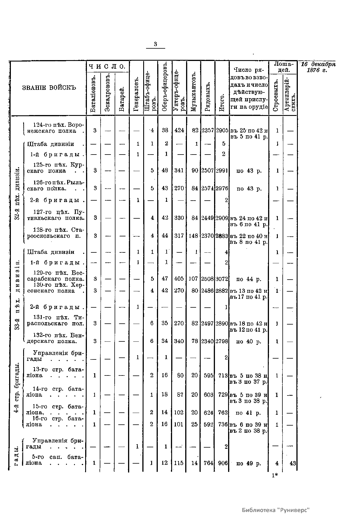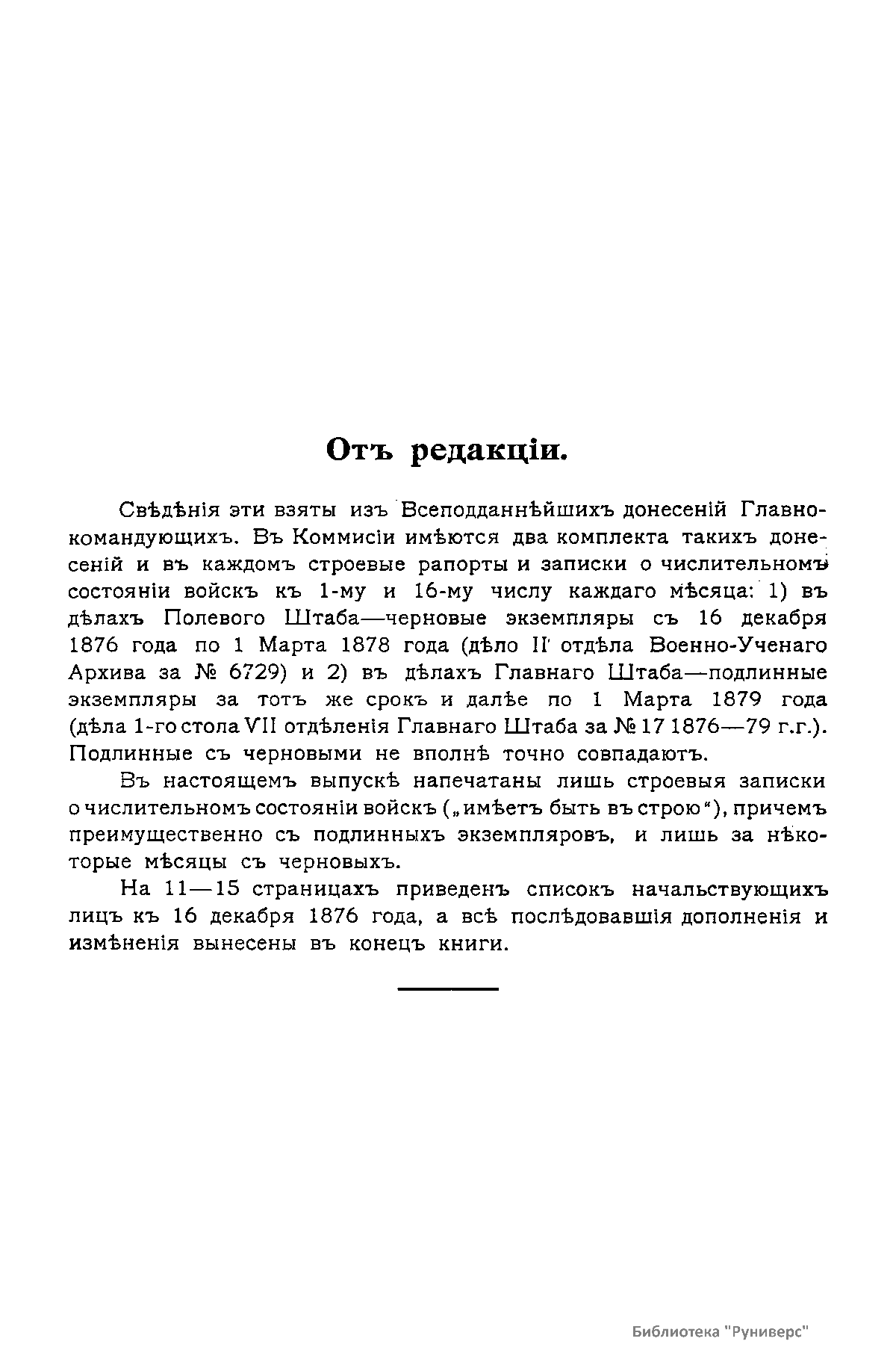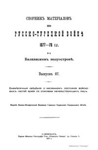 Сборникъ матерiаловъ по русско-турецкой войнѣ 1877-1878 г.г. на Балканскомъ полуостровѣ. Выпускъ 87. Ежемѣсячныя свѣдѣнiя о численномъ состоянiи восковыхъ частей армiи со списками начальствующихъ лицъ