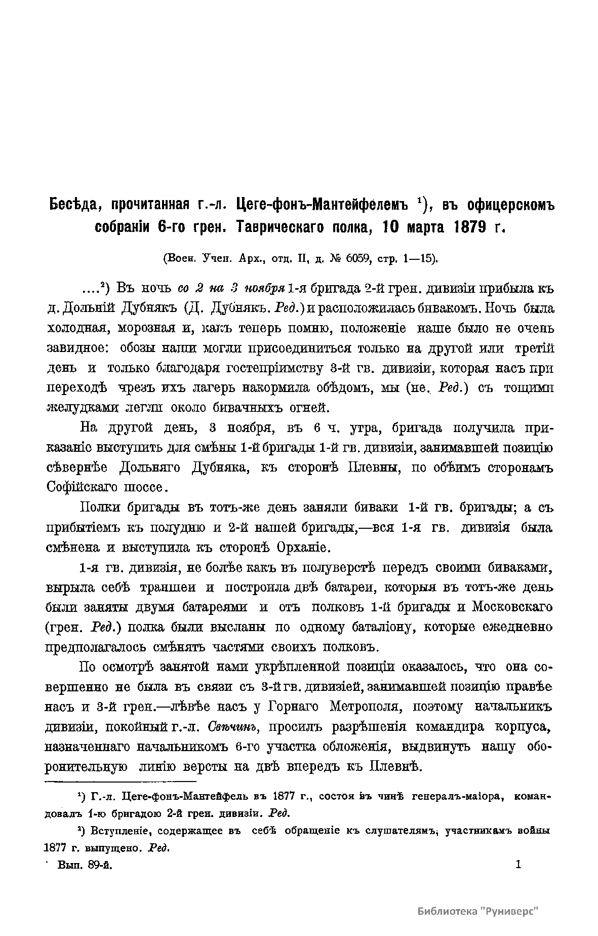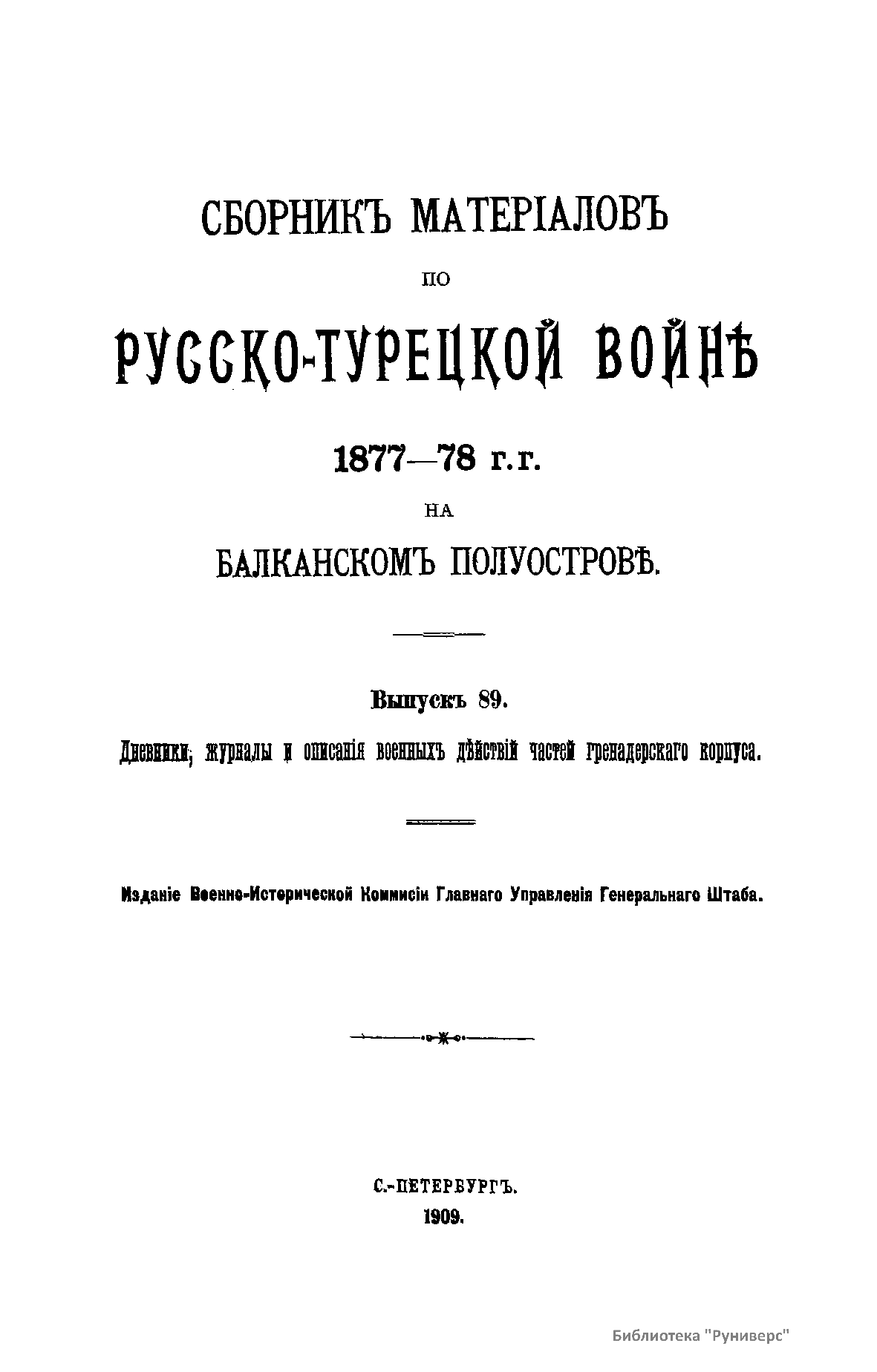 Сборникъ матерiаловъ по русско-турецкой войнѣ 1877-1878 г.г. на Балканскомъ полуостровѣ. Выпускъ 89. Дневники, журналы и описанiя военныхъ дѣйствия частей гренадерскаго корпуса