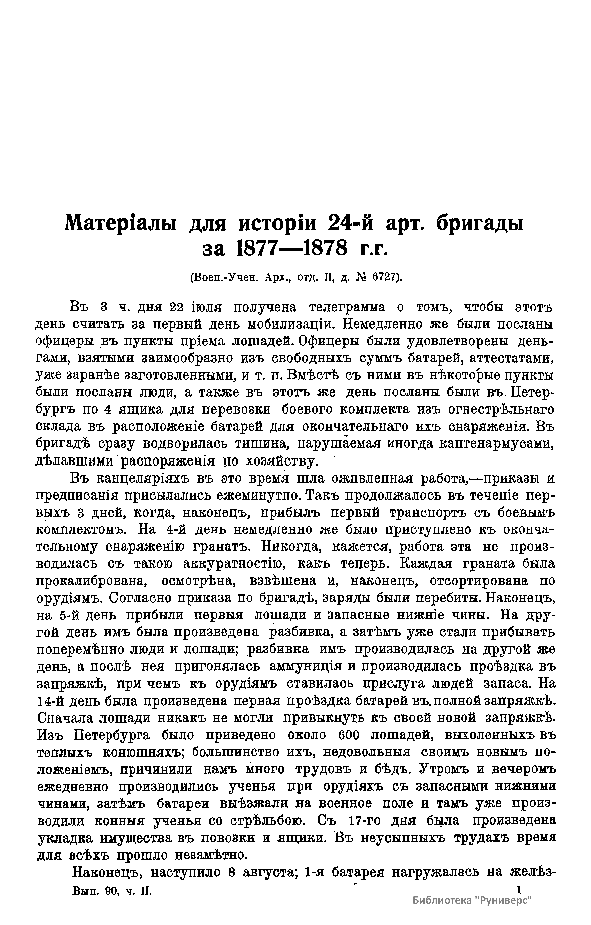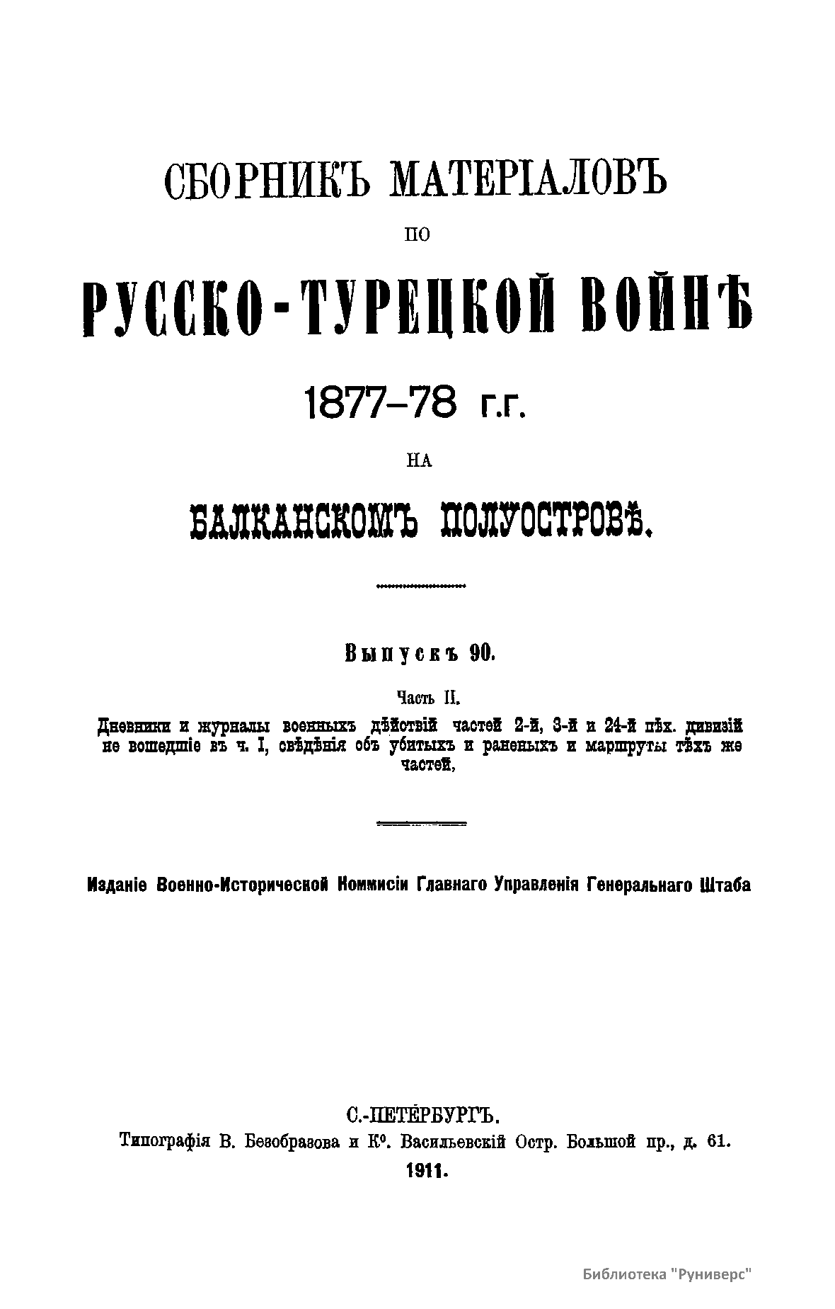 Сборникъ матерiаловъ по русско-турецкой войнѣ 1877-1878 г.г. на Балканскомъ полуостровѣ. Выпускъ 90. Часть I. Дневники и журналы военныхъ дѣйствiй частей 2-й, 3-й и 24-й пѣх. дивизiй не вошедшiе въ ч. I, свѣдѣнiя об убитыхъ и раненыхъ и маршруты тѣхъ же частей