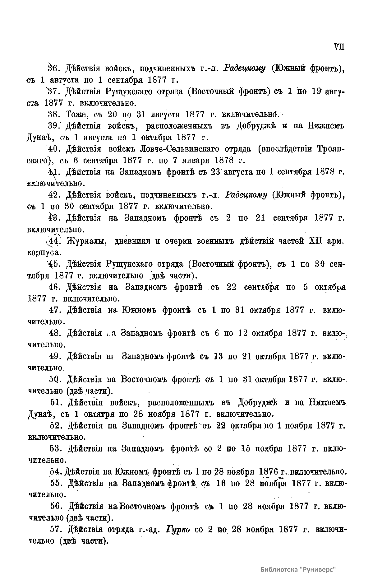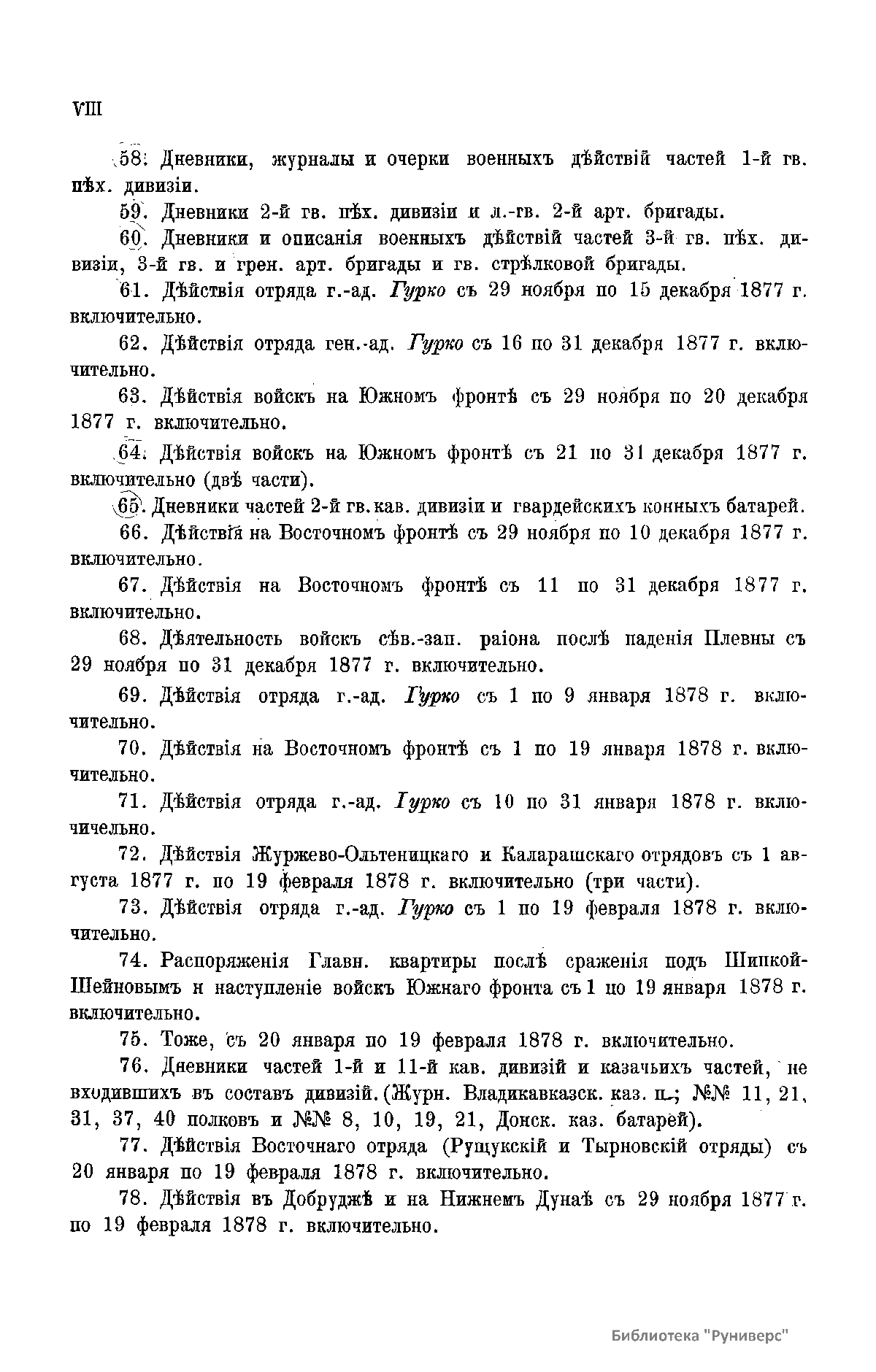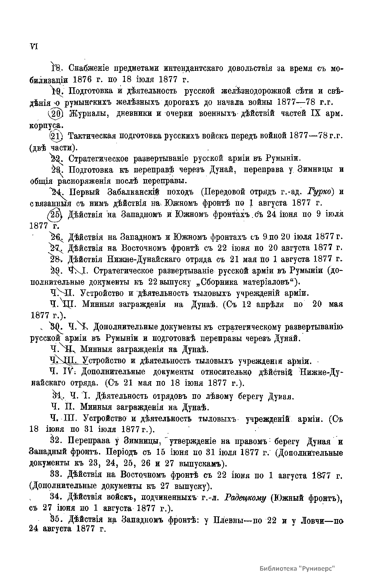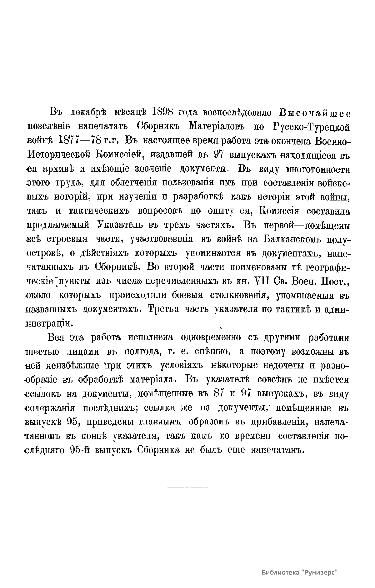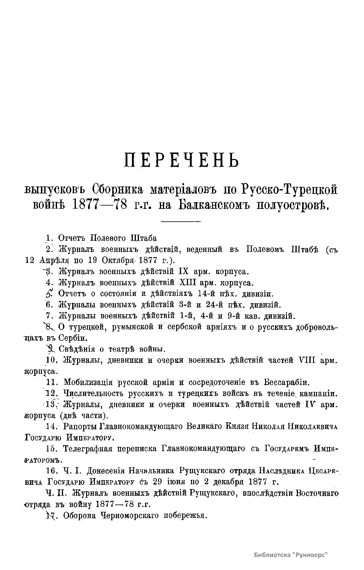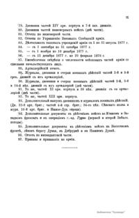Военно-историческая комиссия Генерального штаба представляет сборник материалов по русско-турецкой войне 1877 – 1878 гг. на Балканском полуострове в 97 выпусках. Издание формирует полное представление о военных действиях и участниках этой войны. Русско-турецкая война 1877 – 1878 гг. была вызвана нежеланием Турции принять меры к улучшению положения подвластных ей христианских княжеств, обусловленному парижским трактатом 1856 г, и стремлением России укрепить свое влияние на Балканах. Способствовала освобождению народов Балканского полуострова от османского владычества. Россия объявила войну Турции 12 апреля 1877 г. Основные события: 1877 – сражение на Шипке, осада и взятие русскими войсками Плевны и Карса; 1878 – зимний переход русской армии через Балканский хребет, победы у Шипки – Шейново, Филиппополя, взятие Адрианополя. Завершилась Сан-Стефанским миром 1878 г., который обеспечил независимость балканским народам и территориальные приобретения России. Но Берлинский трактат ограничил независимость Болгарии и влияние России на Балканах.