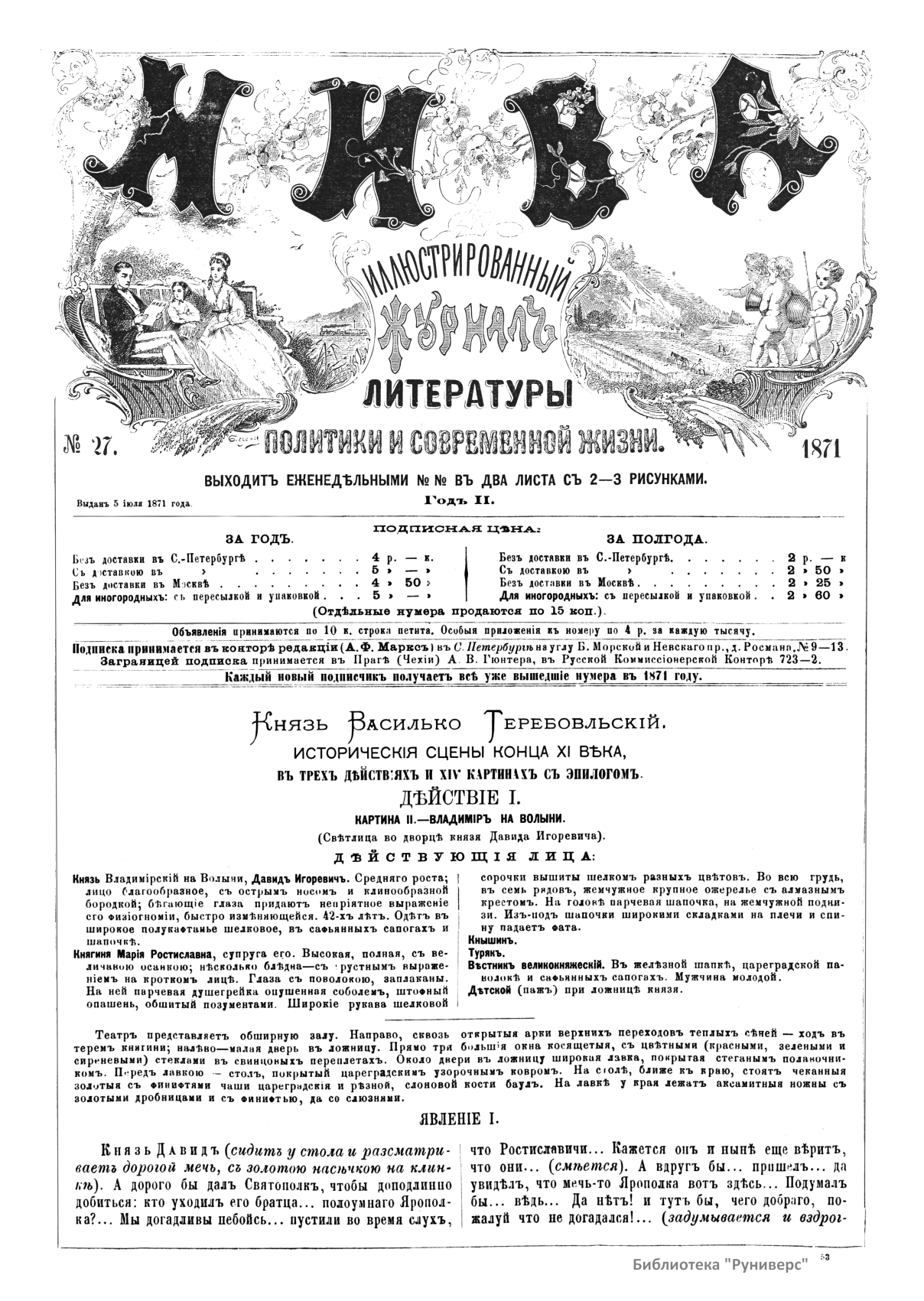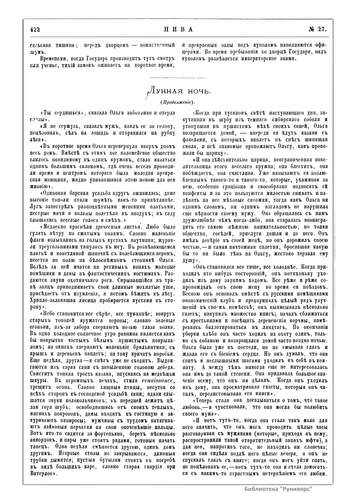 «Нива» — популярный еженедельный русский журнал с приложениями, издававшийся со второй половины XIX до начала XX века, носил подзаголовок «Журнал литературы, политики и современной жизни». Журнал был любимым детищем А. Ф. Маркса, возглавлявшего свое издательство вплоть до своей смерти в 1904 г. Позиционировалась «Нива» как иллюстрированный журнал для семейного чтения и был ориентирован, главным образом, на обывателя. В журнале публиковались литературные произведения, исторические, научно-популярные очерки, репродукции и гравюры картин современных художников. Материалы политического и общественного содержания также сопровождались многочисленными иллюстрациями. Среди известных литераторов, печатавшихся в журнале, были А. К. Толстой, Ф. И. Тютчев, Л. Н. Толстой, А. А. Фет, А. П. Чехов, Максим Горький, Корней Чуковский, Анна Ахматова, Иван Бунин и многие другие. Благодаря «Ниве» сочинения многих современных авторов добрались до самых отдаленных областей России.