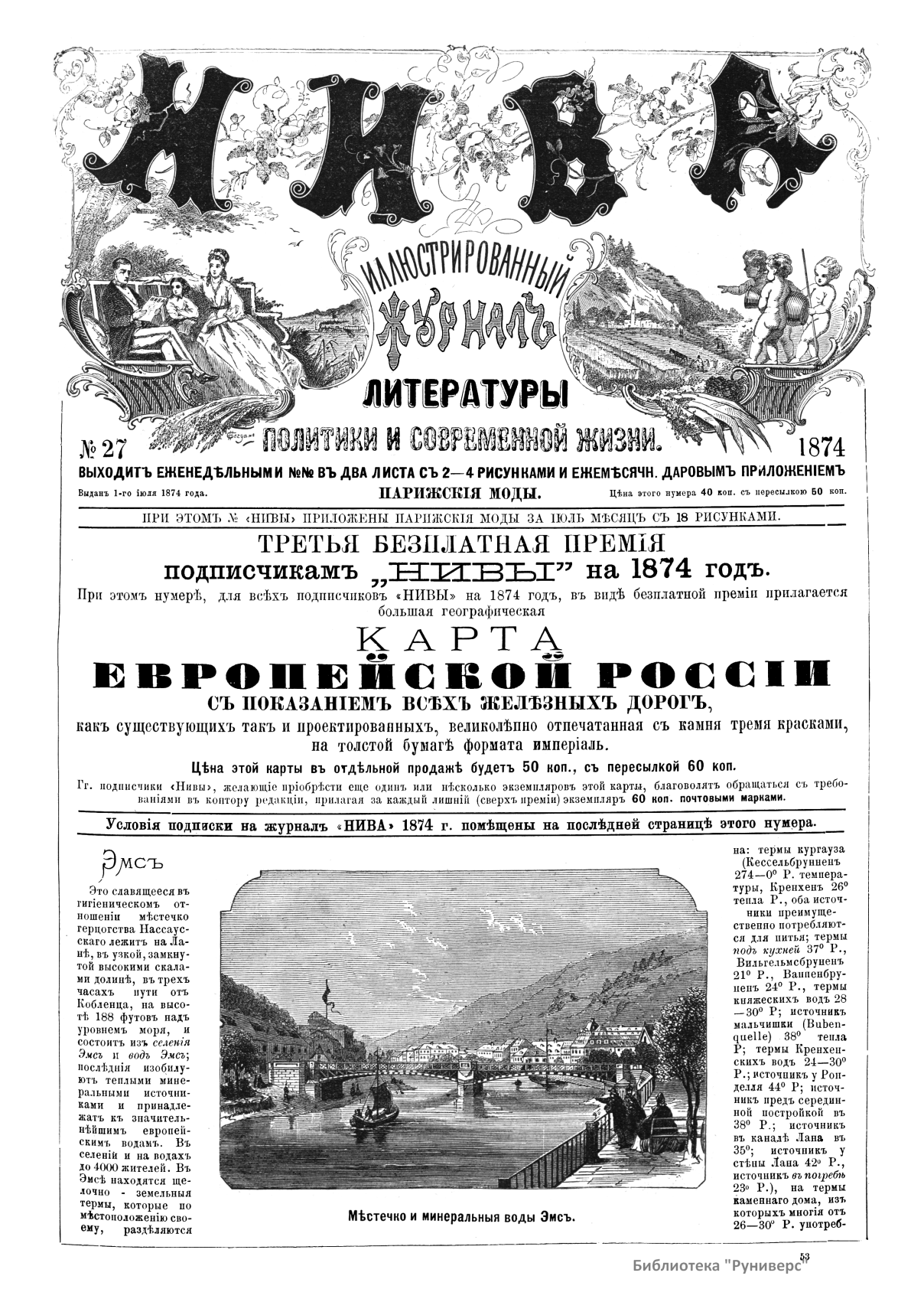 «Нива» — популярный еженедельный русский журнал с приложениями, издававшийся со второй половины XIX до начала XX века, носил подзаголовок «Журнал литературы, политики и современной жизни». Журнал был любимым детищем А. Ф. Маркса, возглавлявшего свое издательство вплоть до своей смерти в 1904 г. Позиционировалась «Нива» как иллюстрированный журнал для семейного чтения и был ориентирован, главным образом, на обывателя. В журнале публиковались литературные произведения, исторические, научно-популярные очерки, репродукции и гравюры картин современных художников. Материалы политического и общественного содержания также сопровождались многочисленными иллюстрациями. Среди известных литераторов, печатавшихся в журнале, были А. К. Толстой, Ф. И. Тютчев, Л. Н. Толстой, А. А. Фет, А. П. Чехов, Максим Горький, Корней Чуковский, Анна Ахматова, Иван Бунин и многие другие. Благодаря «Ниве» сочинения многих современных авторов добрались до самых отдаленных областей России.