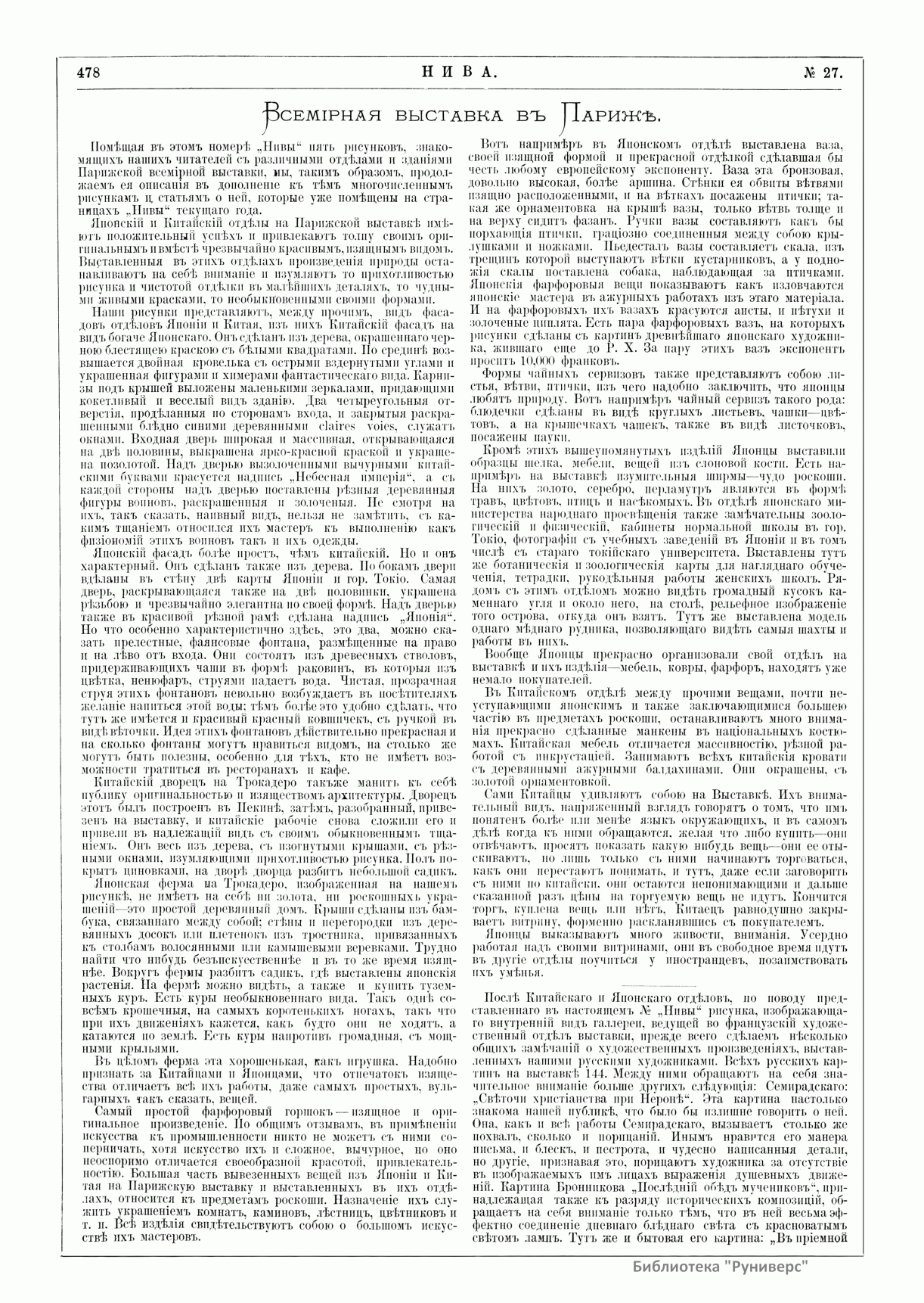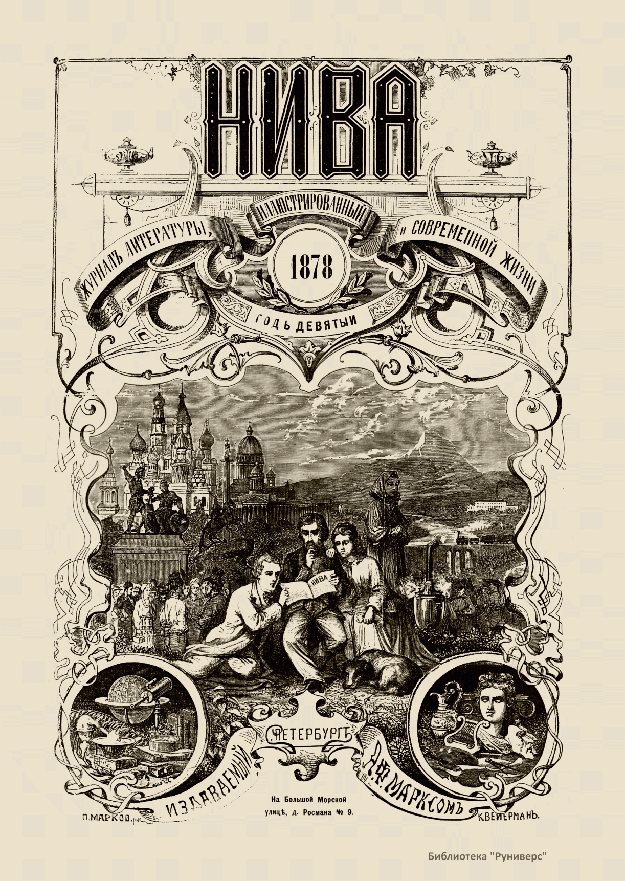 «Нива» — популярный еженедельный русский журнал с приложениями, издававшийся со второй половины XIX до начала XX века, носил подзаголовок «Журнал литературы, политики и современной жизни». Журнал был любимым детищем А. Ф. Маркса, возглавлявшего свое издательство вплоть до своей смерти в 1904 г. Позиционировалась «Нива» как иллюстрированный журнал для семейного чтения и был ориентирован, главным образом, на обывателя. В журнале публиковались литературные произведения, исторические, научно-популярные очерки, репродукции и гравюры картин современных художников. Материалы политического и общественного содержания также сопровождались многочисленными иллюстрациями. Среди известных литераторов, печатавшихся в журнале, были А. К. Толстой, Ф. И. Тютчев, Л. Н. Толстой, А. А. Фет, А. П. Чехов, Максим Горький, Корней Чуковский, Анна Ахматова, Иван Бунин и многие другие. Благодаря «Ниве» сочинения многих современных авторов добрались до самых отдаленных областей России.
