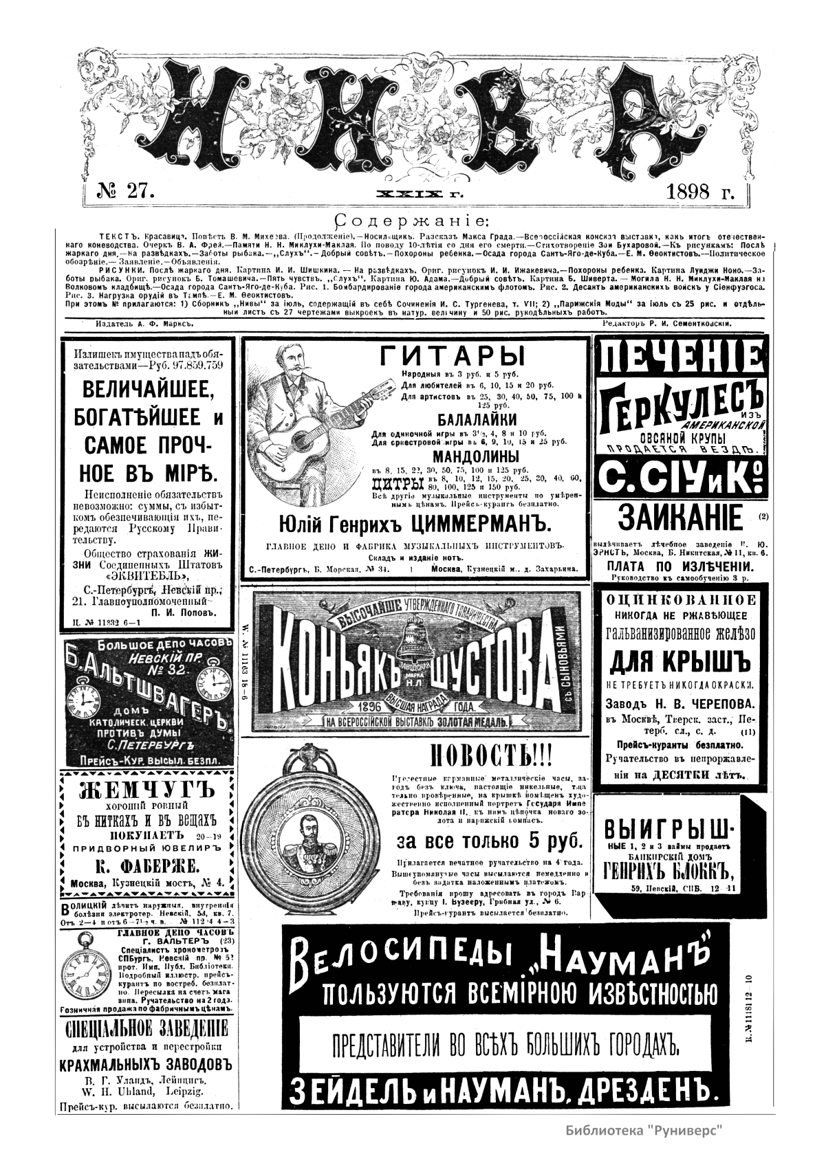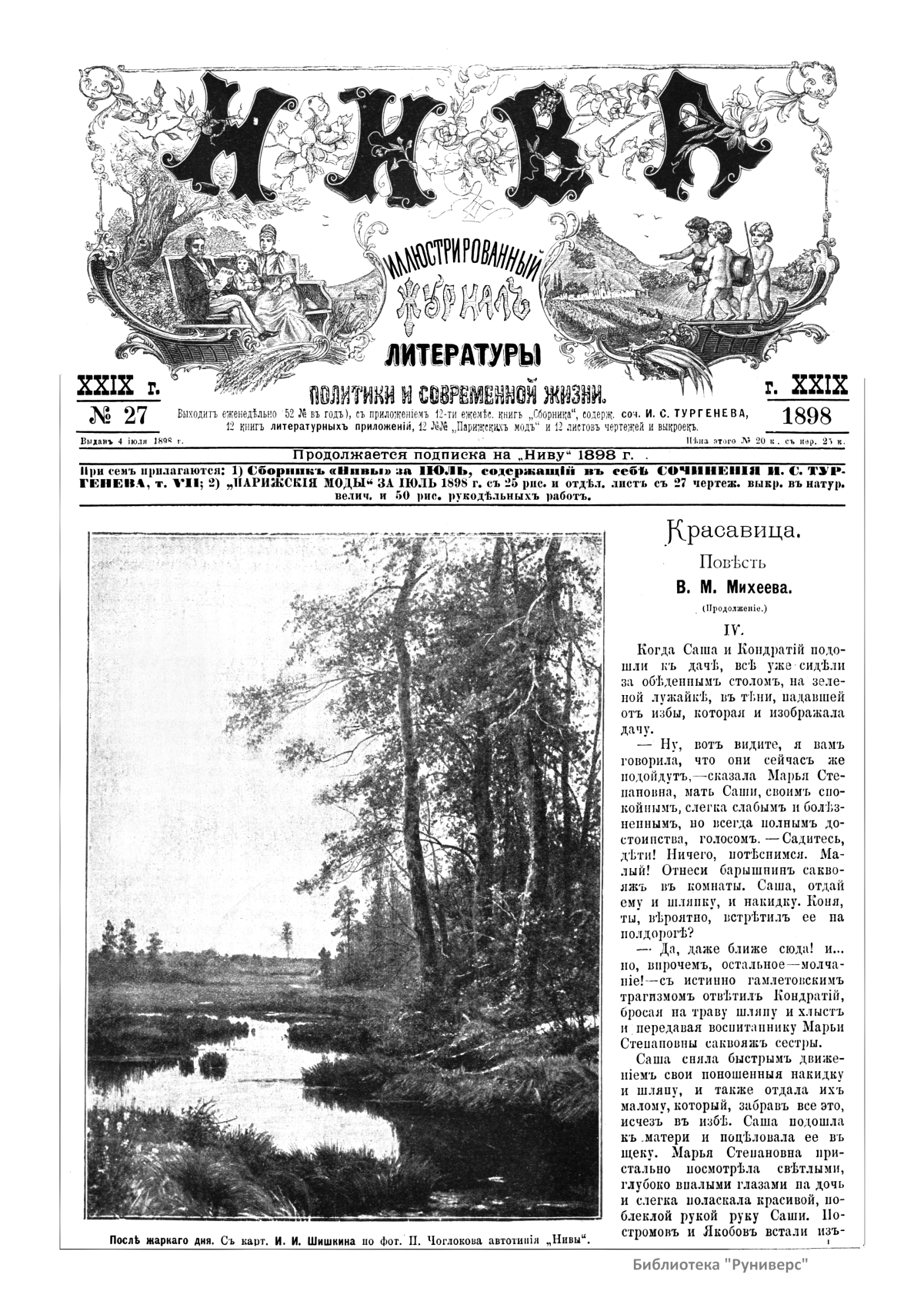 «Нива» — популярный еженедельный русский журнал с приложениями, издававшийся со второй половины XIX до начала XX века, носил подзаголовок «Журнал литературы, политики и современной жизни». Журнал был любимым детищем А. Ф. Маркса, возглавлявшего свое издательство вплоть до своей смерти в 1904 г. Позиционировалась «Нива» как иллюстрированный журнал для семейного чтения и был ориентирован, главным образом, на обывателя. В журнале публиковались литературные произведения, исторические, научно-популярные очерки, репродукции и гравюры картин современных художников. Материалы политического и общественного содержания также сопровождались многочисленными иллюстрациями. Среди известных литераторов, печатавшихся в журнале, были А. К. Толстой, Ф. И. Тютчев, Л. Н. Толстой, А. А. Фет, А. П. Чехов, Максим Горький, Корней Чуковский, Анна Ахматова, Иван Бунин и многие другие. Благодаря «Ниве» сочинения многих современных авторов добрались до самых отдаленных областей России.
