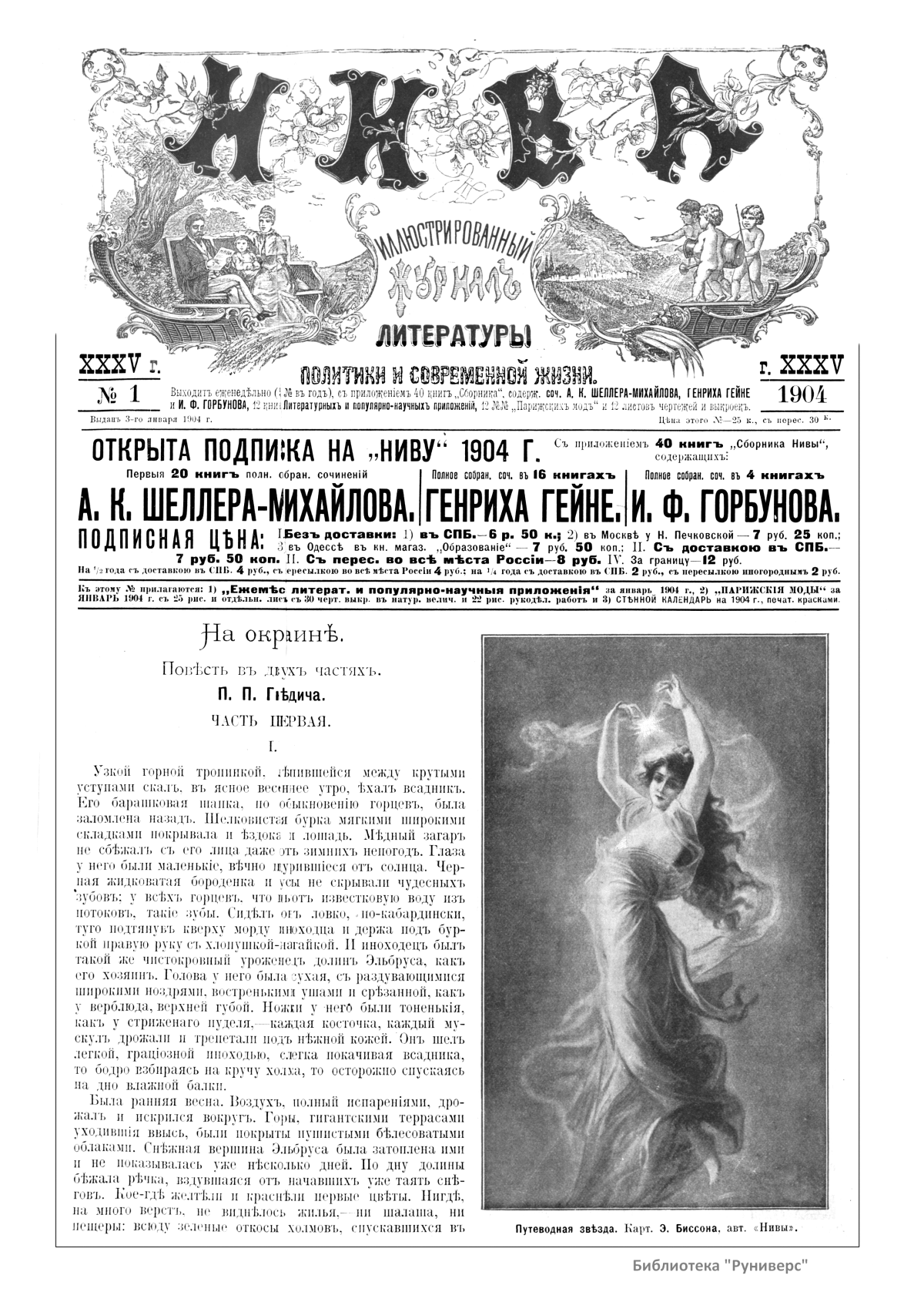 «Нива» — популярный еженедельный русский журнал с приложениями, издававшийся со второй половины XIX до начала XX века, носил подзаголовок «Журнал литературы, политики и современной жизни». Журнал был любимым детищем А. Ф. Маркса, возглавлявшего свое издательство вплоть до своей смерти в 1904 г. Позиционировалась «Нива» как иллюстрированный журнал для семейного чтения и был ориентирован, главным образом, на обывателя. В журнале публиковались литературные произведения, исторические, научно-популярные очерки, репродукции и гравюры картин современных художников. Материалы политического и общественного содержания также сопровождались многочисленными иллюстрациями. Среди известных литераторов, печатавшихся в журнале, были А. К. Толстой, Ф. И. Тютчев, Л. Н. Толстой, А. А. Фет, А. П. Чехов, Максим Горький, Корней Чуковский, Анна Ахматова, Иван Бунин и многие другие. Благодаря «Ниве» сочинения многих современных авторов добрались до самых отдаленных областей России.