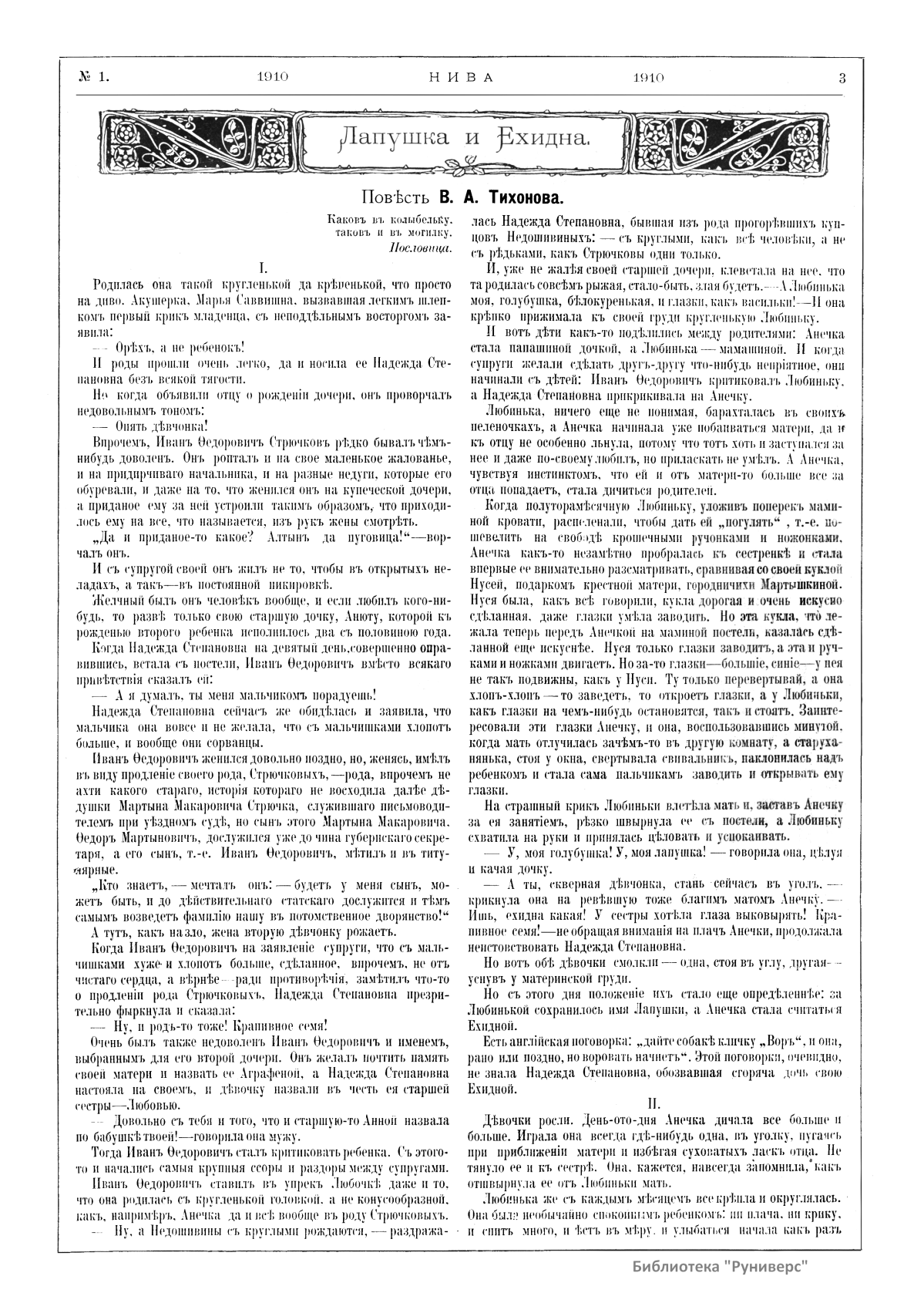 «Нива» — популярный еженедельный русский журнал с приложениями, издававшийся со второй половины XIX до начала XX века, носил подзаголовок «Журнал литературы, политики и современной жизни». Журнал был любимым детищем А. Ф. Маркса, возглавлявшего свое издательство вплоть до своей смерти в 1904 г. Позиционировалась «Нива» как иллюстрированный журнал для семейного чтения и был ориентирован, главным образом, на обывателя. В журнале публиковались литературные произведения, исторические, научно-популярные очерки, репродукции и гравюры картин современных художников. Материалы политического и общественного содержания также сопровождались многочисленными иллюстрациями. Среди известных литераторов, печатавшихся в журнале, были А. К. Толстой, Ф. И. Тютчев, Л. Н. Толстой, А. А. Фет, А. П. Чехов, Максим Горький, Корней Чуковский, Анна Ахматова, Иван Бунин и многие другие. Благодаря «Ниве» сочинения многих современных авторов добрались до самых отдаленных областей России.