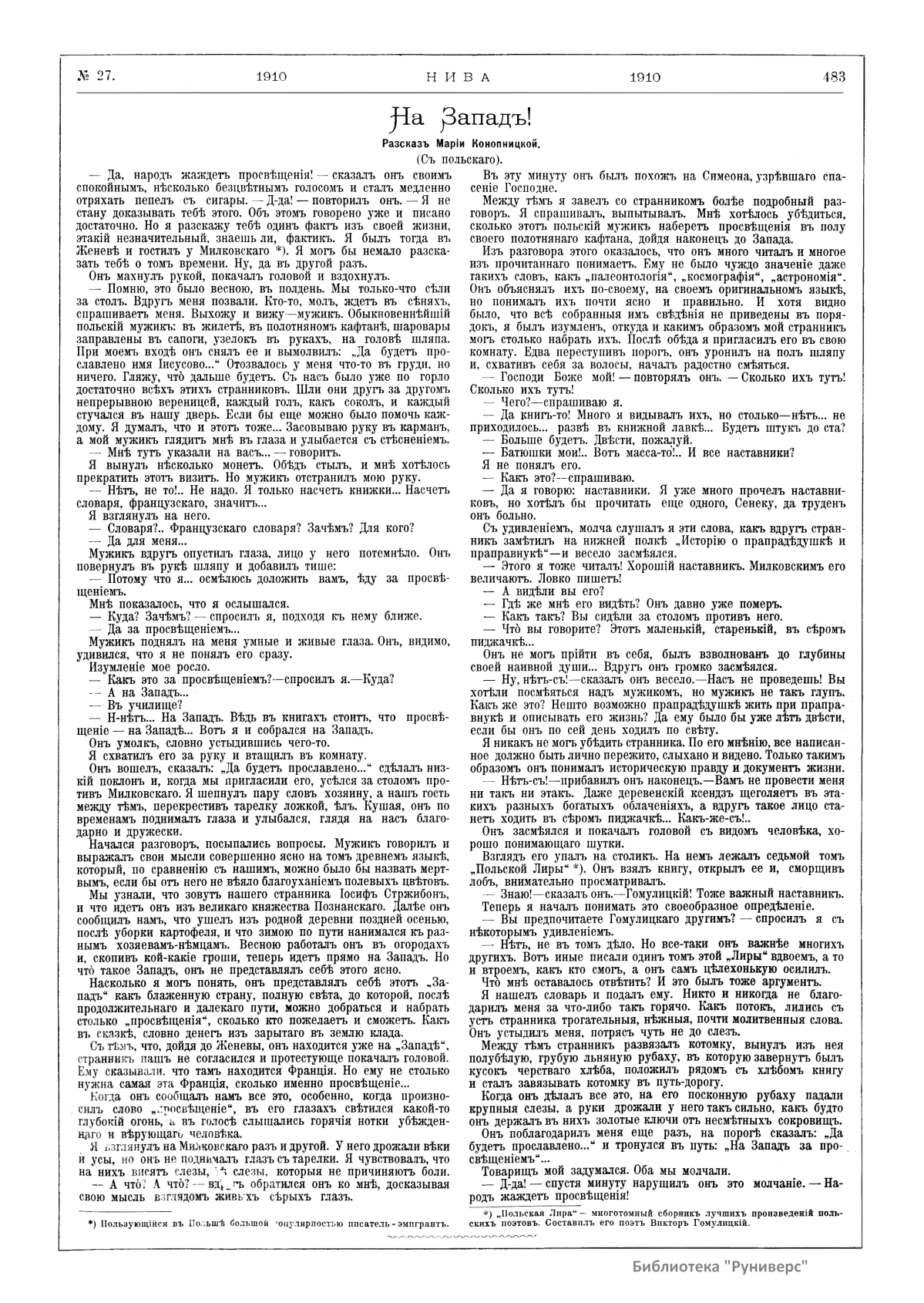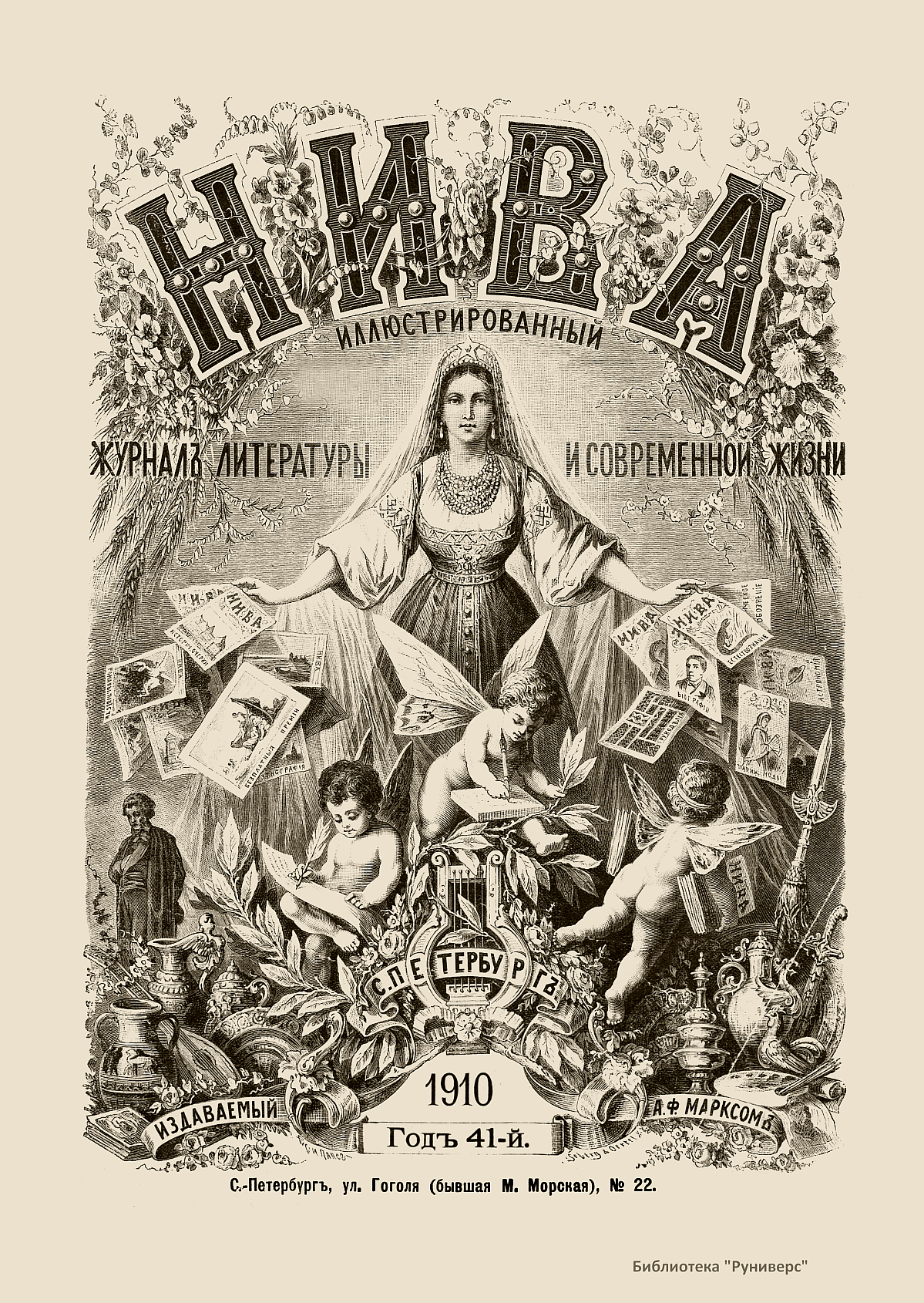«Нива» — популярный еженедельный русский журнал с приложениями, издававшийся со второй половины XIX до начала XX века, носил подзаголовок «Журнал литературы, политики и современной жизни». Журнал был любимым детищем А. Ф. Маркса, возглавлявшего свое издательство вплоть до своей смерти в 1904 г. Позиционировалась «Нива» как иллюстрированный журнал для семейного чтения и был ориентирован, главным образом, на обывателя. В журнале публиковались литературные произведения, исторические, научно-популярные очерки, репродукции и гравюры картин современных художников. Материалы политического и общественного содержания также сопровождались многочисленными иллюстрациями. Среди известных литераторов, печатавшихся в журнале, были А. К. Толстой, Ф. И. Тютчев, Л. Н. Толстой, А. А. Фет, А. П. Чехов, Максим Горький, Корней Чуковский, Анна Ахматова, Иван Бунин и многие другие. Благодаря «Ниве» сочинения многих современных авторов добрались до самых отдаленных областей России.