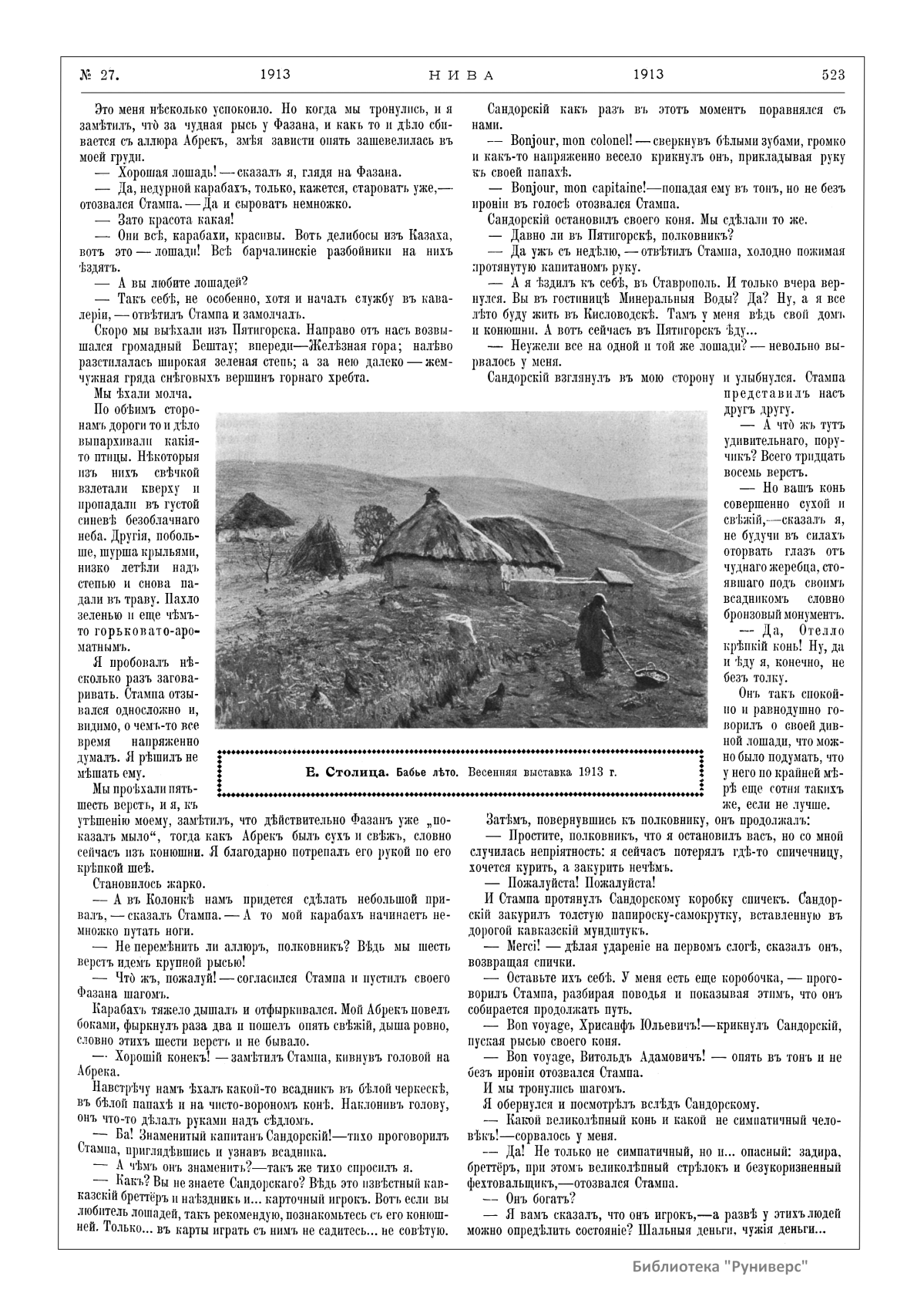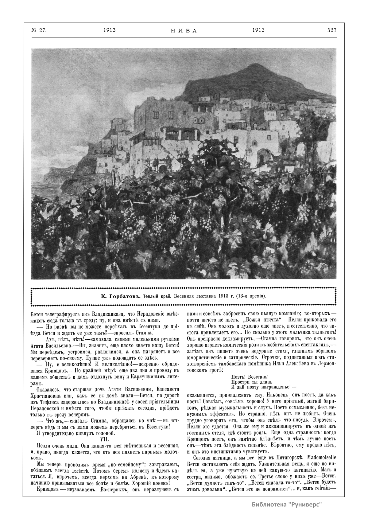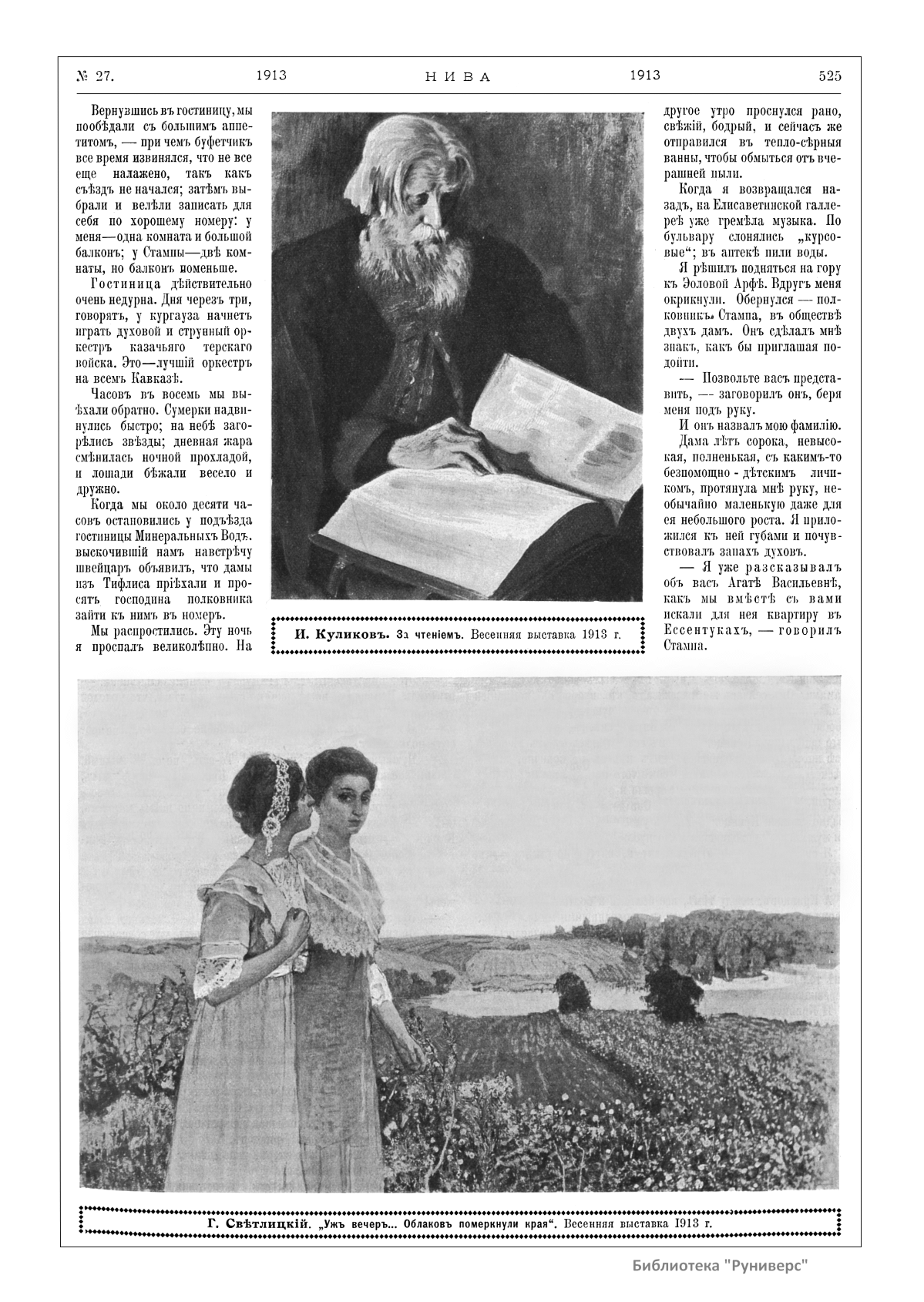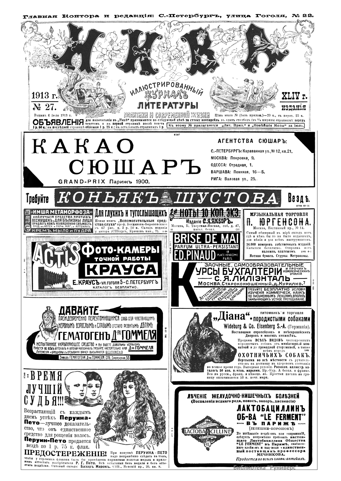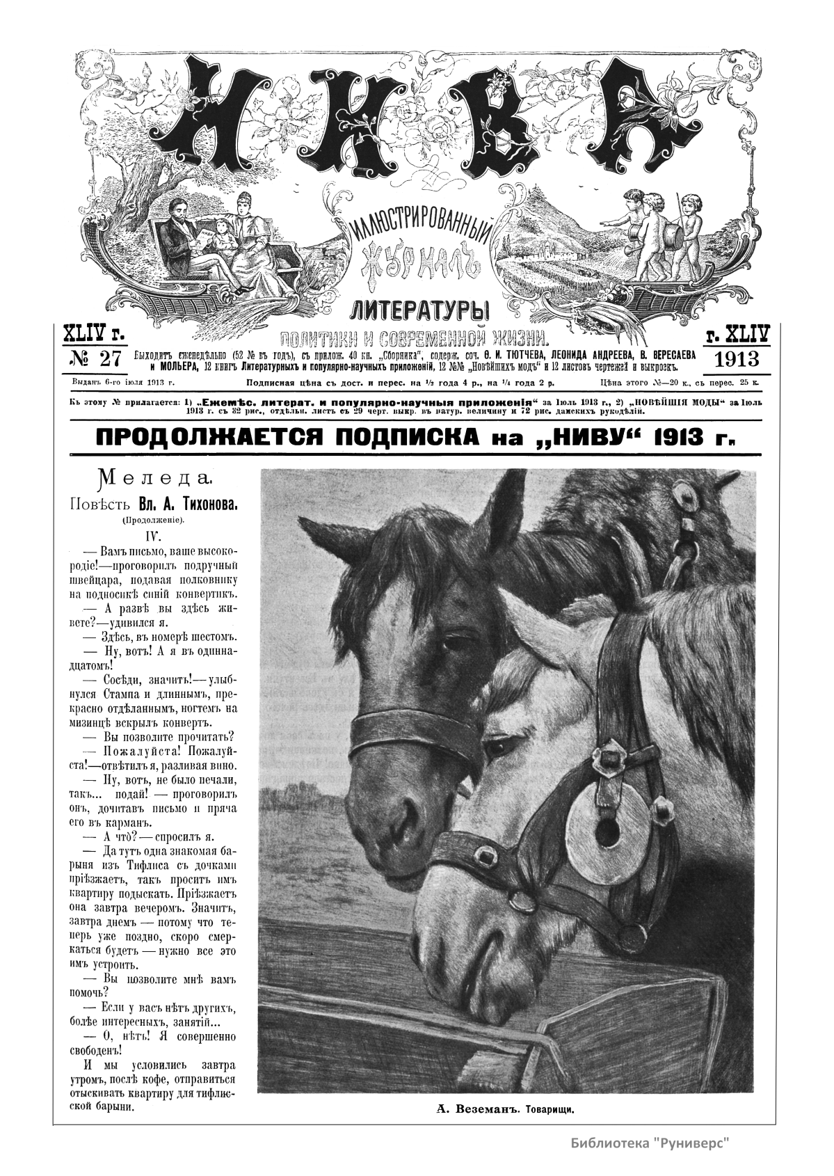 «Нива» — популярный еженедельный русский журнал с приложениями, издававшийся со второй половины XIX до начала XX века, носил подзаголовок «Журнал литературы, политики и современной жизни». Журнал был любимым детищем А. Ф. Маркса, возглавлявшего свое издательство вплоть до своей смерти в 1904 г. Позиционировалась «Нива» как иллюстрированный журнал для семейного чтения и был ориентирован, главным образом, на обывателя. В журнале публиковались литературные произведения, исторические, научно-популярные очерки, репродукции и гравюры картин современных художников. Материалы политического и общественного содержания также сопровождались многочисленными иллюстрациями. Среди известных литераторов, печатавшихся в журнале, были А. К. Толстой, Ф. И. Тютчев, Л. Н. Толстой, А. А. Фет, А. П. Чехов, Максим Горький, Корней Чуковский, Анна Ахматова, Иван Бунин и многие другие. Благодаря «Ниве» сочинения многих современных авторов добрались до самых отдаленных областей России.