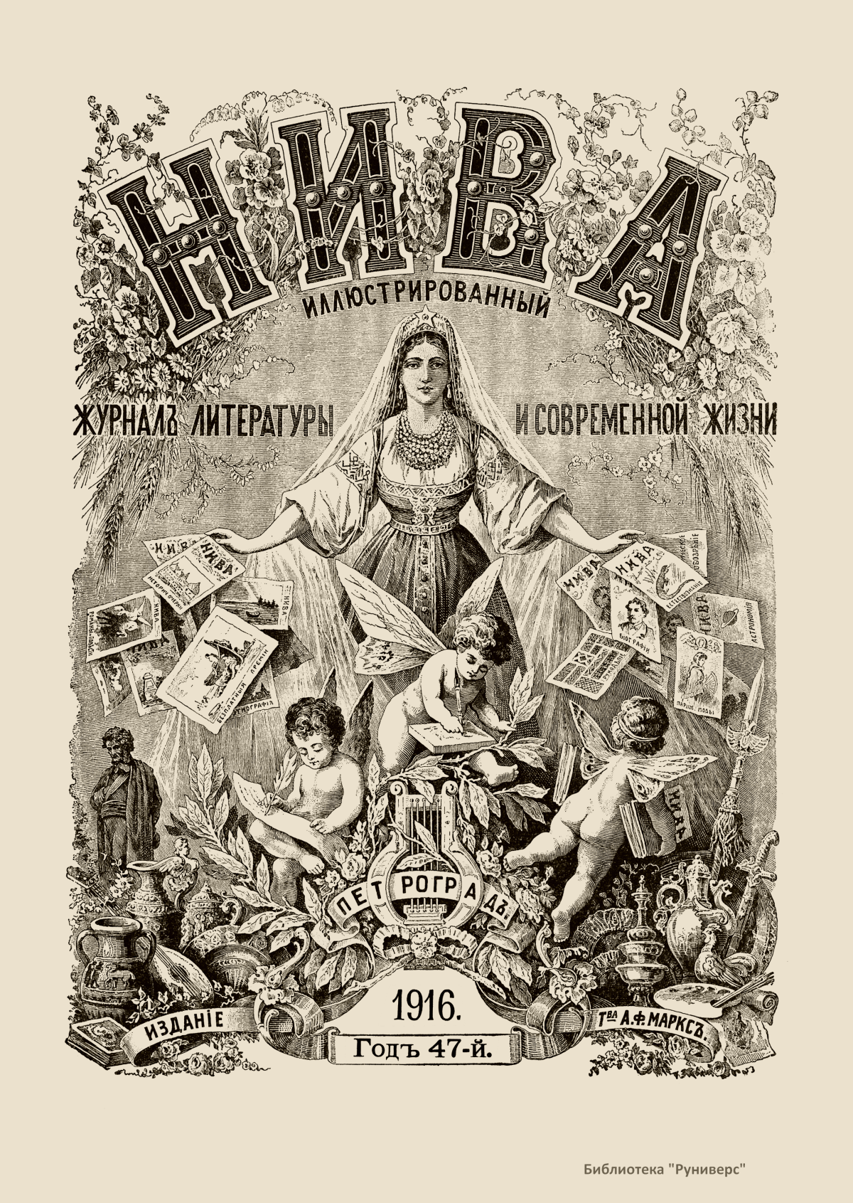 «Нива» — популярный еженедельный русский журнал с приложениями, издававшийся со второй половины XIX до начала XX века, носил подзаголовок «Журнал литературы, политики и современной жизни». Журнал был любимым детищем А. Ф. Маркса, возглавлявшего свое издательство вплоть до своей смерти в 1904 г. Позиционировалась «Нива» как иллюстрированный журнал для семейного чтения и был ориентирован, главным образом, на обывателя. В журнале публиковались литературные произведения, исторические, научно-популярные очерки, репродукции и гравюры картин современных художников. Материалы политического и общественного содержания также сопровождались многочисленными иллюстрациями. Среди известных литераторов, печатавшихся в журнале, были А. К. Толстой, Ф. И. Тютчев, Л. Н. Толстой, А. А. Фет, А. П. Чехов, Максим Горький, Корней Чуковский, Анна Ахматова, Иван Бунин и многие другие. Благодаря «Ниве» сочинения многих современных авторов добрались до самых отдаленных областей России.