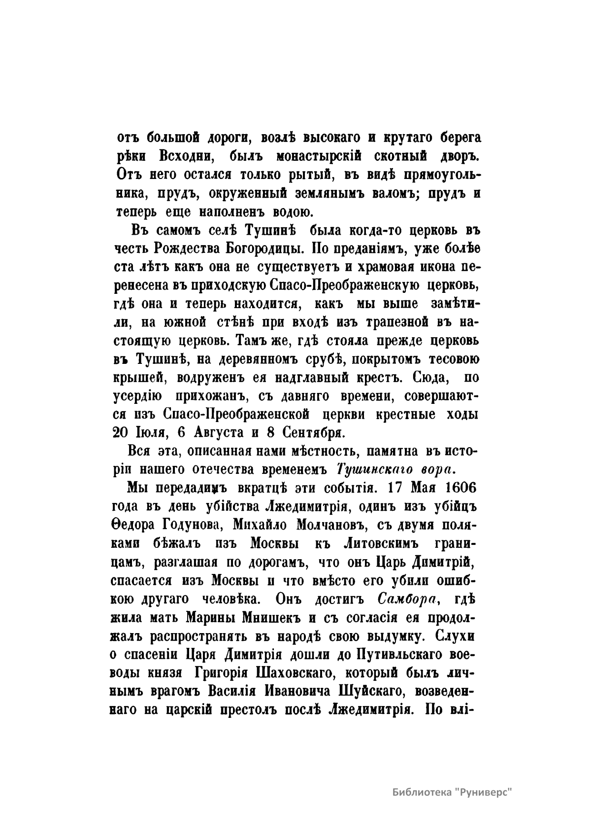 В брошюре дано подробное описание села Тушино начиная с конца XIV века и изложена история самозванца Лжедмитрия II - Тушинского вора. Самозванец неизвестного происхождения выдавал себя с 1607 года за якобы спасшегося царя Лжедмитрия I. В 1608 – 1609 гг. он создал Тушинский лагерь под Москвой, откуда безуспешно пытался захватить столицу. С начала открытой польской интервенции бежал в Калугу, где был убит.