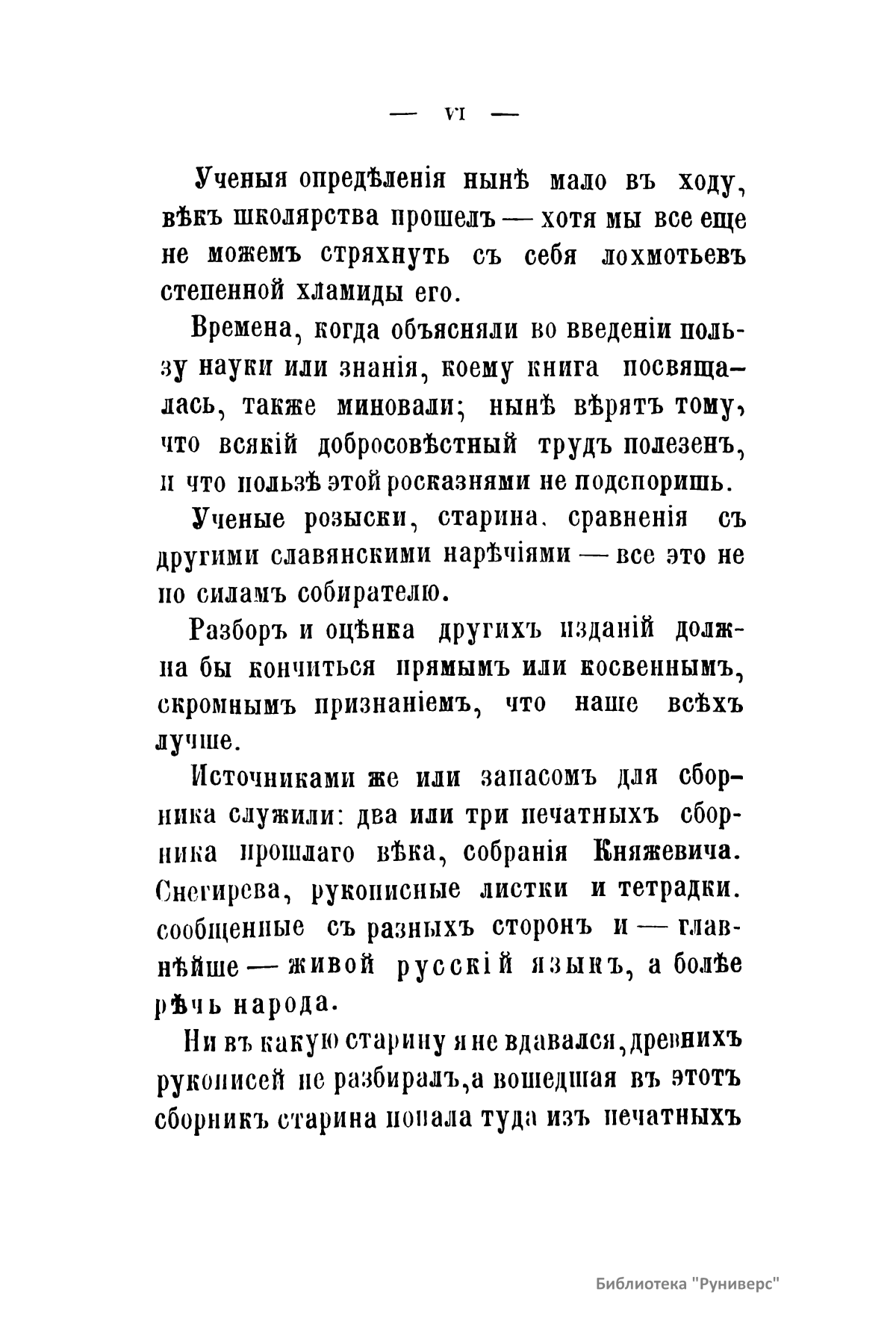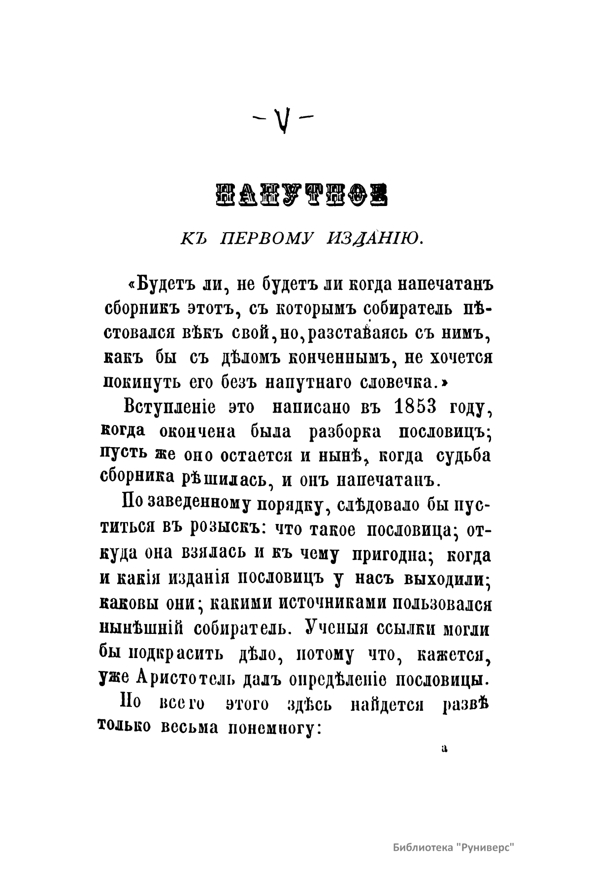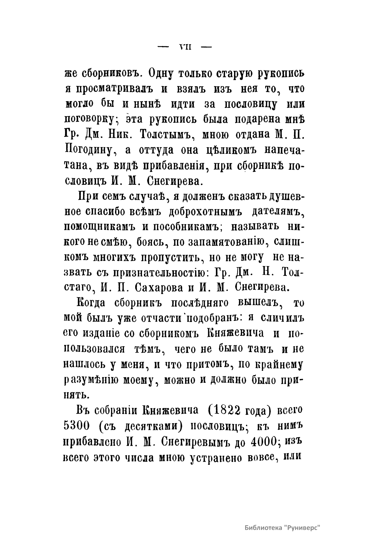 В этот сборник вошли кроме пословиц пословичные изречения, поговорки, присловья, скороговорки, прибаутки, загадки, поверья, приметы, суеверья и много речений, условно вошедшие в употребление. «В этом сборнике должны сойтись народная мудрость с народной глупостью, ум с пошлостью, добро со злом, истина с ложью. Человек должен явиться здесь таким, каков он вообще, на всем земном шаре, и каков он в частности, в нашем народе. Что худо, то бегай, что добро, тому следуй, но не прячь, не скрывай ни добра, ни худа, а покажи, что есть... Сборник пословиц – это свод народной опытной премудрости. Это стоны и вздохи, плач и рыданье, радость и веселие, горе и утешение в лицах. Это цвет народного ума, самобытной стати, это житейская народная правда, своего рода судебник, никем не судимый… Что не дошло до народа не касалось житья-бытья его, то не шевелило ни ума, ни сердца его, и того в пословицах нет; что впуталось добром, либо лихом в быт его, то найдете и в пословице».