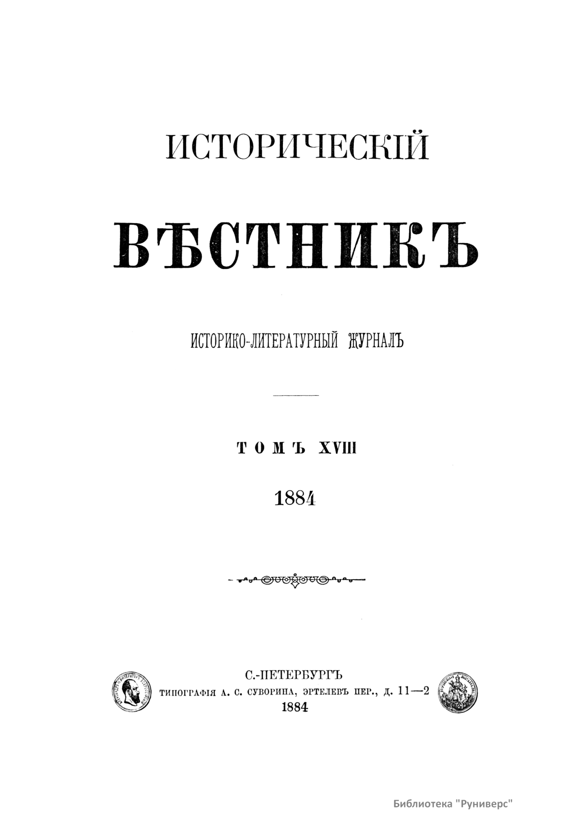 Историческiй вѣстникъ. Историко-литературный журналъ. Томъ XVIII