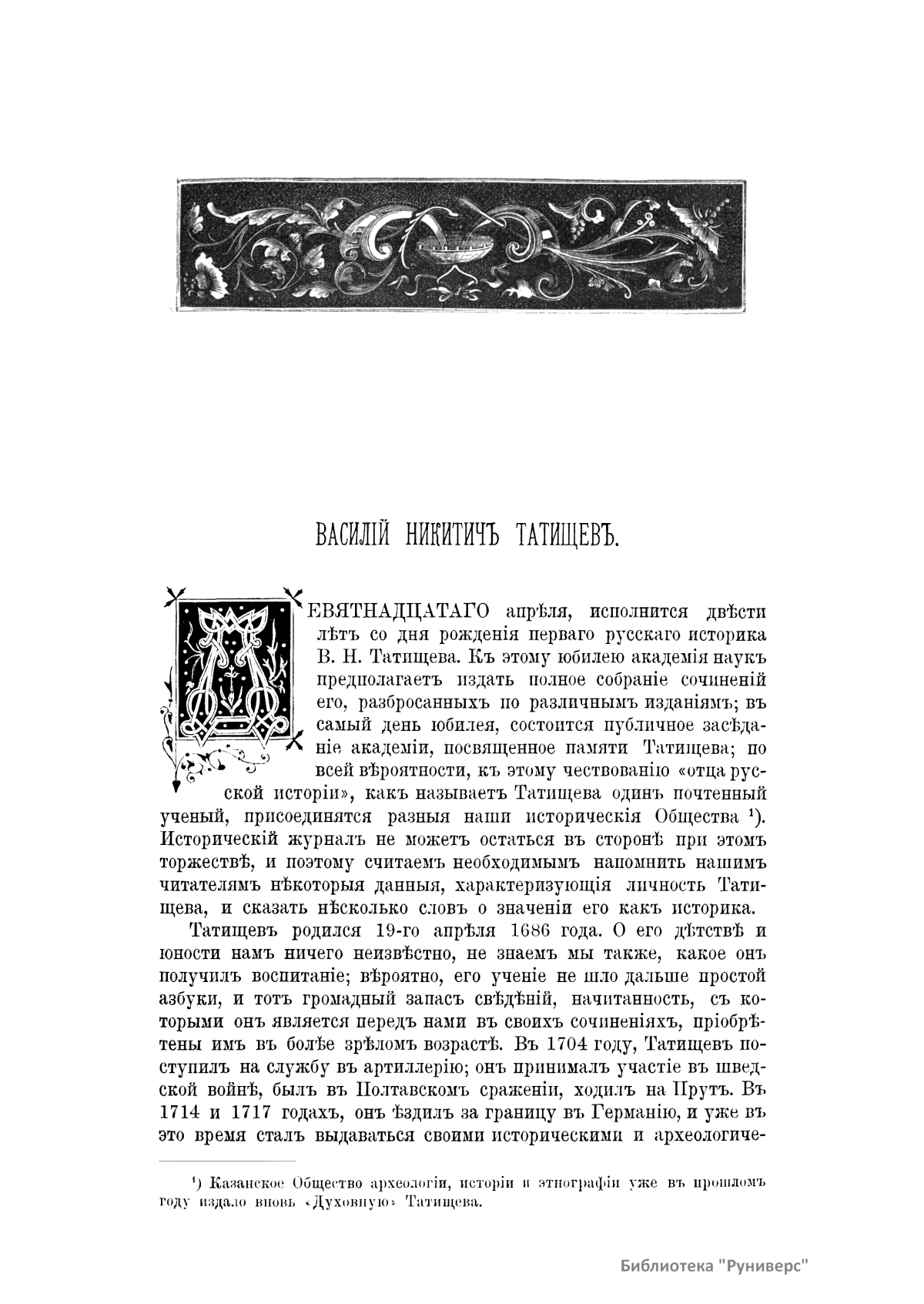 «Исторический вестник» - русский ежемесячный историко-литературный журнал. Издавался в Санкт-Петербурге с 1880-го по 1917 г. Журнал был основан А.С. Сувориным и С.Н. Шубинским с целью «знакомить читателей в живой, общедоступной форме с современным состоянием исторической науки и литературы в России и Европе». Вышло 150 тт. Каждый том состоял из трёх ежемесячных выпусков, имел свою нумерацию страниц, оглавление, список иллюстраций. Журнал приобрёл устойчивую популярность среди читателей, заняв прочное место в «триумвирате» русских исторических журналов наряду с «Русским архивом» и «Русской стариной». опережая их по количеству подписчиков. Отличием «Исторического вестника» было то, что он не помещал на своих страницах необработанных, сырых материалов. С другой стороны, журнал приближался по своему типу к журналам общелитературного образца, сочетая в себе коммерческий успех и доступное изложение материала.