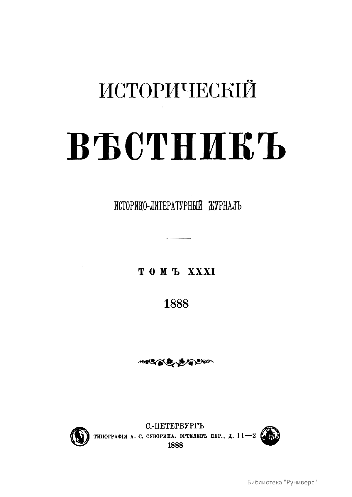 Исторический вестник. Историко-литературный журнал. Том XXXI