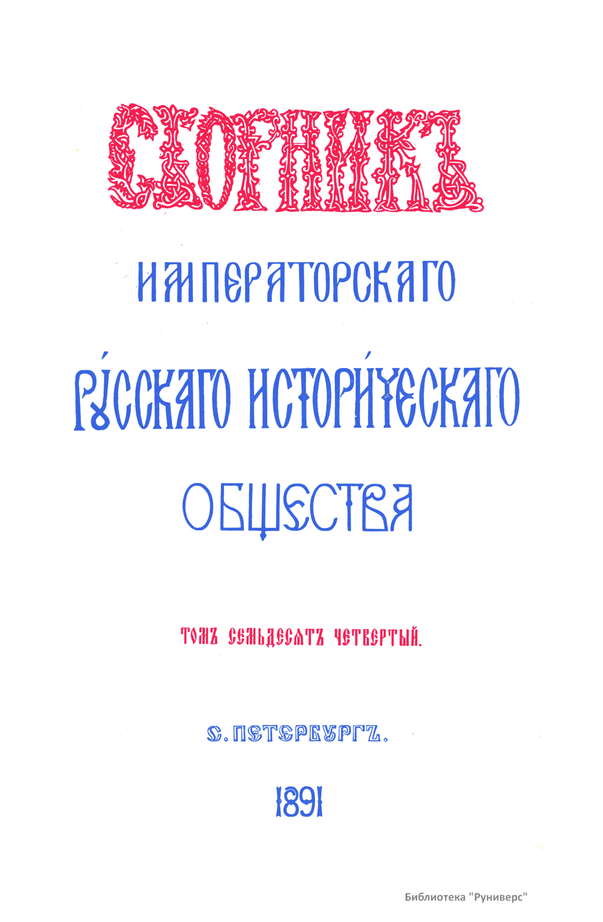 Сборникъ Русскаго историческаго общества. Томъ семьдесятъ четвертый