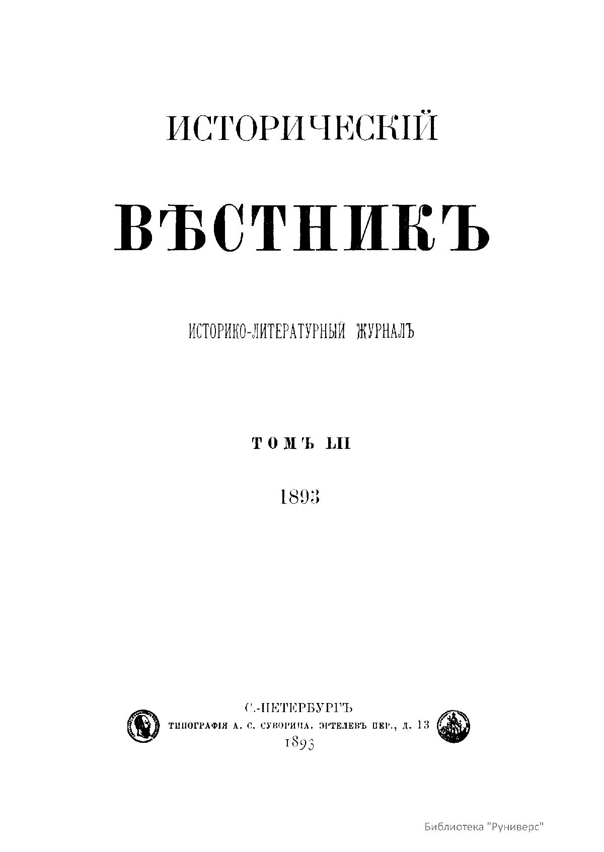 Историческiй вѣстникъ. Историко-литературный журналъ. Томъ LII