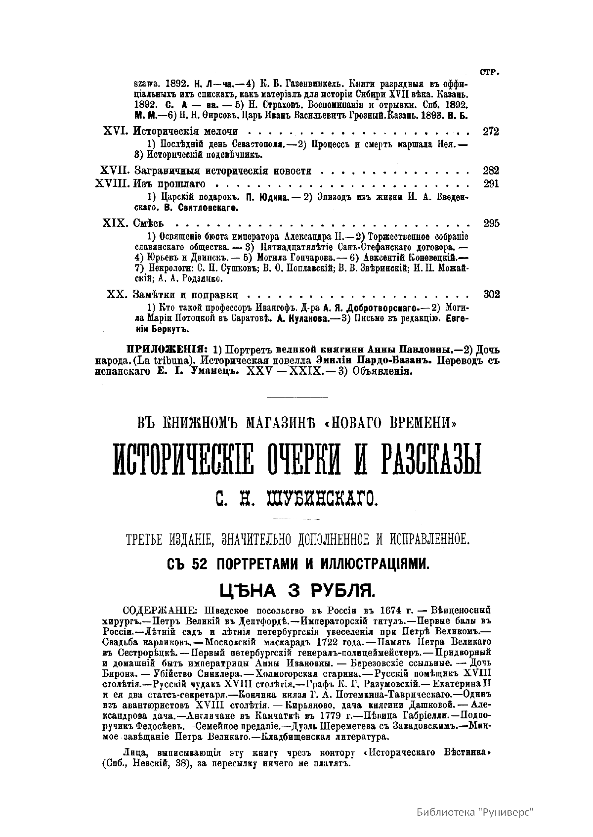 «Исторический вестник» - русский ежемесячный историко-литературный журнал. Издавался в Санкт-Петербурге с 1880-го по 1917 г. Журнал был основан А.С. Сувориным и С.Н. Шубинским с целью «знакомить читателей в живой, общедоступной форме с современным состоянием исторической науки и литературы в России и Европе». Вышло 150 тт. Каждый том состоял из трёх ежемесячных выпусков, имел свою нумерацию страниц, оглавление, список иллюстраций. Журнал приобрёл устойчивую популярность среди читателей, заняв прочное место в «триумвирате» русских исторических журналов наряду с «Русским архивом» и «Русской стариной». опережая их по количеству подписчиков. Отличием «Исторического вестника» было то, что он не помещал на своих страницах необработанных, сырых материалов. С другой стороны, журнал приближался по своему типу к журналам общелитературного образца, сочетая в себе коммерческий успех и доступное изложение материала.