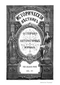 «Исторический вестник» - русский ежемесячный историко-литературный журнал. Издавался в Санкт-Петербурге с 1880-го по 1917 г. Журнал был основан А.С. Сувориным и С.Н. Шубинским с целью «знакомить читателей в живой, общедоступной форме с современным состоянием исторической науки и литературы в России и Европе». Вышло 150 тт. Каждый том состоял из трёх ежемесячных выпусков, имел свою нумерацию страниц, оглавление, список иллюстраций. Журнал приобрёл устойчивую популярность среди читателей, заняв прочное место в «триумвирате» русских исторических журналов наряду с «Русским архивом» и «Русской стариной». опережая их по количеству подписчиков. Отличием «Исторического вестника» было то, что он не помещал на своих страницах необработанных, сырых материалов. С другой стороны, журнал приближался по своему типу к журналам общелитературного образца, сочетая в себе коммерческий успех и доступное изложение материала.