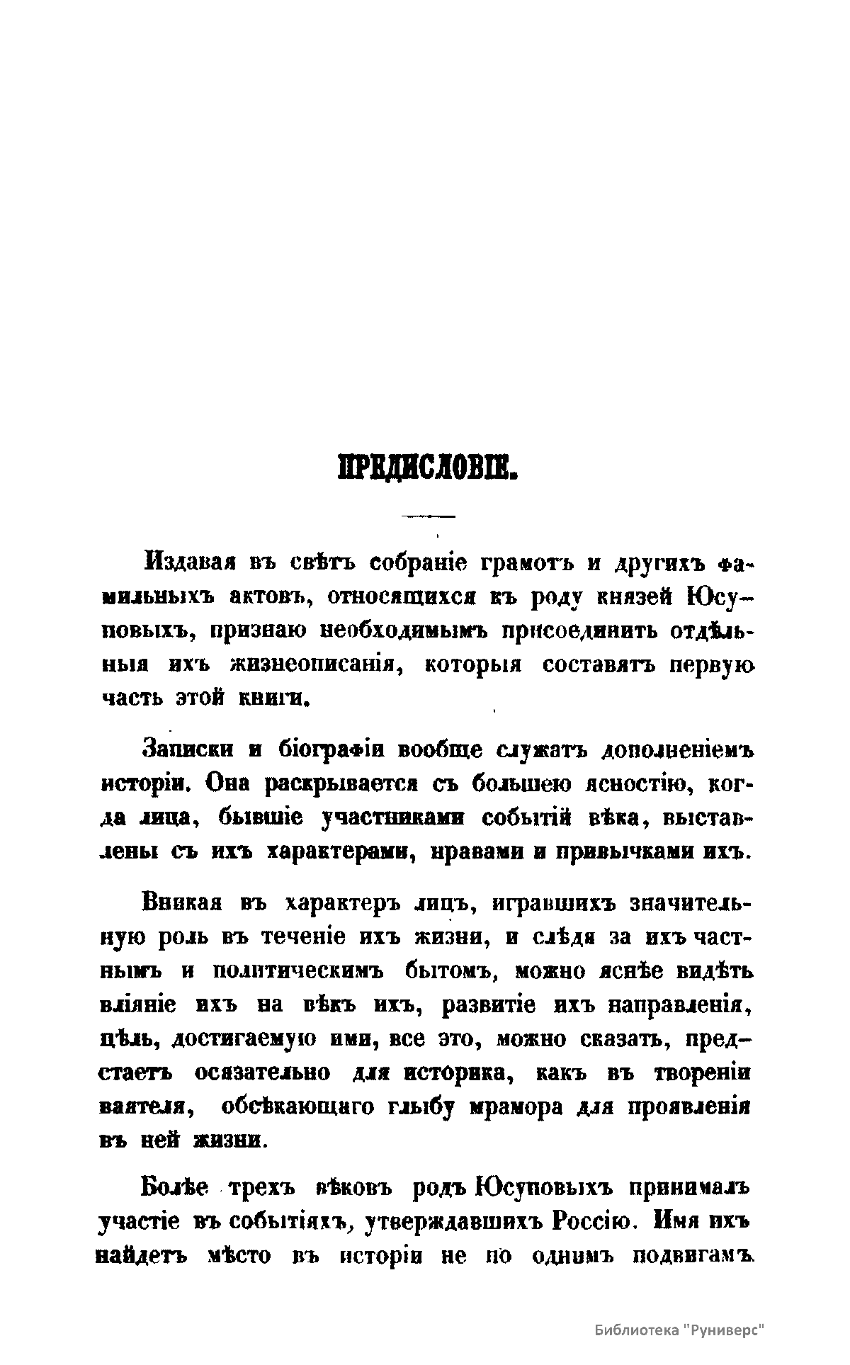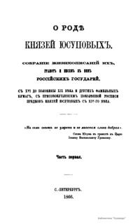 О родѣ князей Юсуповыхъ, собранiе жизнеописанiй ихъ, грамотъ и писемъ къ нимъ россiйскихъ государей, съ XVI до половины XIX вѣка и другихъ фамильныхъ бумагъ, съ присовокупленiемъ поколѣнной росписи предковъ князей Юсуповыхъ съ XIV-го вѣка