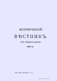 «Исторический вестник» - русский ежемесячный историко-литературный журнал. Издавался в Санкт-Петербурге с 1880-го по 1917 г. Журнал был основан А.С. Сувориным и С.Н. Шубинским с целью «знакомить читателей в живой, общедоступной форме с современным состоянием исторической науки и литературы в России и Европе». Вышло 150 тт. Каждый том состоял из трёх ежемесячных выпусков, имел свою нумерацию страниц, оглавление, список иллюстраций. Журнал приобрёл устойчивую популярность среди читателей, заняв прочное место в «триумвирате» русских исторических журналов наряду с «Русским архивом» и «Русской стариной». опережая их по количеству подписчиков. Отличием «Исторического вестника» было то, что он не помещал на своих страницах необработанных, сырых материалов. С другой стороны, журнал приближался по своему типу к журналам общелитературного образца, сочетая в себе коммерческий успех и доступное изложение материала.