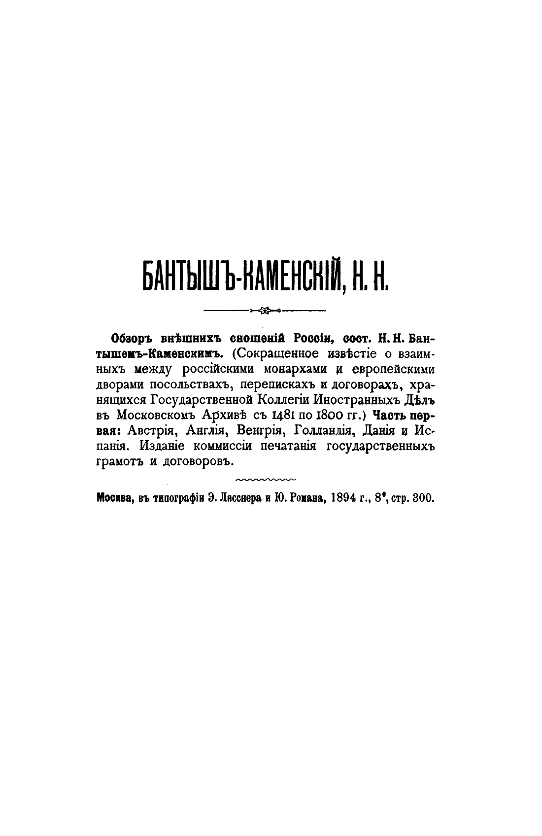 Посмертное издание ключевого труда бессменного (в течение почти 50 лет) археографа и управляющего Московским Главным архивом коллегии иностранных дел - систематизированное изложение документов о посольствах между российскими монархами и европейскими державами, дипломатической переписки и договоров.