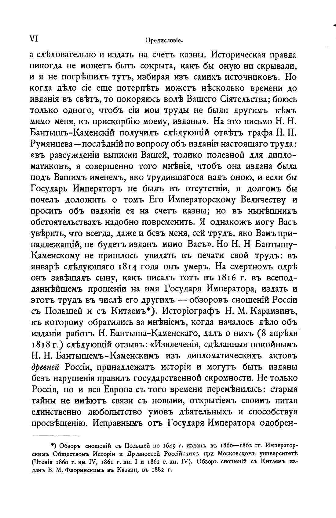 Н.М. Карамзин: «Извлечения, сделанные покойным Н.Н. Бантыш-Каменским из дипломатических актов древней России, принадлежат истории и могут быть изданы без нарушения правил государственной скромности. Не только Россия, но и вся Европа с того времени переменилась: старые тайны не имеют связи с новыми, открытием своим питая единственно любопытство умов деятельных и способствуя просвещению»