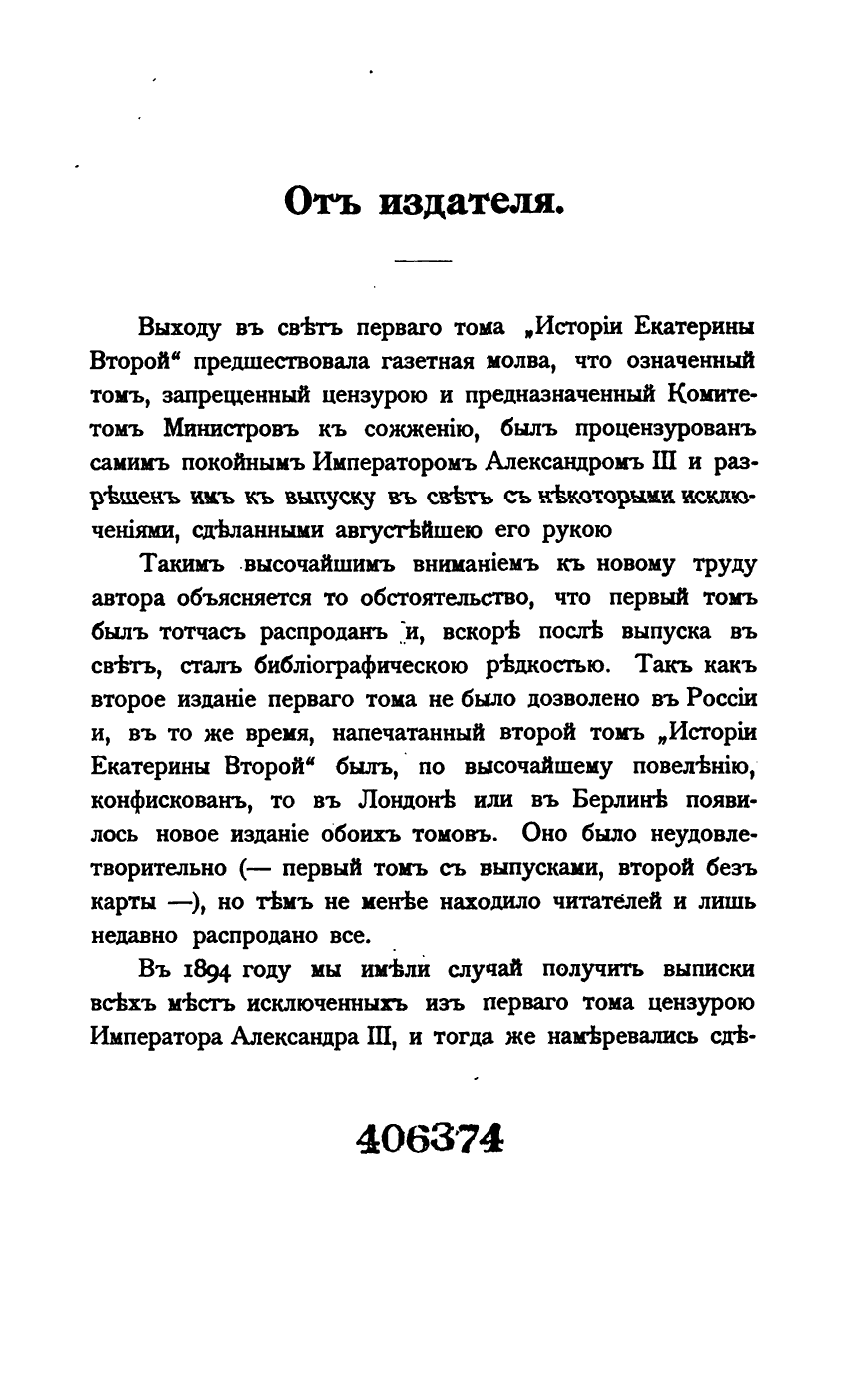 Гнев императора вызвали опубликованные Бильбасовым материалы о перевороте 1762 г. и гибели свергнутого с престола Петра III. Несмотря на то, что Бильбасов, используя все доступные отечественные и зарубежные источники, доказывал невиновность Екатерины в смерти мужа, раскрытие многих подробностей жизни императорской фамилии было сочтено неподобающим. Автору пришлось пойти на значительные сокращения и изъятия из своего труда, чтобы книга увидела свет. В последующий годы читательский интерес к запрещенной книге не ослабевал. И наконец, в 1900 году труд Бильбасова был издан в Берлине на русском языке в полной авторской редакции без цензурных пропусков.