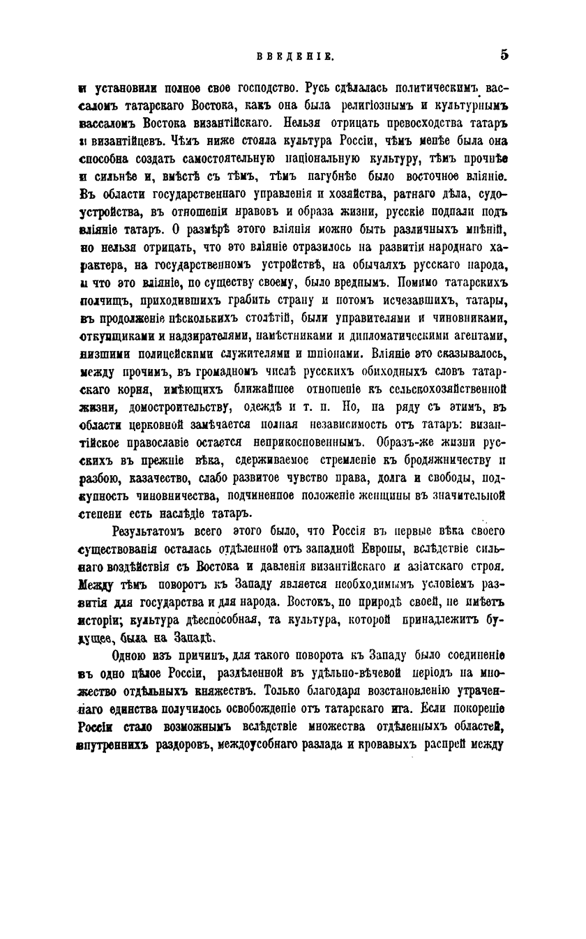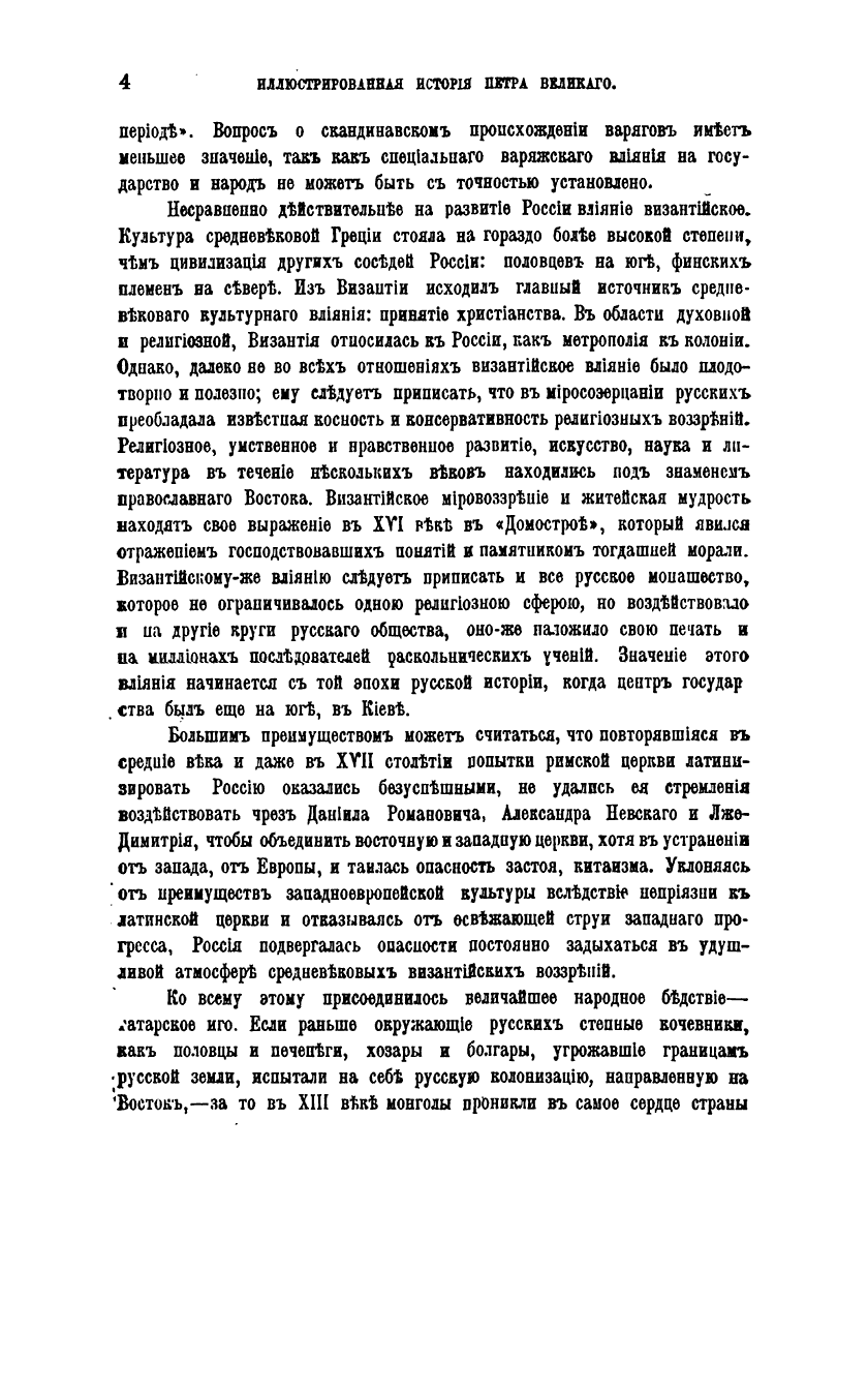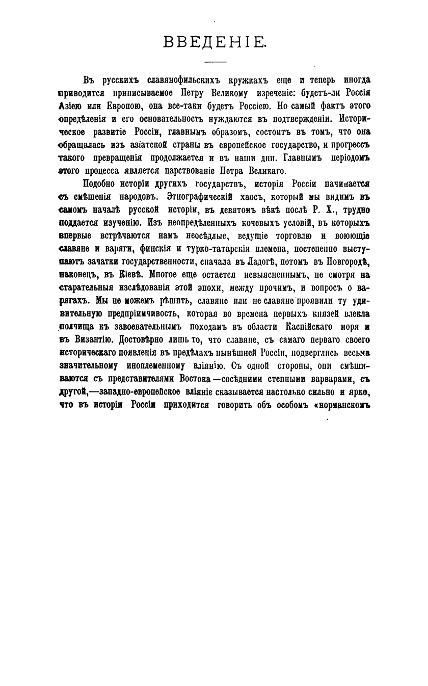 «В русских славянофильских кружках, — пишет Брикнер в «Истории Петра», — еще и теперь иногда приводится приписываемое Петру Великому изречение: будет ли Россия Азией или Европой, она все таки будет Россией. Но самый факт этого определения и его основательность нуждаются в подтверждении. Историческое развитие России, главным образом состоит в том, что она обращалась из азиатской страны в европейское государство, и прогресс такого превращения продолжается и в наши дни»