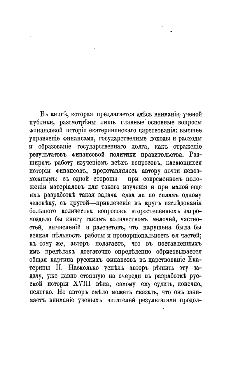 Беспристрастно исследовав состояние государственных финансов и экономическую политику правительства во времена екатериниского царствования, автор с неопровержимыми фактами в руках доказывает, что «Век Екатерины», во всяком случае по денежной части, был вовсе не таким «золотым», как представляется позднейшим поколениям.