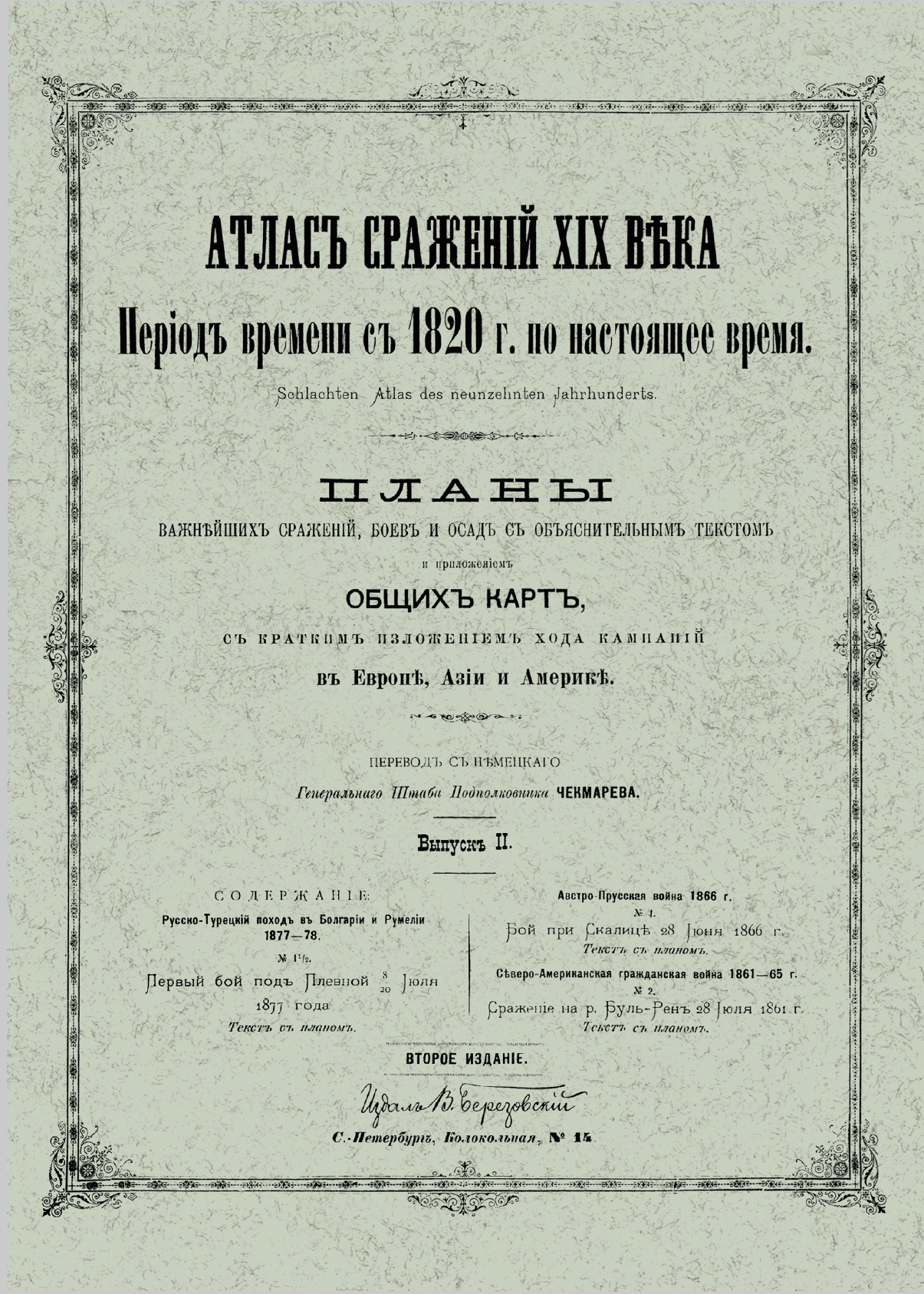 Второе издание «Атласа сражений XIX века» в 20-ти выпусках, представляет собой перевод на русский язык, выпускавшегося в военно-научном комитете Главного штаба на немецком языке с 1830-х гг., разрозненного собрания карт и планов военных кампаний армий мира в XIX века. Переводчиком данного издания является Виктор Иванович Чекмарев (1861–1939) — генерал-лейтенант (1912), видный военный деятель российской императорской армии, историк, участник Первой мировой войны и белого движения на юге России, впоследствии в эмиграции. С 1894 г., занимая должность делопроизводителя, а затем столоначальника канцелярии военно-ученого комитета Главного Штаба, подполковник Генерального Штаба Чекмарев, в результате кропотливой работы собрал воедино «Атлас сражений XIX века», каждый выпуск которого посвящен одной или нескольким военным кампаниям Европы, Азии и Америки, содержит подробное описание расположения войск и хода боевых действий противников, хронологию событий, снабжен картами и планами сражений. Это издание имеет большую историко-культурную ценность, интересно как ученым-историкам, так и любителям военно-исторической литературы.