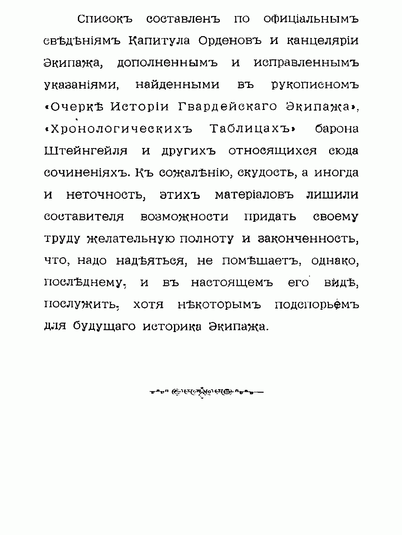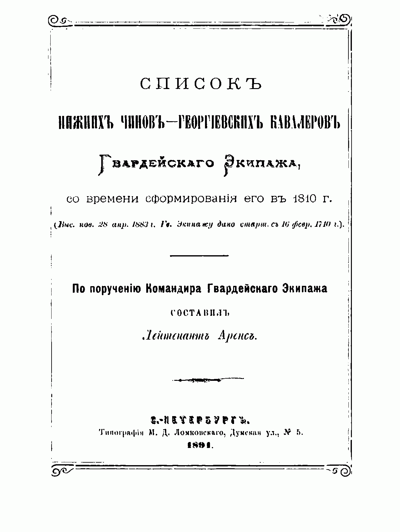 Список георгиевских кавалеров морского гвардейского экипажа за 80 лет его существования с кратким описанием подвигов моряков-гвардейцев принадлежит перу выдающегося военно-морского историка России, будущего генерал-лейтенанта флота и профессора Николаевской морской академии Е.И. Аренса, с 1888 г. в чине лейтенанта занявшего престижный придворный пост начальника Петергофской гавани. Это одно из первых исследований Аренса в области отечественной военно-морской исторической науки, позволяющее судить о высокой эрудированности и скрупулёзности автора.
