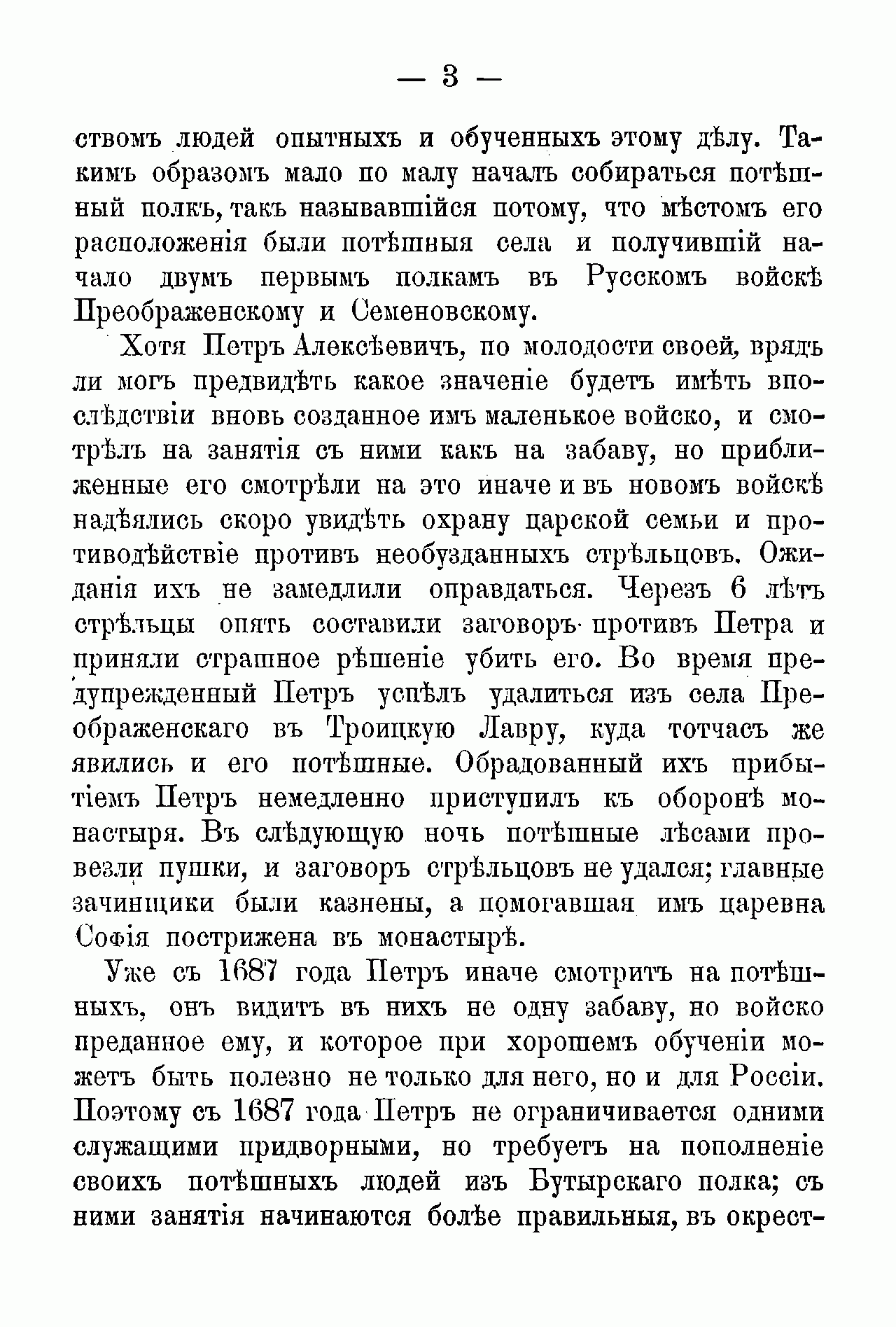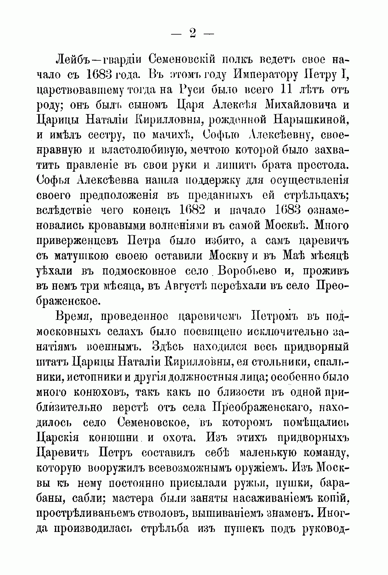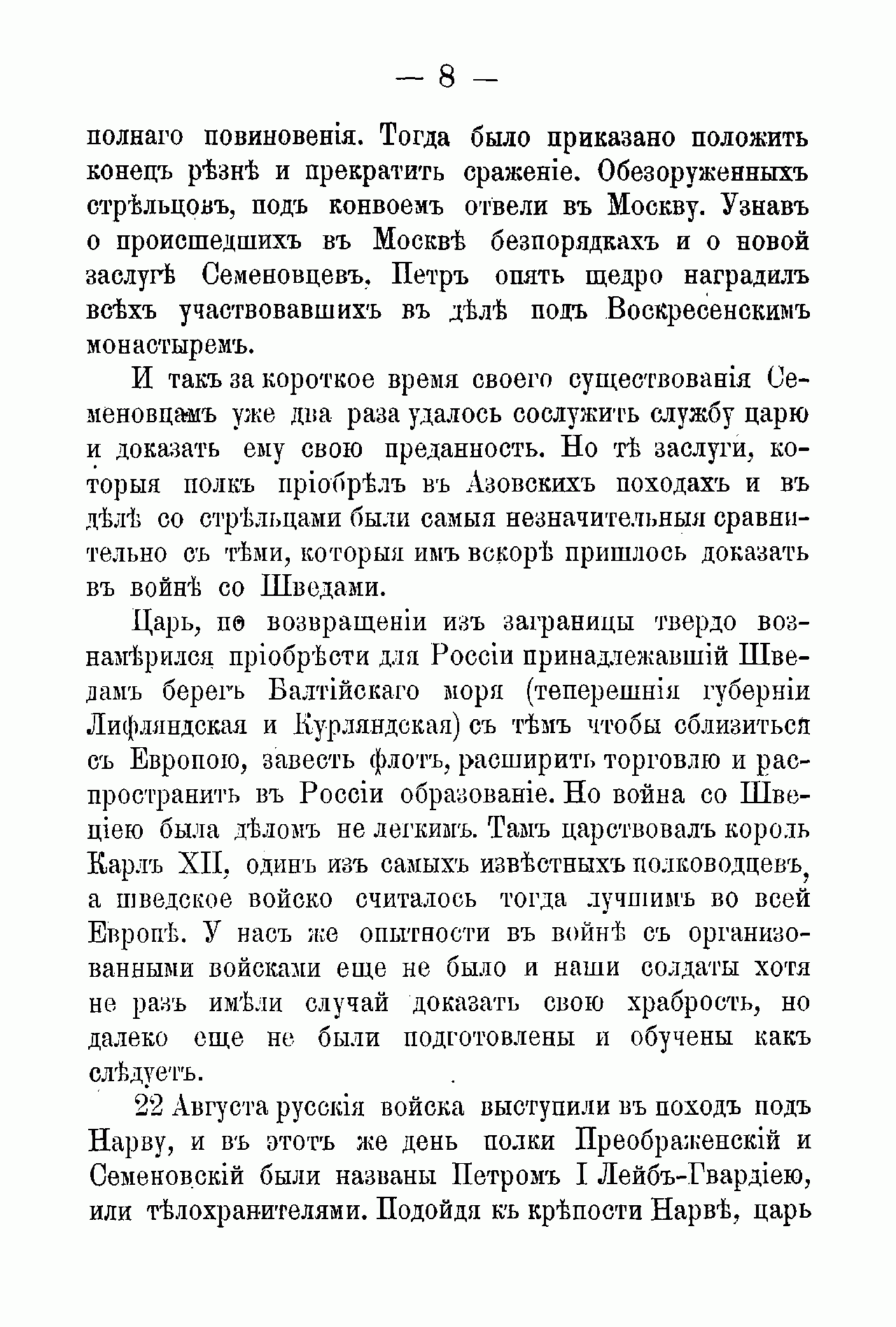 В этой брошюре бегло излагается боевой путь прославленного полка с момента его создания до начала царствования Александра III. Один из двух старейших пехотных полков гвардии (наряду с лейб-гвардии Преображенским полком), ведёт свою историю с 1683 г., с «потешных войск» царя Петра I. В 1700 г. он получил наименование лейб-гвардии Семёновский (по подмосковному дворцовому селу Семёновское, где первоначально дислоцировался). Полк участвовал в Азовских (1695–1696) и Прутском (1711) походах, всех важнейших сражениях Северной войны (1700–1721), в том числе и морских, при Гангуте (1714) и Гренгаме (1720). А также в Персидском походе (1722–1723 гг.), а отдельные его подразделения - в войне с Турцией (1735-1739 гг.) и двух войнах со Швецией (1741-1743 и 1788-1790 гг.). В XIX в. полк участвовал в войнах с наполеоновской Францией (1805–1807 гг.), Отечественной войне 1812 года, в заграничных походах русской армии (1813–1814 гг.), и, наконец, в русско-турецких войнах (1828-1829 и 1877–1878 гг.).
