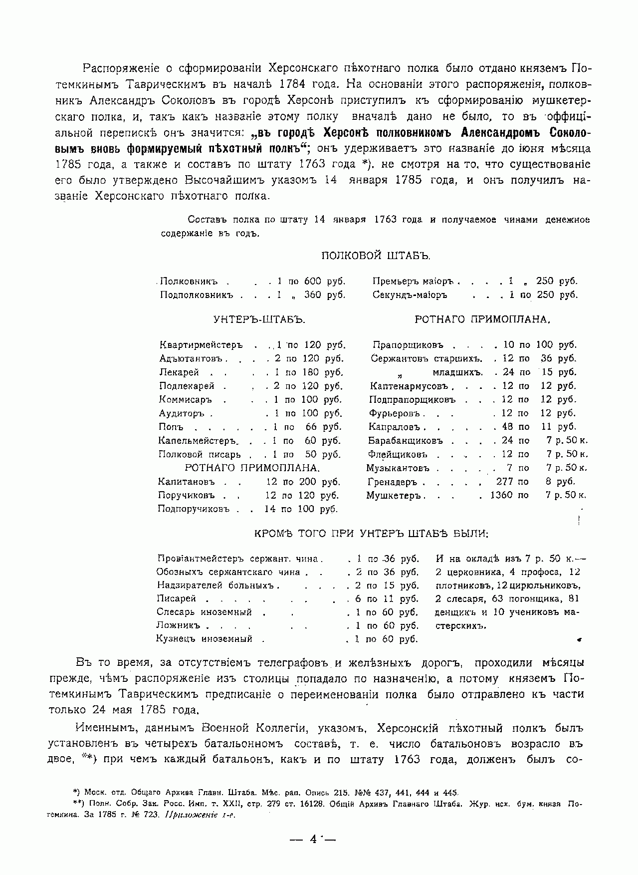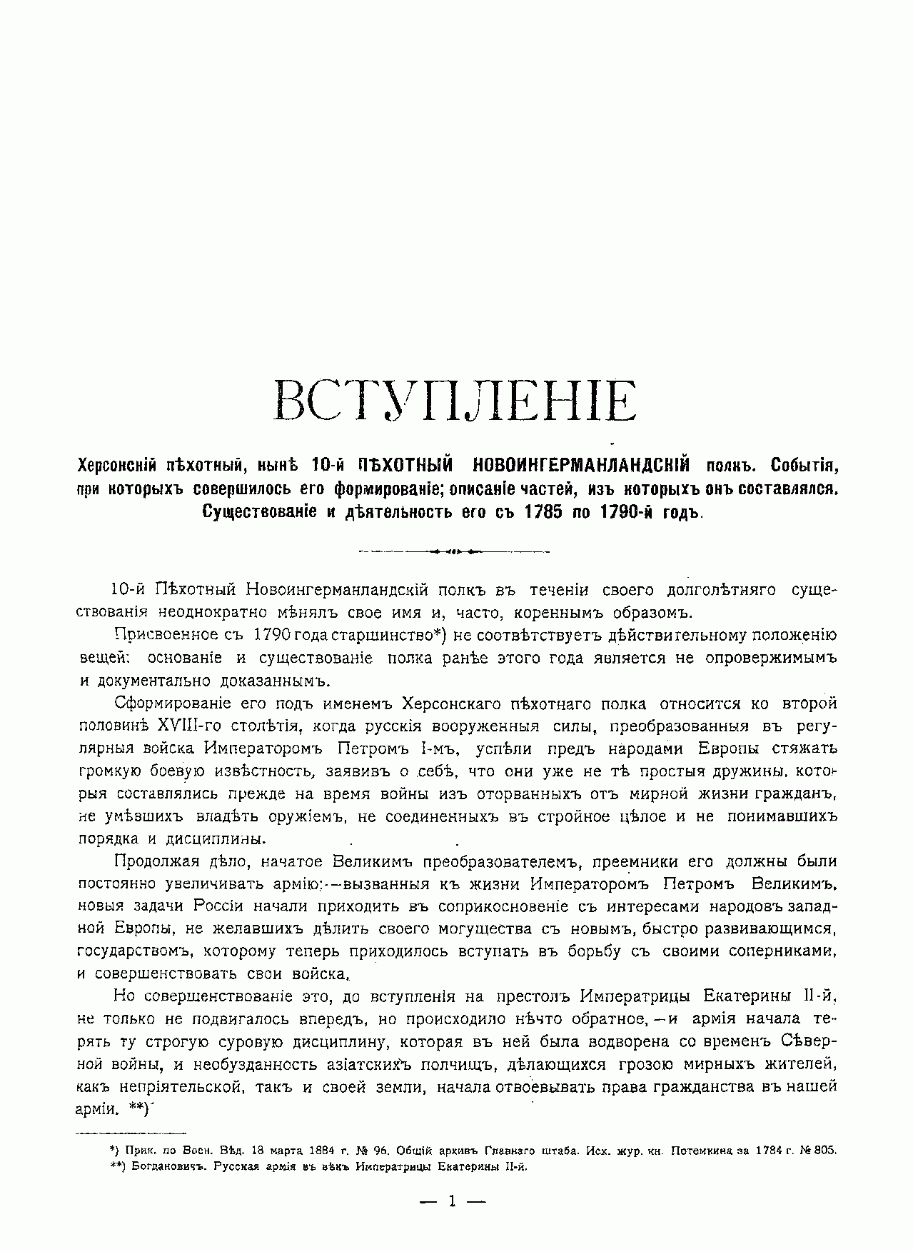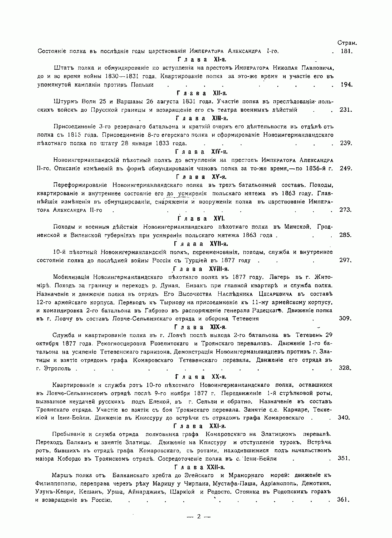 Книга ветерана полка и его историографа полковника А.И. Пирожникова посвящена детальному исследованию боевого пути одного из старейших полков Российской императорской армии. Полк был сформирован как мушкетерский пехотный полк в г. Херсоне, а первое название утверждено в январе 1785 г. – «Херсонский пехотный полк». Старшинство присвоено с 1790 г. С 1796 г. он получил название «Новоингерманландский мушкетерский полк». В течение своего существования полк неоднократно переименовывался и менял места дислокации. Полк принимал участие в русско-турецкой войне 1787-1791 гг., а затем в войне с Польшей в 1792 г., в эпоху наполеоновских войн участвовал в битве при Аустерлице в 1805 г., а позже в русско-турецкой войне 1806-1812 гг. Полк прошел славный боевой путь в Отечественной войне 1812 г. и заграничных походах русской армии в 1813-1814 гг., участвовал в Бородинском сражении и «битве народов» под Лейпцигом. После возвращения вместе с экспедиционным корпусом из Франции в 1818 г. полк был расквартирован в Белоруссии. В царствование Николая I полк принимал активное участие в подавлении польского восстания в 1831 г., особо отличился при взятии Варшавы, затем в подавлении национального восстания в Венгрии в 1848-1849 гг. Впоследствии полк вновь принимал участие в подавлении национально-освободительного восстания на территории Польши и Белоруссии в 1863-1864 гг. В 1866 г. полк был переведен из Белостока в Ярославль и Кострому. Наиболее яркой страницей боевого пути полка стало его участие в русско-турецкой войне 1877-1878 гг. и освобождении Болгарии от османского владычества, за что он был удостоен двух почетных знамен. 20 августа 1890 г. в честь своего столетнего юбилея полк был снова награжден почетным Георгиевским знаменем. В царствование Николая II полк дислоцировался в Туле и Калуге, а затем его личный состав принимал участие в русско-японской войне 1904-1905 гг.