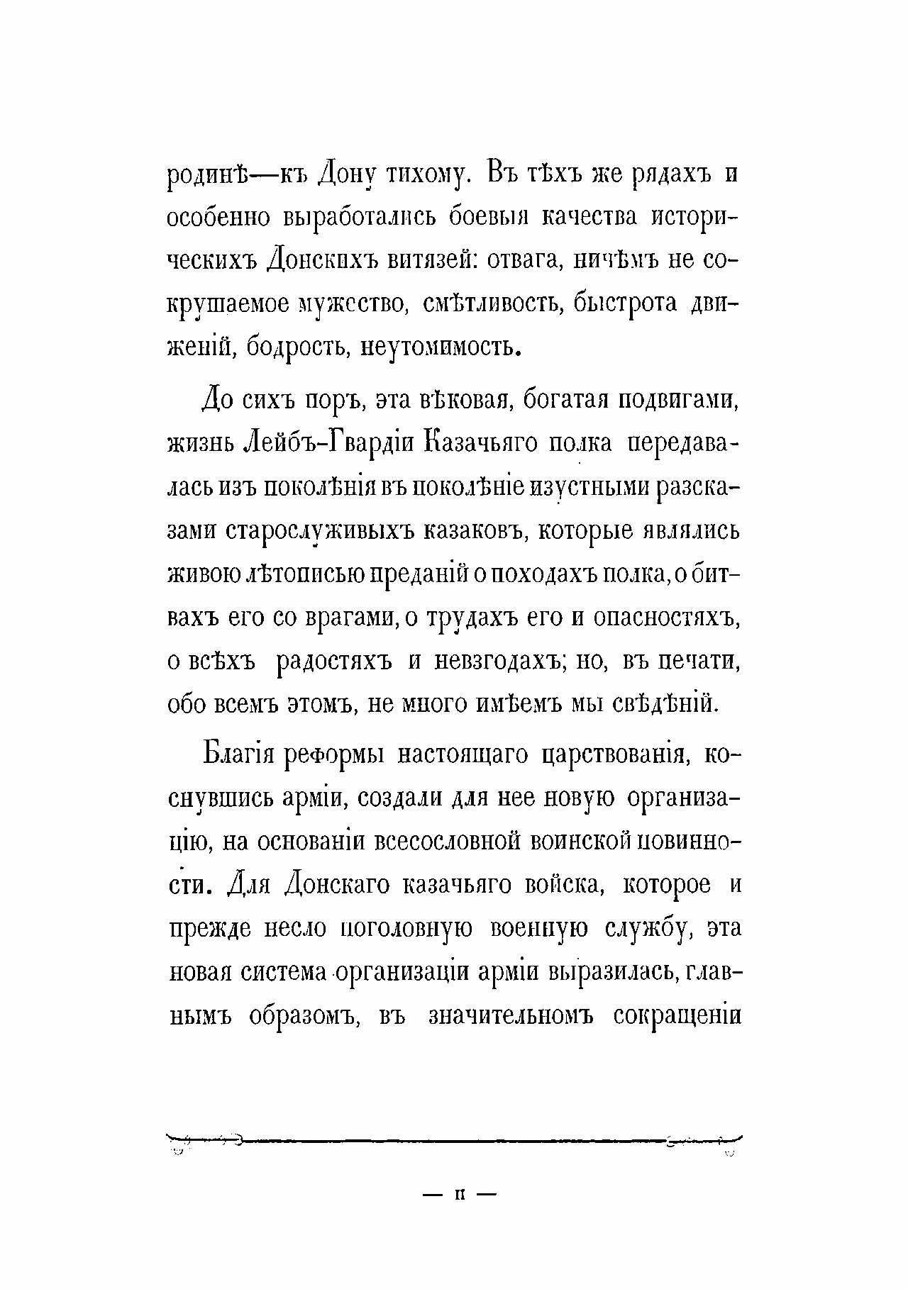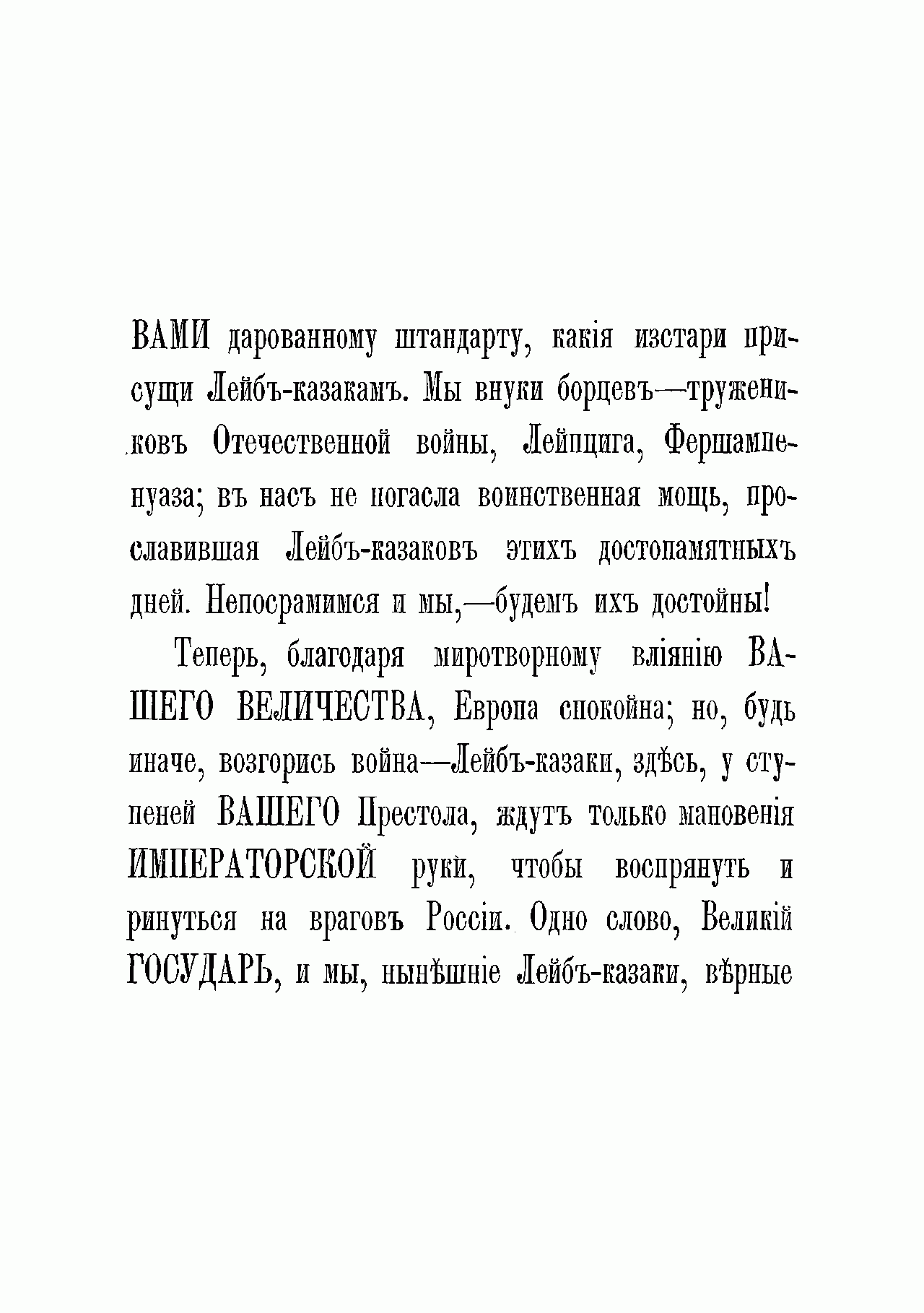 Фундаментальная история полка подготовлена его офицерами в связи с празднованием 100-летнего юбилея и 50-летием шефства над полком особы императора. Лейб-гвардии казачий полк ведет свою историю от Донской казачьей команды, присланной к императорскому двору 20 апреля 1775 г. в правление Екатерины II. Инициатива в создании этого формирования исходила от князя Г.И. Потемкина, предложившего отправить в Москву на празднование годовщины Кучюк-Кайнаджирского мира две команды знатных казаков с Дона, которые и сформировали собственный императорский конвой, с 1776 г. получивший название «Донская придворная команда». После восшествия на престол Павла I в 1796 г. придворные казачьи команды объединены с казачьим полком гатчинских Его императорского высочества наследника цесаревича войск (этот полк был учрежден в 1793 г.), переформированы в два эскадрона, и составили половину Лейб-Гусарского Казачьего полка, которому были пожалованы права и преимущества гвардии. Через два года этот полк был разделен на два полка и с 1798 г. образован Лейб-гвардии Казачий полк. В 1805 г. в составе конной гвардии полк участвовал в сражении под Аустерлицем, где отбросил кавалерию французов, оказав помощь лейб-гусарам и кавалергардам, прикрывавшим гвардейскую пехоту, а затем в составе арьергарда П.И. Багратиона до поздней ночи прикрывал отступление русской пехоты. Впоследствии полк принимал активное участие в русско-шведской войне за Финляндию и Отечественной войне 1812 г., а также в заграничных походах. Интересен тот факт, что отряд лейб-гвардейцев казаков конвоировал Наполеона на о. Эльба в 1814 г. В царствование Николая I полк участвовал в русско-турецкой войне 1828–1829 гг. и подавлении польского восстания 1830–1831 гг. В период Крымской войны полк отвечал за безопасность двора и прикрывал побережье Финского залива. Основными функциями полка в 30-х- 70-х гг. XIX столетия были в основном придворно-церемониальные.