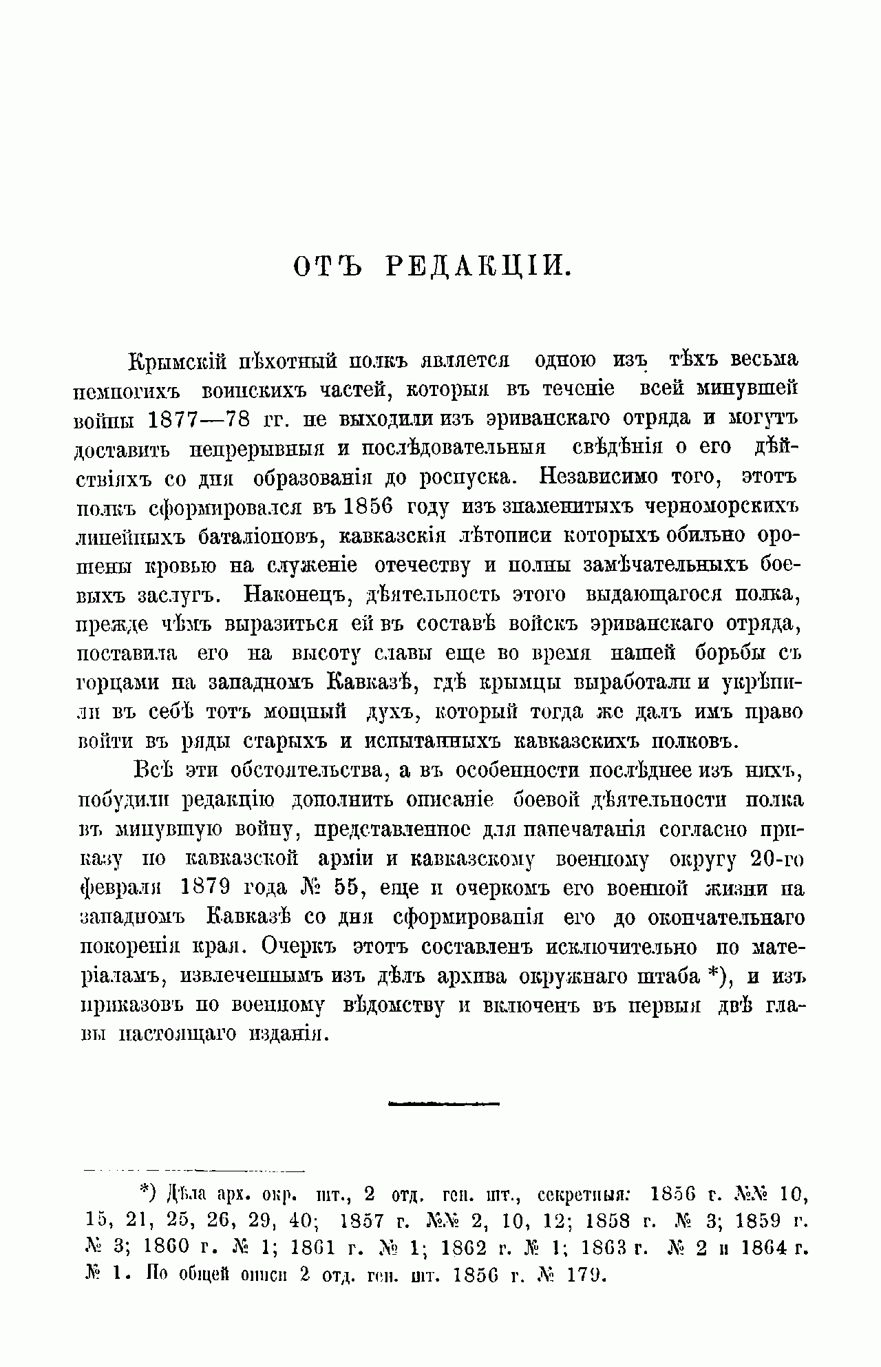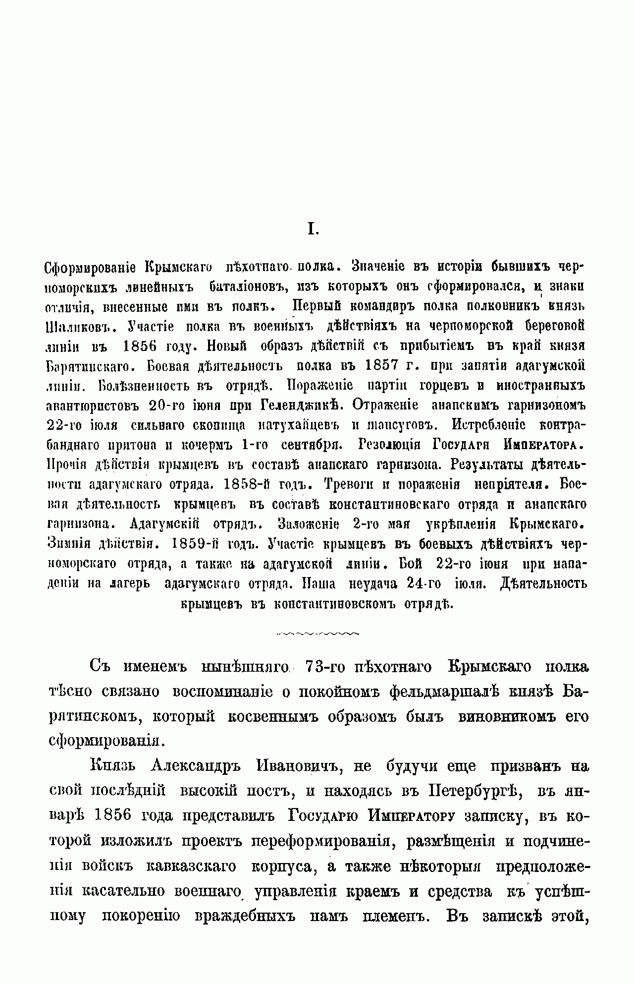 Данное издание было специально подготовлено в рамках деятельности по сбору, обработке материалов и обобщению опыта боевых действий на Кавказе, которая была поручена в 1886 г. военно-историческому отделу штаба Кавказского военного округа, возглавлявшемуся генерал-лейтенантом И.С. Чернявским. Крымский пехотный полк был сформирован на Кубани 17 апреля 1856 г. из личного состава 1, 2, 3, 4 и 5-го Черноморских линейных батальонов (Черноморской линии). Первым командиром полка 4 августа 1856 г. был назначен грузинский князь полковник И.О. Шаликов, до этого отличившийся в ходе Крымской войны. 5-й Черноморский линейный батальон, сформированный еще в 1842 г. из Нашебургского пехотного полка, в целях сохранения преемственности передал в Крымский полк Георгиевское знамя с надписью: «За оборону крепости Баязет 20 и 21 июня 1829 г.» и серебряные трубы с надписью: «Нашебургского полка 1814 г. августа 30 в воздаяние отличных подвигов против французских войск». Полк принял активное участие в борьбе с горцами на Черноморской линии. 23 апреля 1857 г. три его батальона перешли реку Кубань и в течение трёх лет участвовали в строительстве и обороне укреплений по Адагумской укреплённой линии. Следующие годы прошли для полка в многочисленных экспедициях и стычках с горцами, закончившихся овладением Западного Кавказа. Боевая служба на Кавказе была отмечена пожалованием всему полку знаков на шапки с надписью: «За отличие при покорении Западного Кавказа в 1864 г.», а 25 марта 1864 г. к названию полка был присоединён № 73 и он был переформирован по штатам в 4-батальонный состав. 1 апреля 1866 г. сын главнокомандующего Кавказской армией великий князь Александр Михайлович, был назначен шефом полка. С этого времени он получил наименование 73-го пехотного Крымского Его Императорского Высочества Великого Князя Александра Михайловича полка. Брат императора великий князь Михаил Николаевич, назначенный вместо князя Барятинского (в конце 1862 года) наместником Кавказа, был вынужден продолжать военные действия. А генерал Н.И. Евдокимов, несколько лет уже ведший войну с горцами Западного Кавказа, особенно в Закубанском крае, весной 1864 года успешно ее закончил). Перед началом русско-турецкой войны 1877–1878 гг. полк был направлен в состав Эриванского отряда. Пробыв в Эривани (Ереване) до начала военных действий, 18 апреля 1877 г. батальоны полка заняли крепость Баязет. Оставив 2 роты в Баязете, полк двинулся в Армению и участвовал 4 и 9 июня в боях при Драм-Даге и селе Даяр. Выступив затем на выручку осажденного Баязета, крымцы после упорного сражения 28 июня 1877 г. с 13-тысячным турецким корпусом освободили гарнизон крепости. Охраняя границу Эриванской губернии от вторжения турок, они участвовали 23 и 28 октября во взятии укреплённой позиции у Деве-Бойну и неудачном штурме крепости Эрзерум. За мужество, проявленное полком в ходе русско-турецкой войны, ему был пожалован 13 октября 1878 г. «поход за военное отличие» и добавлена надпись на Георгиевское знамя: «За дела 4 и 9 июня и освобождение Баязета 28 июня 1877 г.». 7 и 8-я роты, входившие в состав гарнизона Баязета во время 23-дневной осады, были награждены Георгиевскими рожками с надписью: «За геройскую защиту Баязета с 6–28 июня 1877 г.». В 1880–1881 гг. 9 и 10-я роты приняли участие в Ахал-Текинской экспедиции генерала М.Д. Скобелева и за штурм Геок-Тепе были награждены 9 июня 1882 г. з