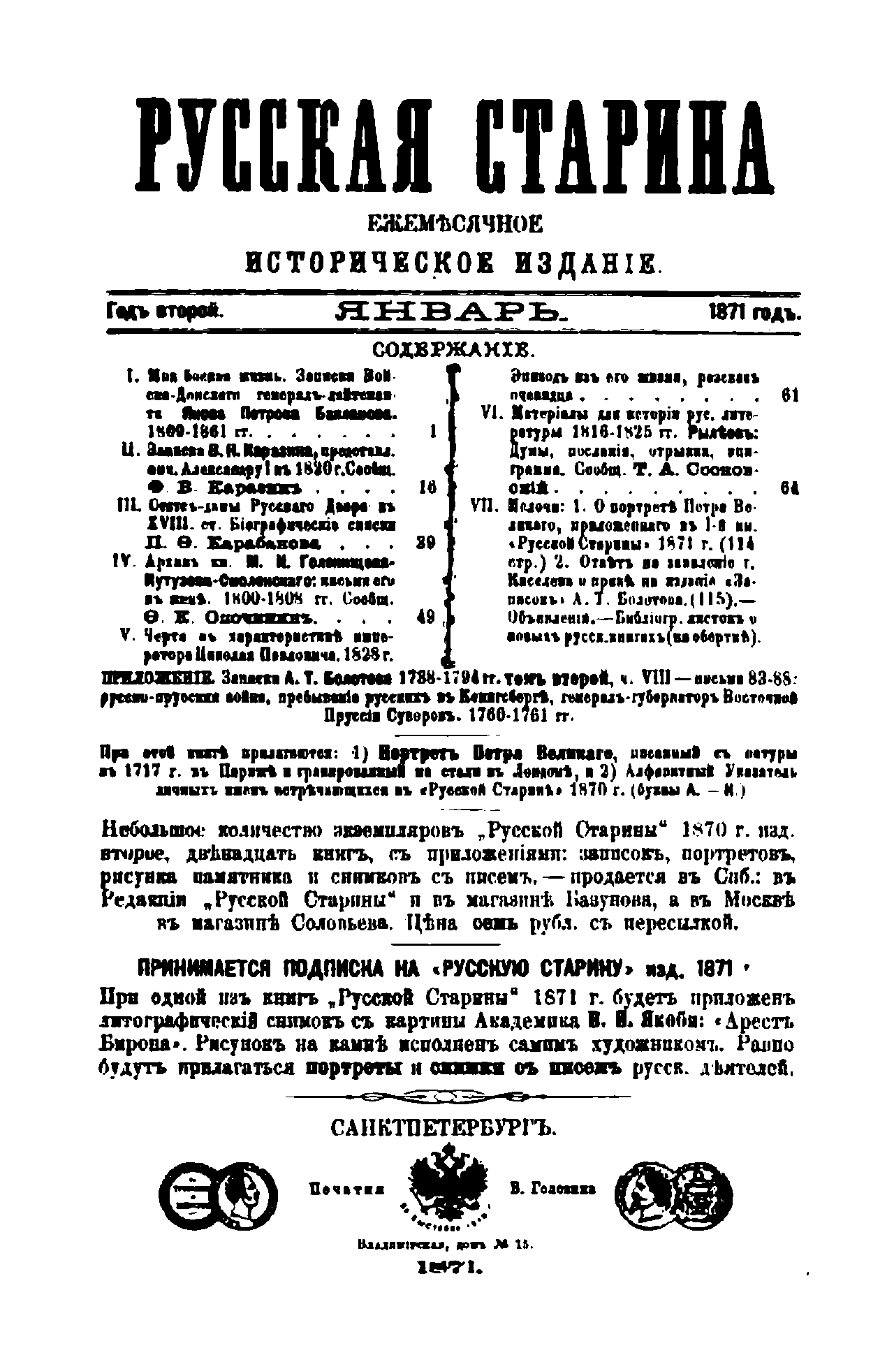 Русская старина. Томъ III. 1871. Выпуски 1-6
