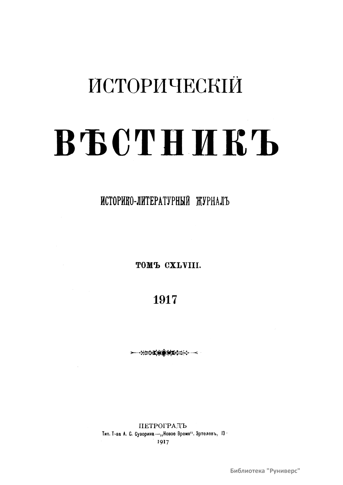 Исторический вестник. Историко-литературный журнал. Том CXLVIII