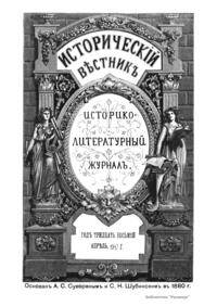 «Исторический вестник» - русский ежемесячный историко-литературный журнал. Издавался в Санкт-Петербурге с 1880-го по 1917 г. Журнал был основан А.С. Сувориным и С.Н. Шубинским с целью «знакомить читателей в живой, общедоступной форме с современным состоянием исторической науки и литературы в России и Европе». Вышло 150 тт. Каждый том состоял из трёх ежемесячных выпусков, имел свою нумерацию страниц, оглавление, список иллюстраций. Журнал приобрёл устойчивую популярность среди читателей, заняв прочное место в «триумвирате» русских исторических журналов наряду с «Русским архивом» и «Русской стариной». опережая их по количеству подписчиков. Отличием «Исторического вестника» было то, что он не помещал на своих страницах необработанных, сырых материалов. С другой стороны, журнал приближался по своему типу к журналам общелитературного образца, сочетая в себе коммерческий успех и доступное изложение материала.