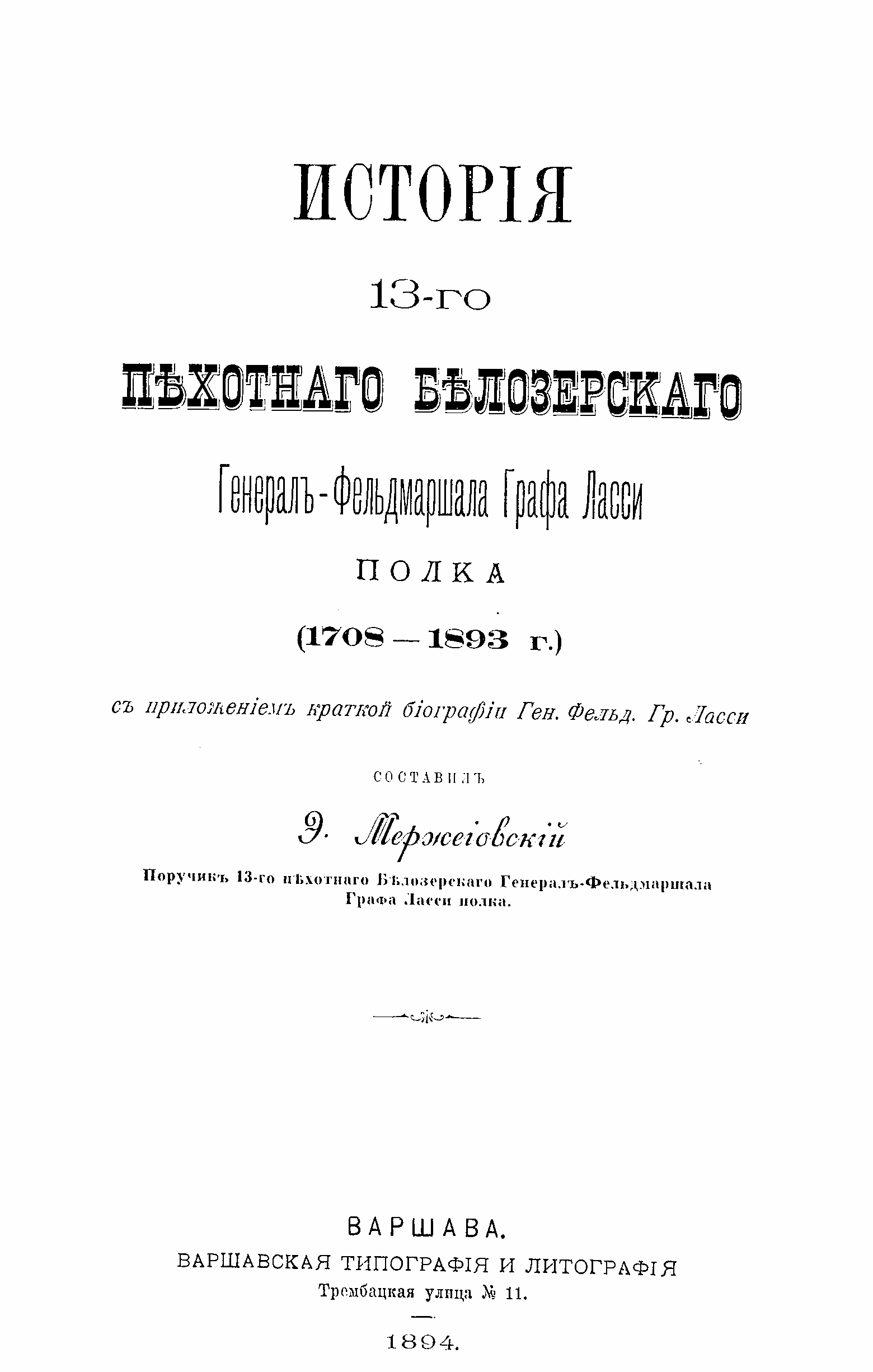 Исторiя 13-го пѣхотнаго Бѣлозерскаго Генерал-Фельдмаршала Графа Ласси полка (1708-1893г.)