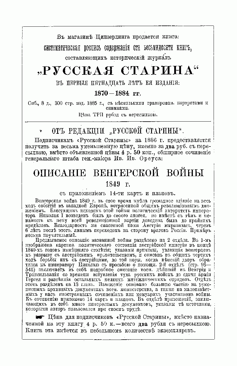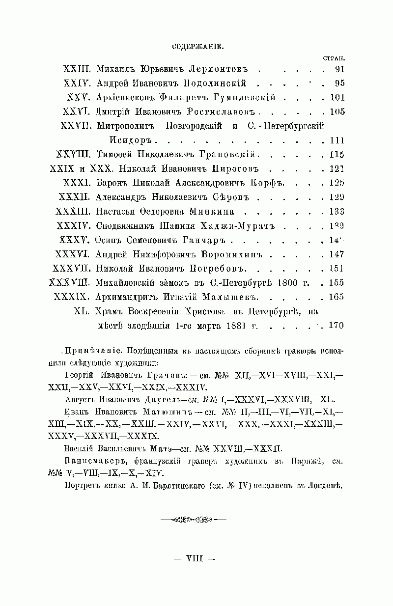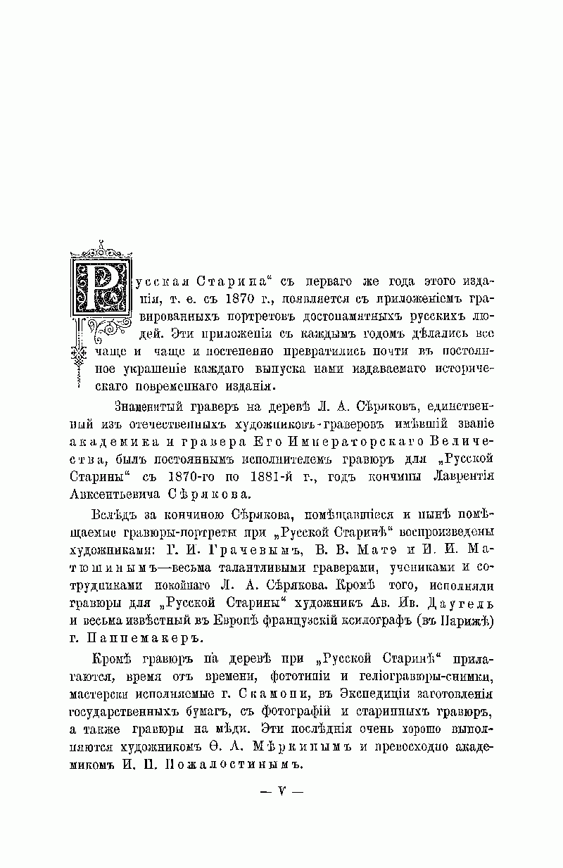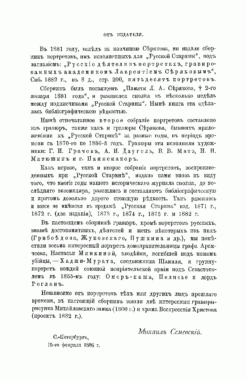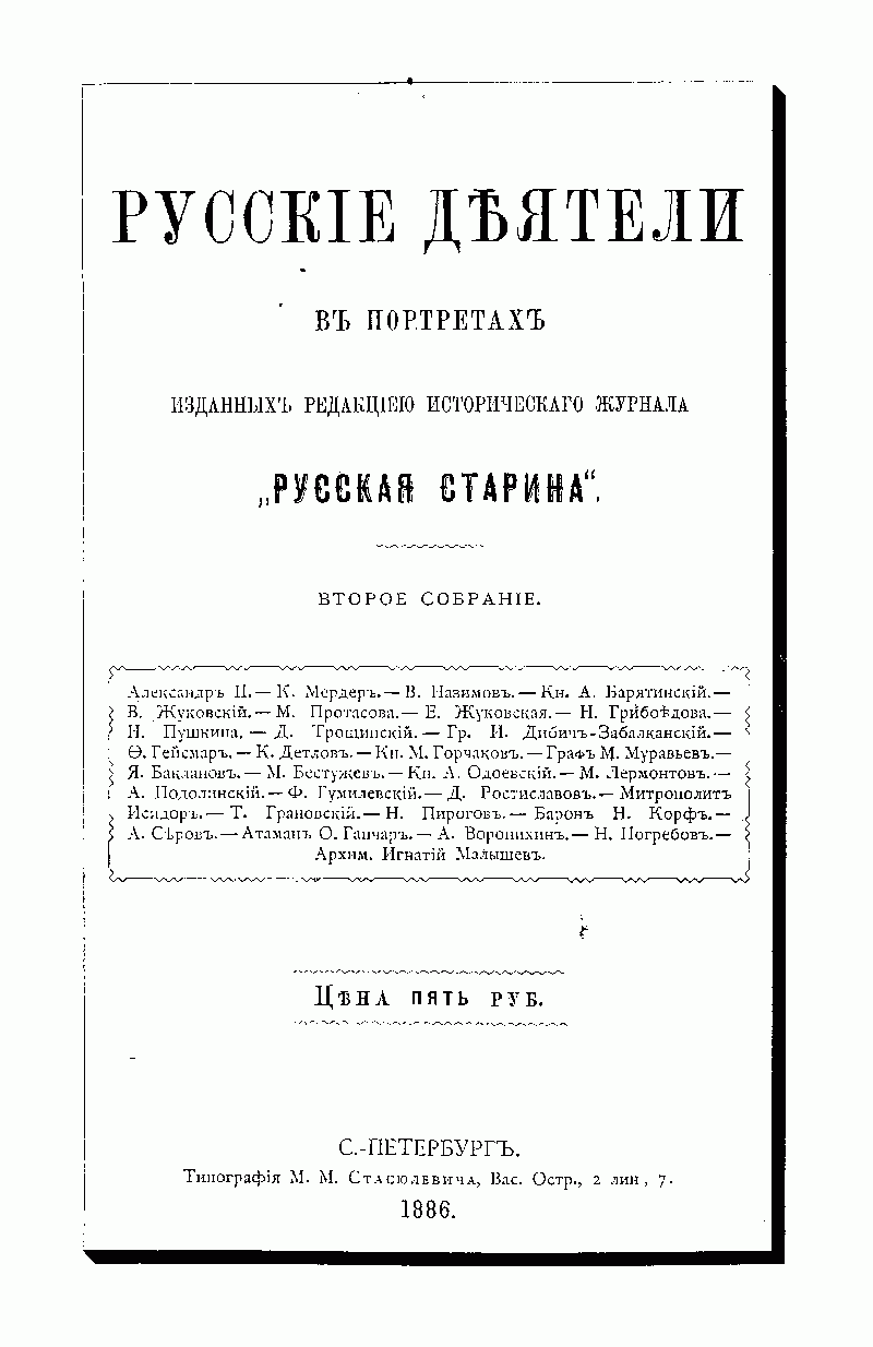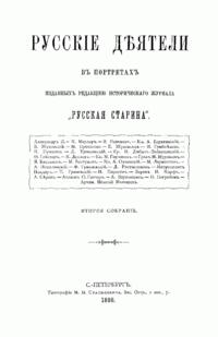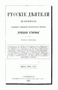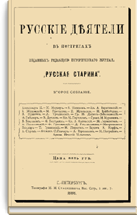 В 1882 г . коллектив исторического журнала «Русская старина», издававшегося в Санкт-Петербурге Михаилом Семевским, впервые соединил в отдельный сборник некоторые из портретов выдающихся русских деятелей, выгравированных знаменитыми русскими граверами. Издание имело большой успех у читателей и было переиздано в 1886 г. Портреты сопровождаются биографическими очерками, составленными, по большей части, по материалам «Русской Старины». Все биографии составлены полно и обстоятельно. Сборник повествует о высокопоставленных особах, историках, священнослужителях, писателях, генералах, композиторах, певцах – блестящих представителях своей эпохи от святого князя Владимира до Муравьева-Апостола и Бестужева. Биографические заметки и очерки, сопровождающие портреты третьего издания, были составлены постоянной (с 1874 г.) сотрудницей «Русской старины» В. В. Тимощук.