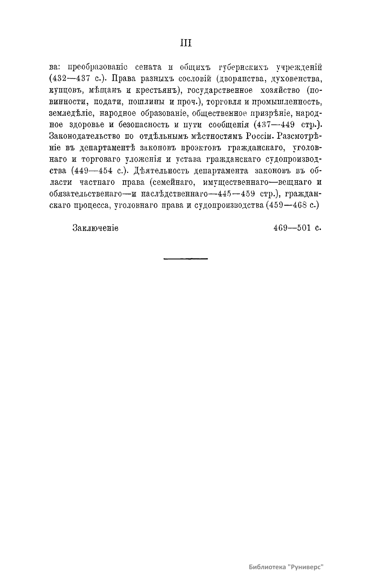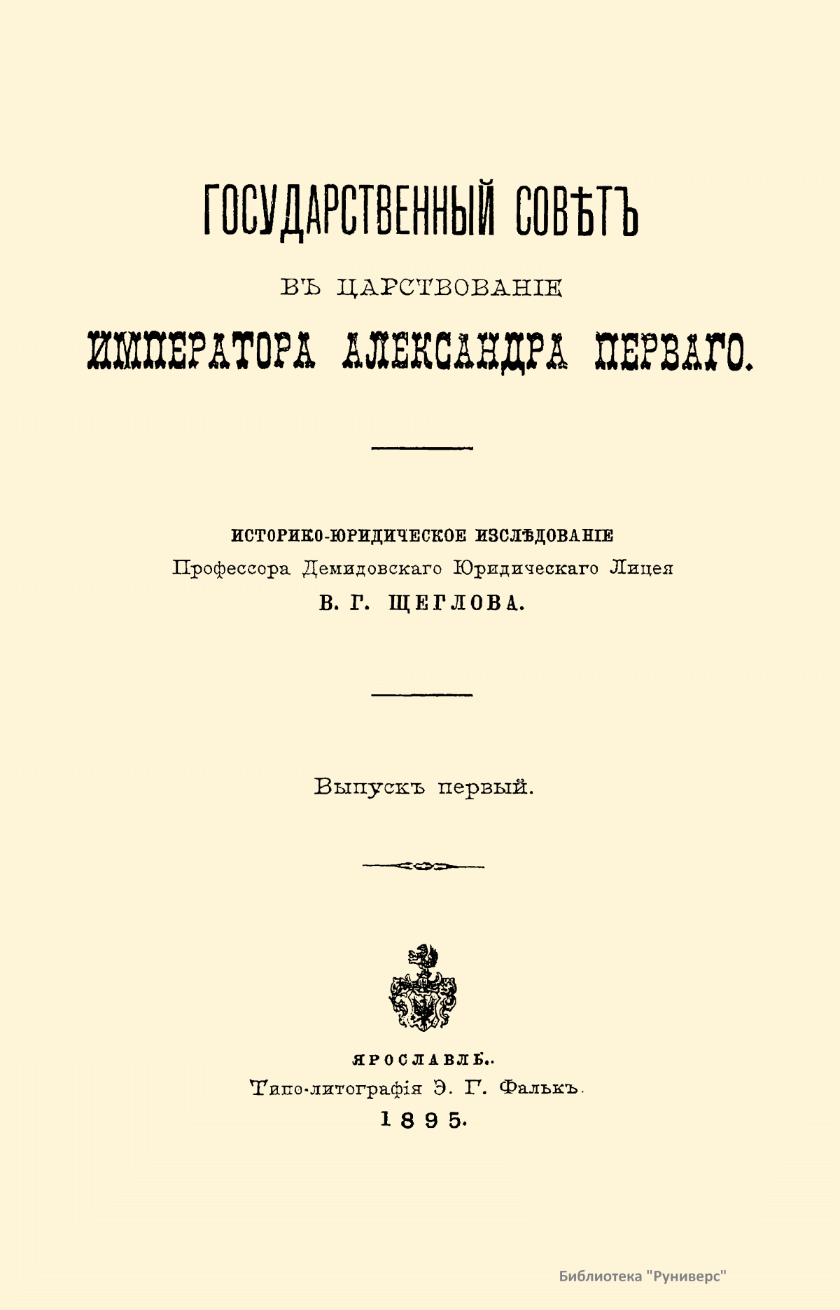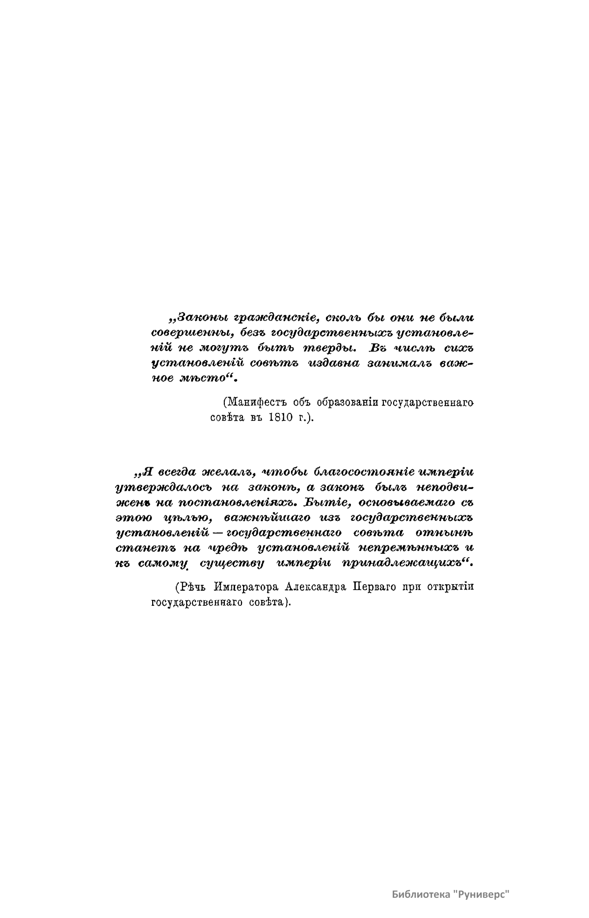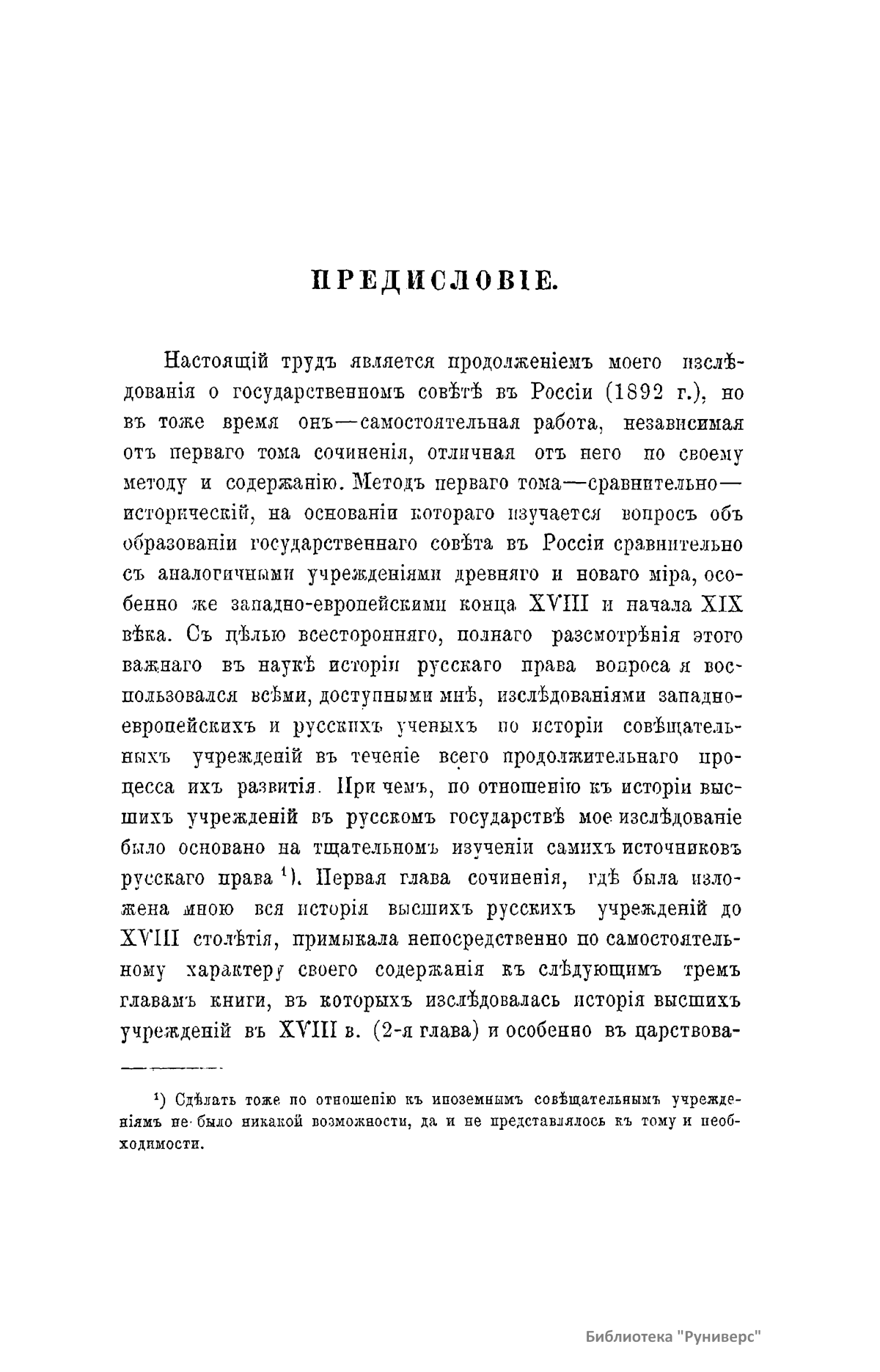 Главная цель первого тома настоящего труда – изучить процесс образования совещательных учреждений в России, важнейшим и заключительным моментом которого является организация Государственного Совета при Александре I. В своем исследовании автор пользуется сравнительно-историческим методом. После введения, в котором рассматривается история иноземных совещательных учреждений, в первой главе сочинения исследуются возникновение и взаимные отношения монархической власти и высшего сословия в Московской Руси: от характера этих отношений зависит политическая роль совещательных учреждений в удельно-вечевую эпоху, московском и императорском периоде русской истории. Вместе с тем автор пытается указать здесь и в последующих главах на отделение высшего управления от местного, образование первого, разделение главных функций власти и взаимные отношения между учреждениями различных названий московского (боярской думой и приказами) и императорского периода (советами, кабинетами, сенатом и др.). При изучении образования Совета при Александре I автор останавливается на характеристике общественного состояния этой эпохи, личности государя и его ближайших сотрудников по преобразованию всего русского управления, учреждении Непременного Совета и его отношении к вновь возникшим в то же время министерствам, комитету министров и к сенату. Еще подробнее исследуется образование Государственного Совета в 1810-1825 годах. Здесь предварительно приводятся главные основания «Государственного Уложения» графа Сперанского. Затем идет изложение самого учреждения Совета и рассмотрение отношения последнего к комитету министров, сенату и министерствам. Первый том заканчивается главой, где русский Государственный совет сравнивается с аналогичными западноевропейскими учреждениями древнего и особенно нового времени.
