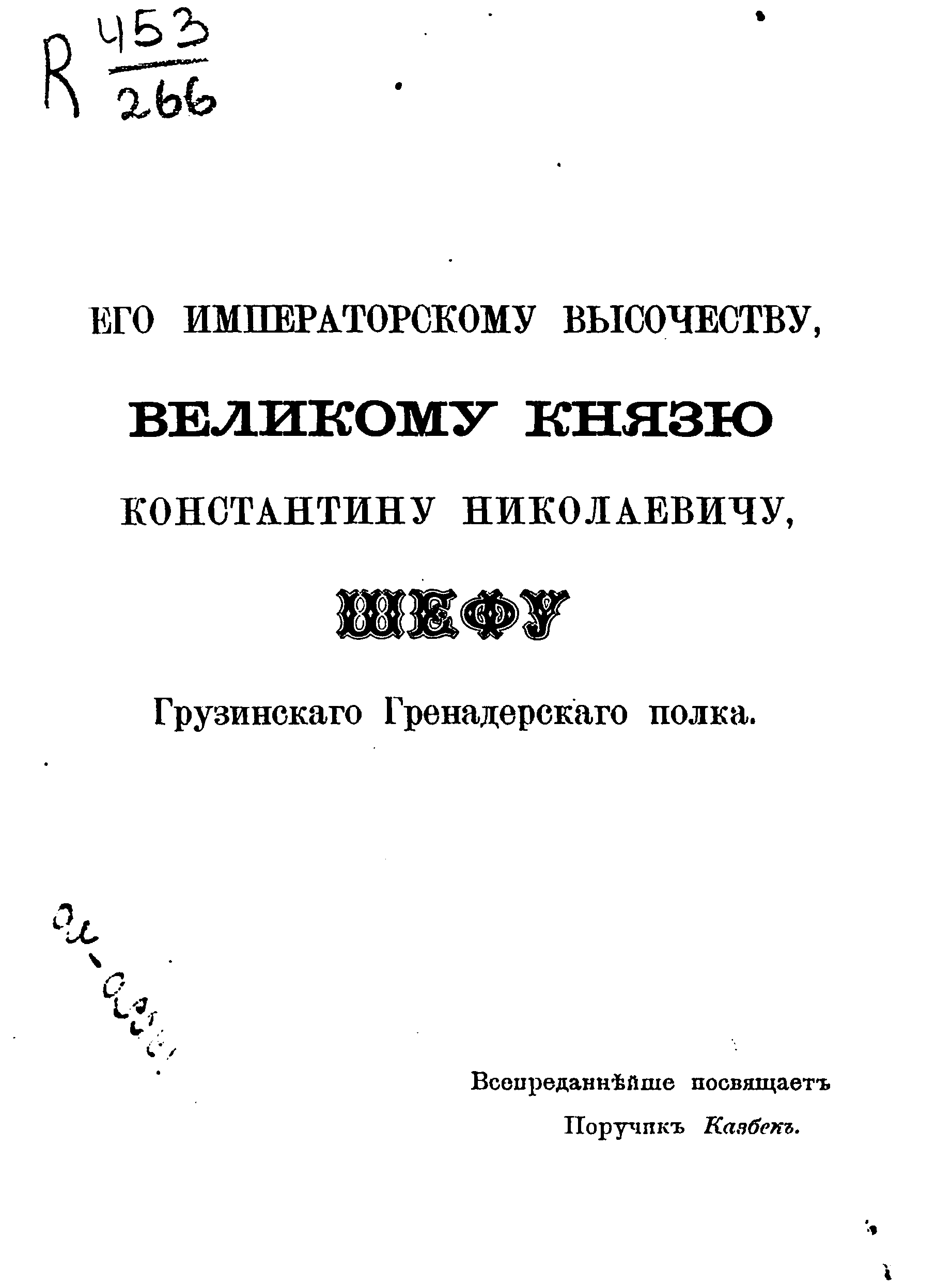 В 1861 г. генерал-майор граф Сумароков-Эльстон, с разрешения начальника Главного штаба Кавказской армии, поручил тогда поручику Казбеку Г. Н. составить предлагаемую книгу. Автор, понимая «великое значение покорения Кавказа для России», описывает боевые действия полка и знаменательные исторические события, связанные с ним, в период 1801–1864 гг. Казбек Георгий Николаевич – генерал от инфантерии, участник русско-турецкой войны 1877–1878 гг. Написал и издал следующие книги: Военная история Грузинского гренадерского Его Императорского Высочества Великого Князя Константина Николаевича полка, в связи с историей Кавказской войны. Тифлис, 1865. Куринцы в Чечне и Дагестане. 1834–1861 гг. Очерк истории 79-го пехотного Куринского Его Императорского Высочества Великого Князя Павла Александровича полка. Тифлис, 1885. Военно-статистическое описание Терской области. Ч. 1–2. Тифлис, 1888. Военно-статистический и стратегический очерки Лазистанского Санджака. Тифлис, 1902. Служба войск при атаке и обороне крепостей. 1) Схематическое изображение хода атаки и обороны современных крепостей (черт.) и 2) Оборонительные средства Австро-Венгрии и Германии (1902). Варшава. 1902.